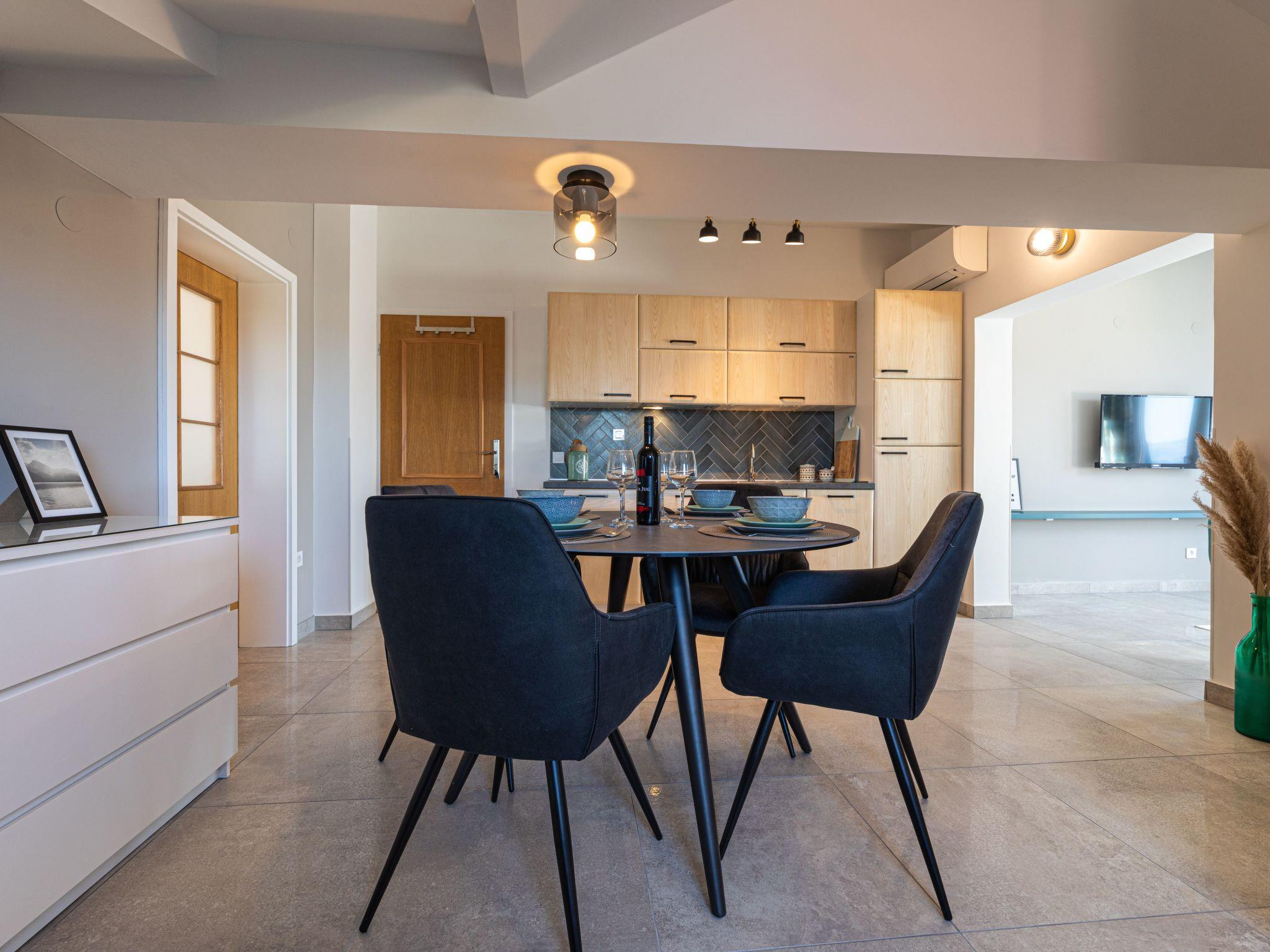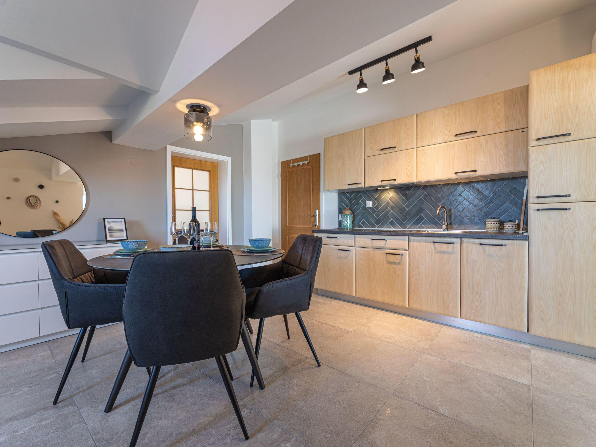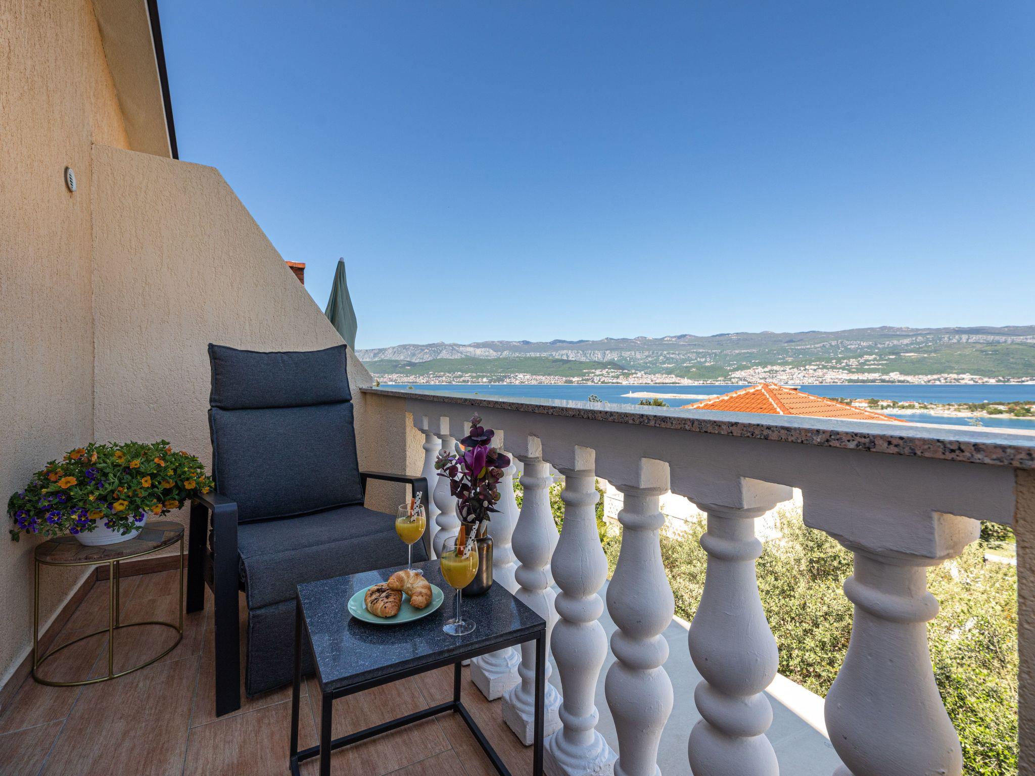 In the apartment you will find a dining room with a well equipped kitchen, an additional bed for 1 to 2 people (160x200), a bedroom with a double bed, a living room and a bathroom with a shower. The apartment also has a balcony with seating and a beautiful view of the sea. In the garden on the ground floor there is a shared sunbathing area with deckchairs and a beautiful heated swimming pool.Air conditioning, satellite TV, Wi-Fi internet and barbecue are also available. You can reach the nearest beach in a 5 - 10 minutes (approx. 600m).