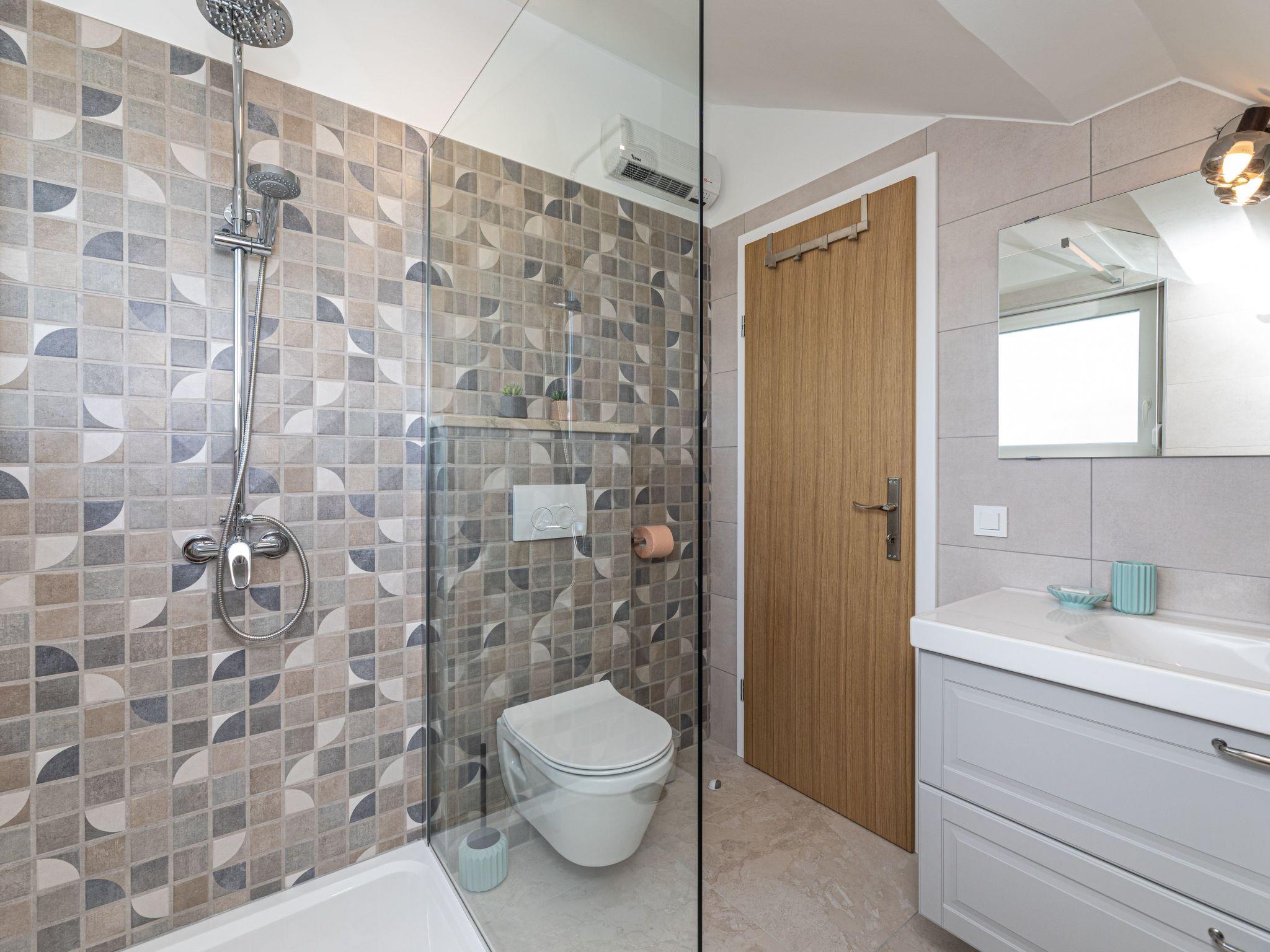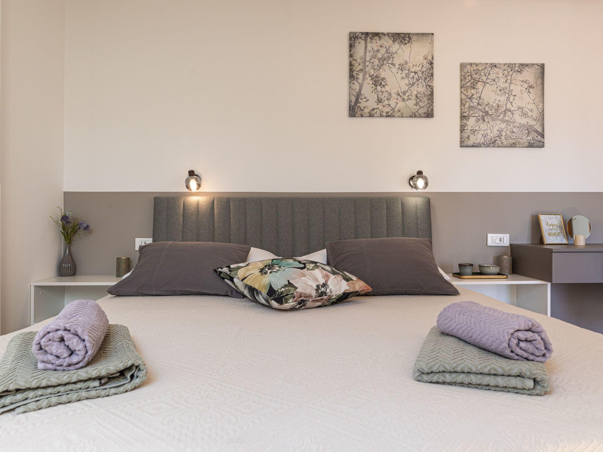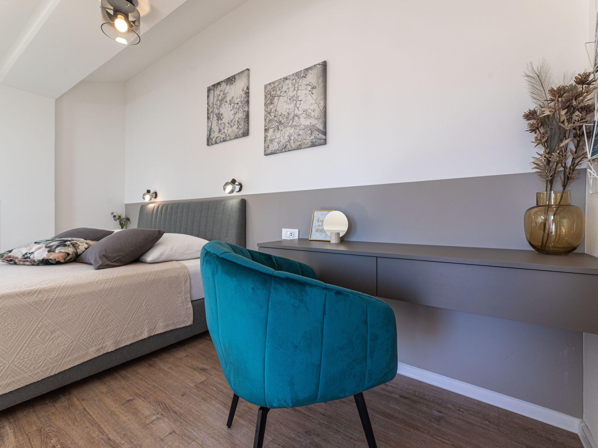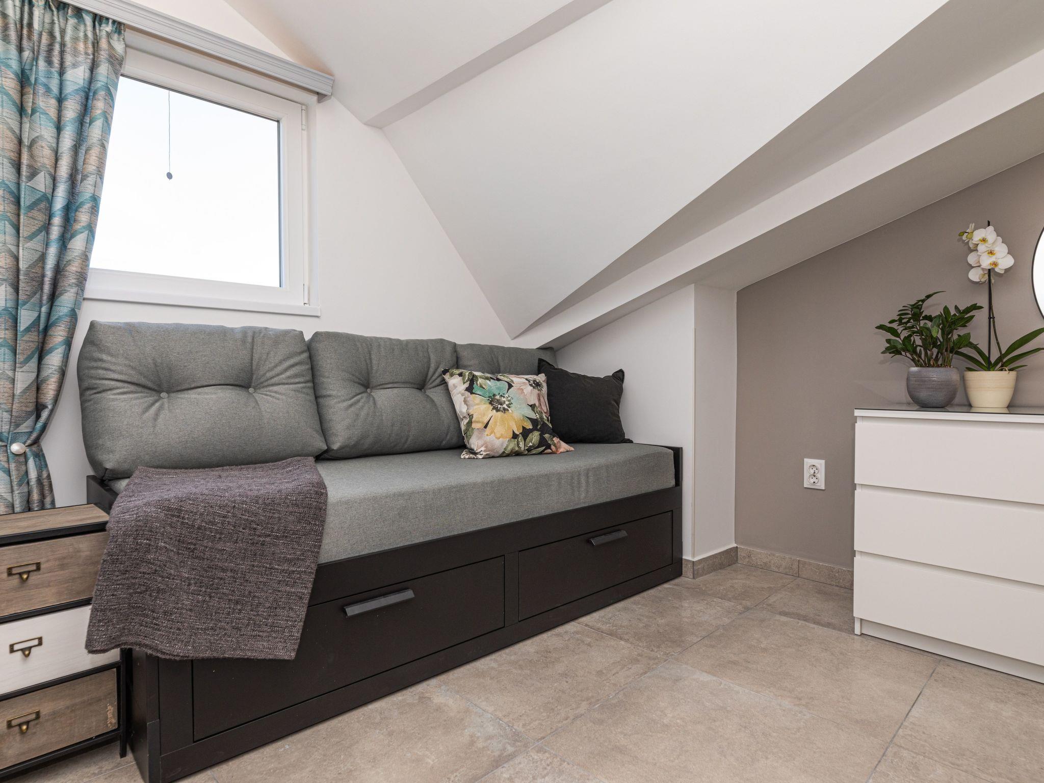 In the apartment you will find a dining room with a well equipped kitchen, an additional bed for 1 to 2 people (160x200), a bedroom with a double bed, a living room and a bathroom with a shower. The apartment also has a balcony with seating and a beautiful view of the sea. In the garden on the ground floor there is a shared sunbathing area with deckchairs and a beautiful heated swimming pool.Air conditioning, satellite TV, Wi-Fi internet and barbecue are also available. You can reach the nearest beach in a 5 - 10 minutes (approx. 600m).