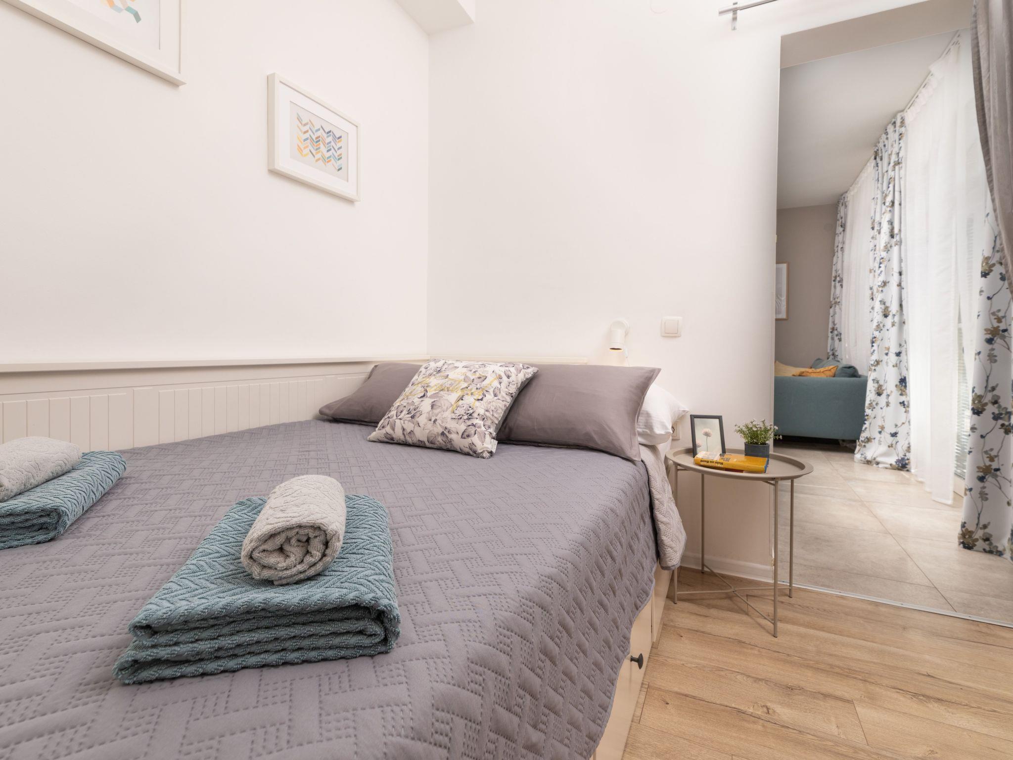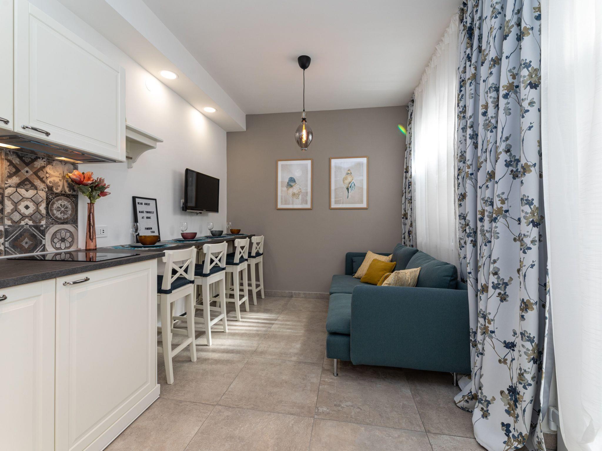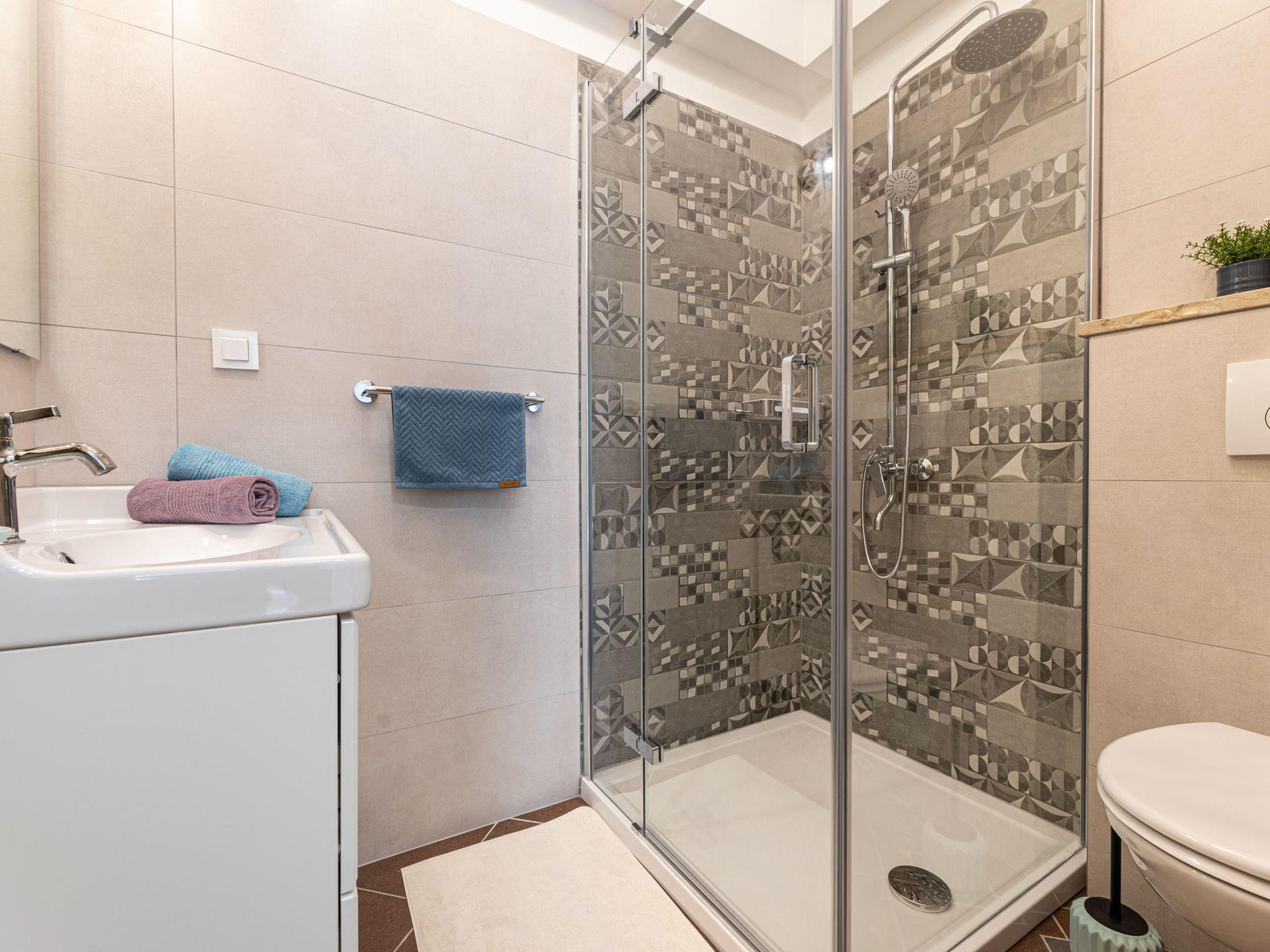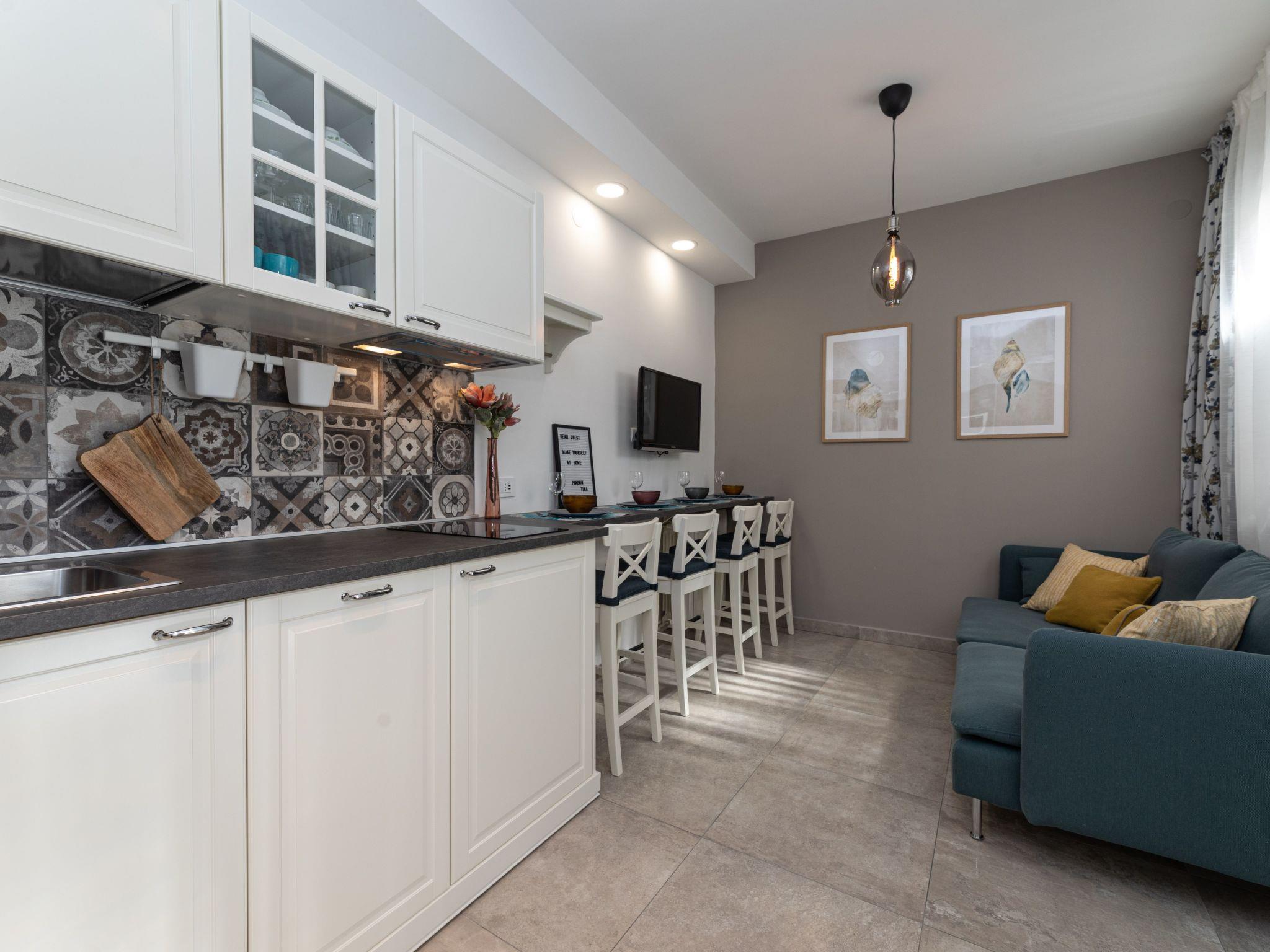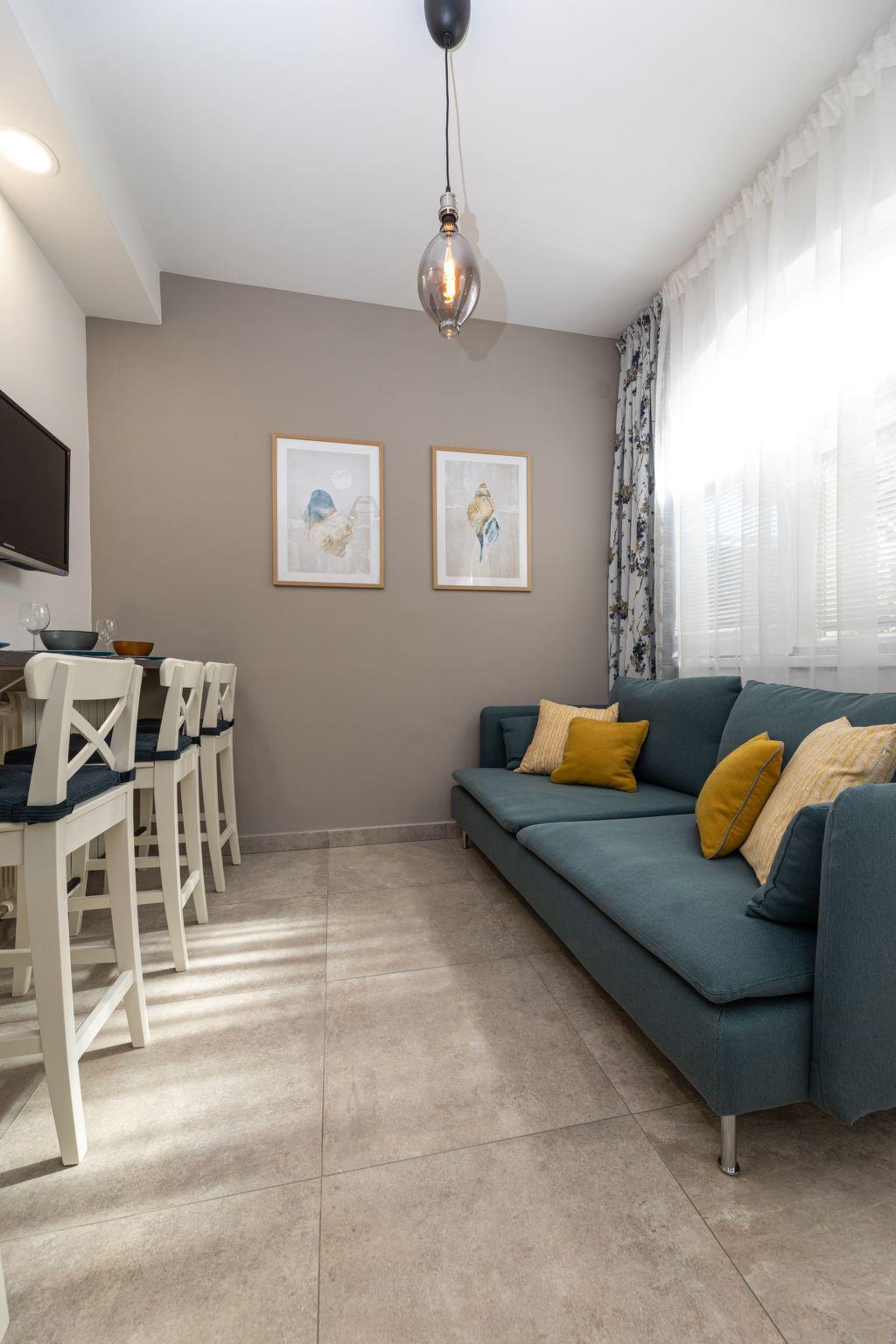 In the apartment you will find a living/ dining area with a well equipped kitchen, a bedroom with a double bed and entrance hall with a bed 120x200 for 1-2 small children and bathroom with a shower. The apartment also has a large enclosed terrace with seating and a deckchairs. In the garden on the ground floor there is a shared sunbathing area with deckchairs and a beautiful heated swimming pool.Air conditioning, satellite TV, Wi-Fi internet and barbecue are also available. You can reach the nearest beach in a 5 - 10 minutes (approx. 600 m).