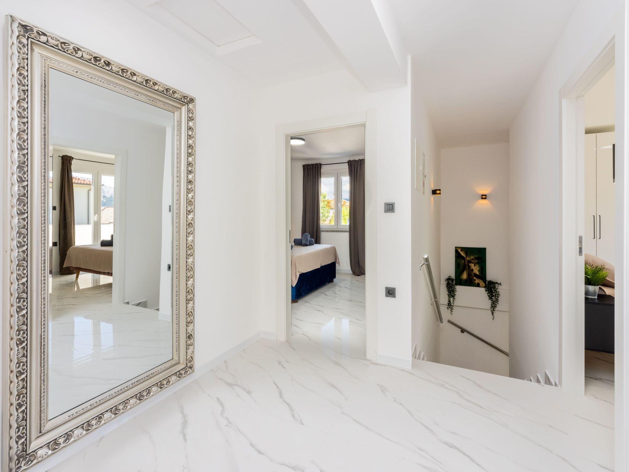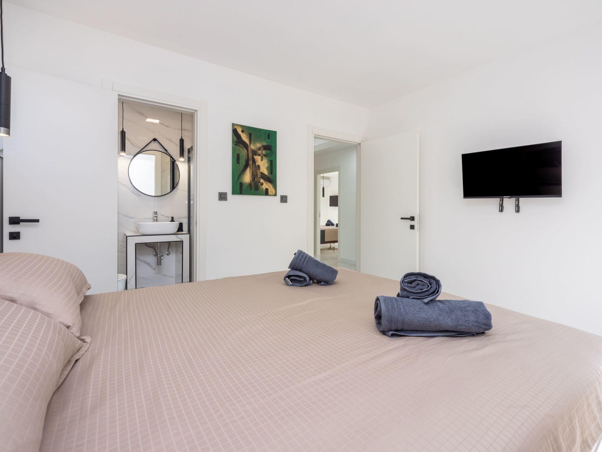 The interior of the villa is thoughtfully designed to cater to your every need, featuring four elegantly arranged bedrooms, each accompanied by its own modern bathroom, ensuring privacy and comfort for all guests. The villa comes fully equipped with top-tier amenities, including a dishwasher and a washing machine, exclusively for your use. Air conditioning is available throughout the house, providing a cool respite from the warm seaside climate. The kitchen is fully fitted with a filter coffee machine, dishwasher, and electric kettle, making home dining both convenient and enjoyable.