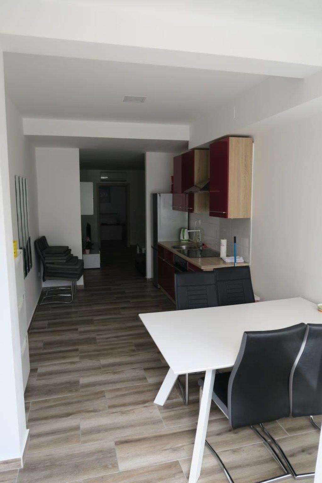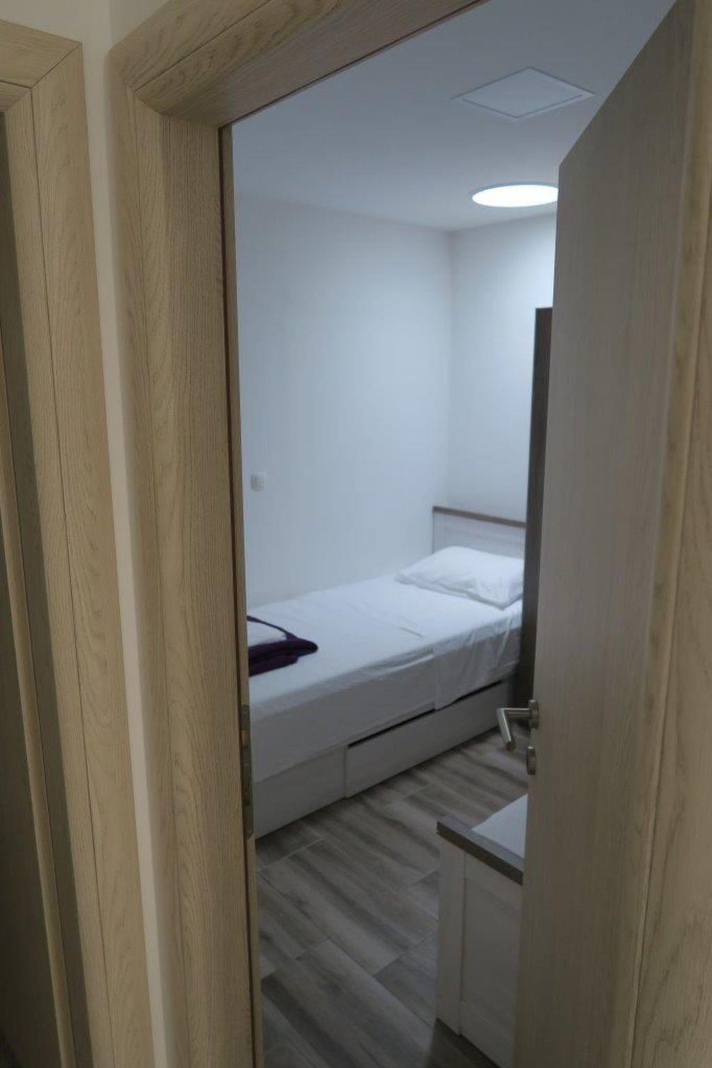 The twoo bed apartment provides 65m² of living space. The apartment has an open kitchen, fully-equipped with a stove, oven, fridge, microwave, dishwasher and kettle. It has a nice big table with 6 chairs, where you can enjoy meals. The kitchen has an adjoining living room with a flatscreen TV, stereo system and double sofa bed. The sofa measures 90 x 200cm and 180 x 200cm when pulled out. The apartment also has a