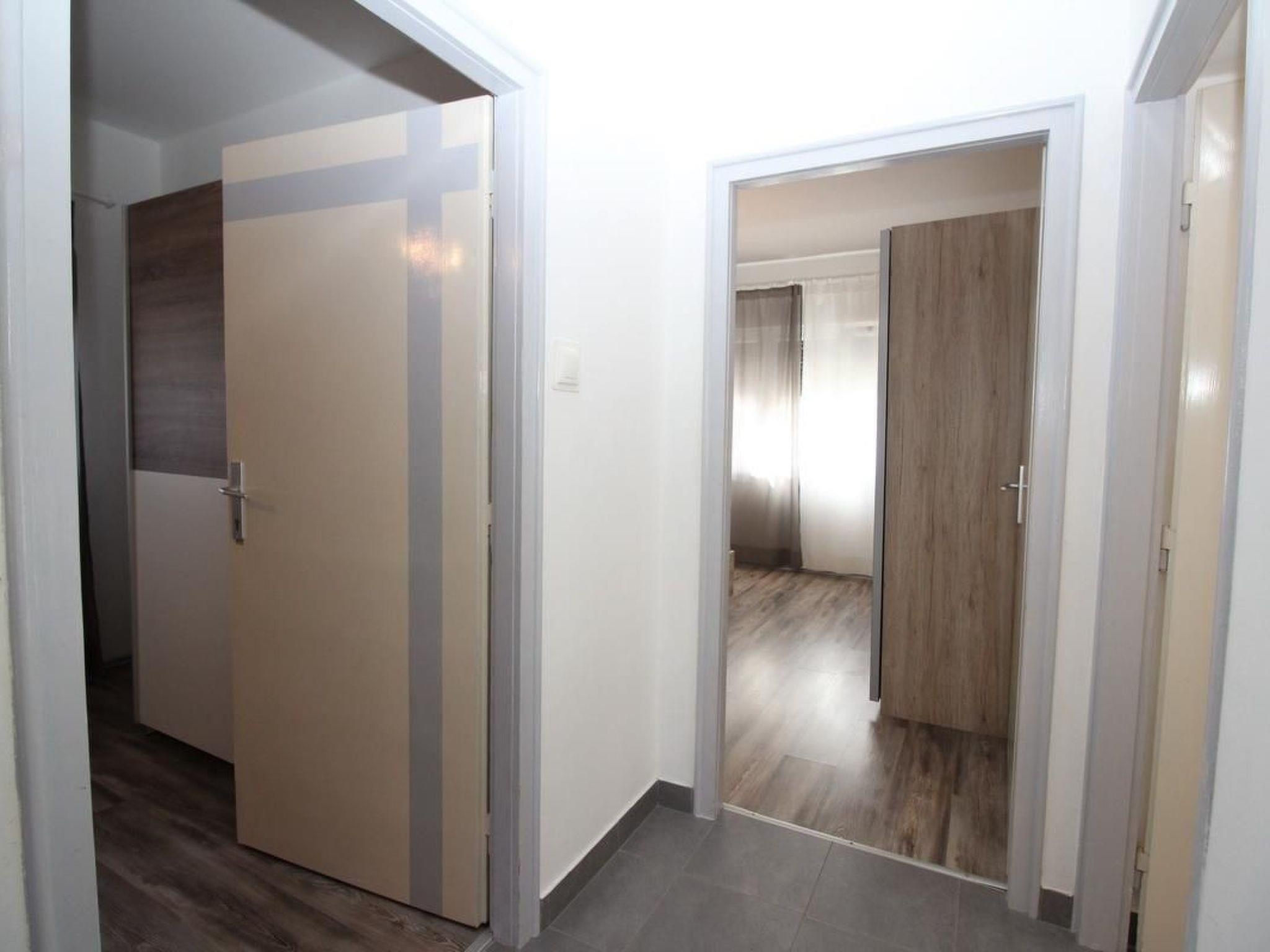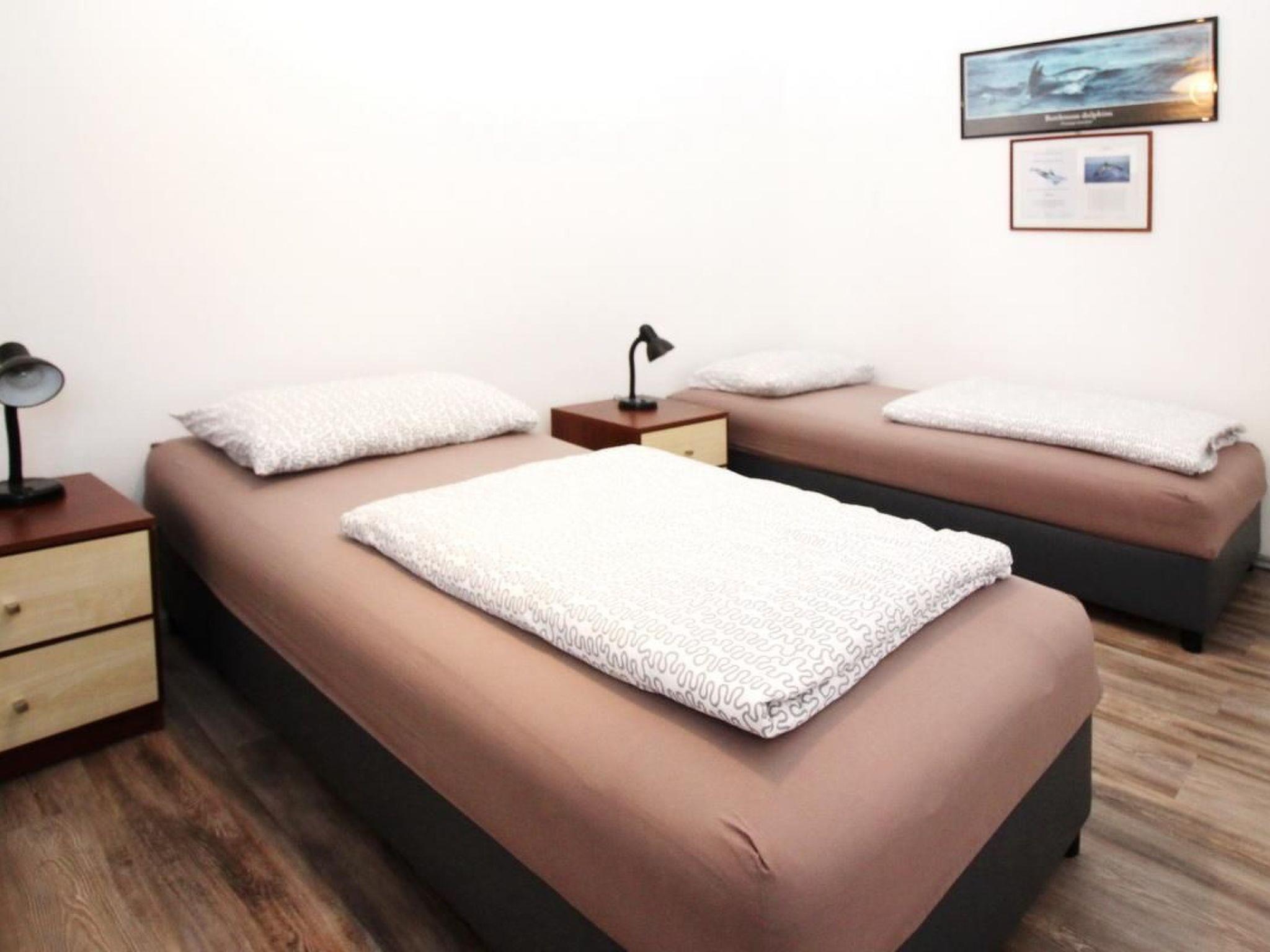 House MIHAELA - close to the beach and the centre, air-conditioned with own parking and free Wi-Fi Number of persons: 4-5 Places: 65 m2 (ground floor) Terrace : own terrace, tables and chairs for the terrace are available, surface approx. 6 sqm. Info: Satellite TV, bed linen is provided once a week, towels available (1 large, 1 small / per person and week), use of air conditioning is included in the price of the accommodation. Pets are not allowed. Flat facilities: Bedroom no.1 : double room , double bed , parquet Bedroom no.2 : double room , separate beds , parquet Living area : living room, dining room and kitchen are one unit ; dining table and seating for all persons ; an additional sleeping possibility on a sofa bed ; with terrace ; laminate ; tiled floor Kitchen : kitchenette, dishes, cooking pots, cutlery, etc. are available, dish towels available, electric cooker, number of hotplates: 2, refrigerator without freezer compartment, coffee machine Bathroom : bathroom with WC, with shower