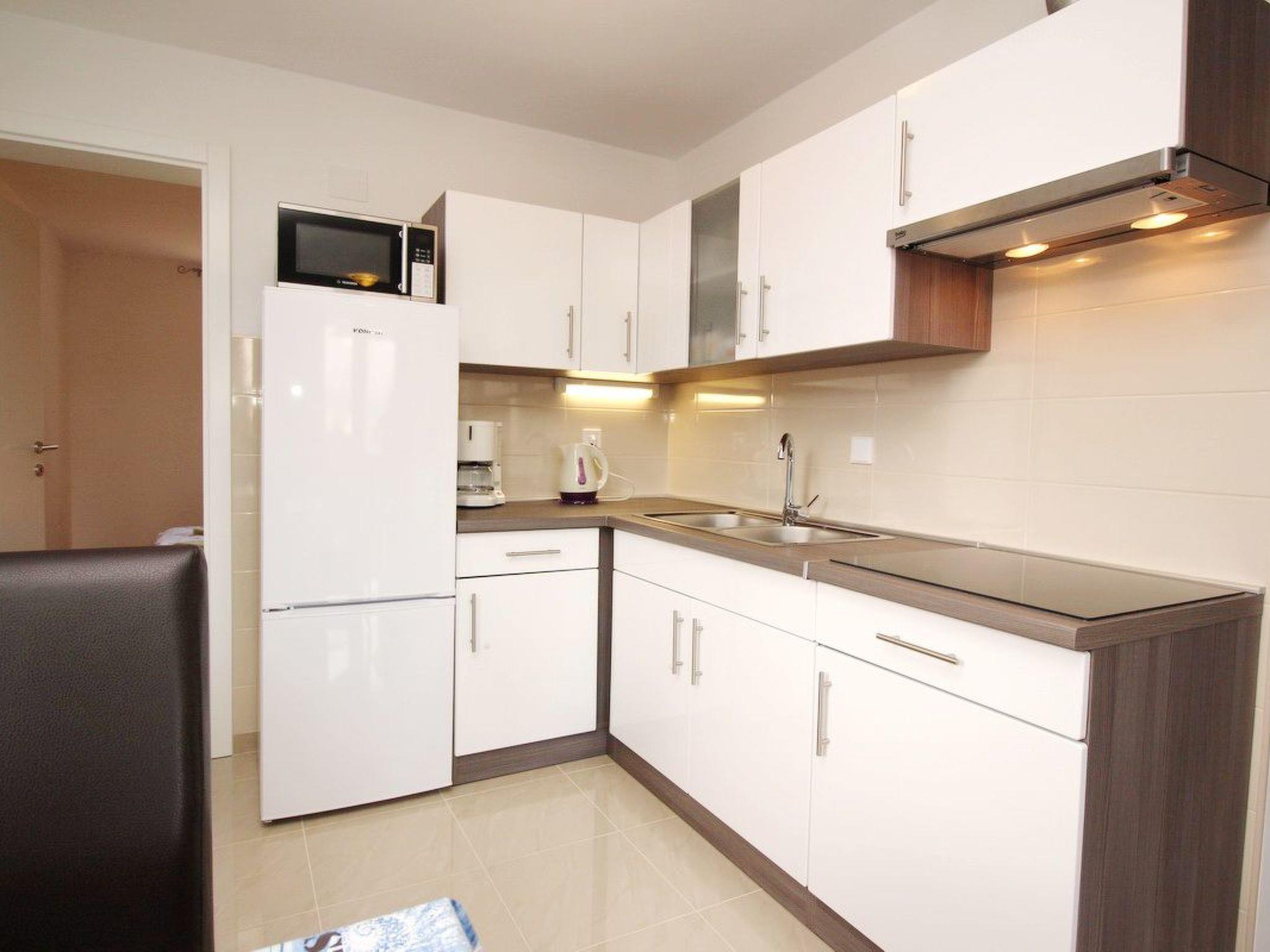 Kitchen : Kitchenette; Dining table and seating for all persons; Crockery, cooking pots, cutlery, etc. available; Tea towels available; Electric cooker; No. of hotplates: 4; Refrigerator with freezer compartment; Coffee machine; Microwave; Kettle
