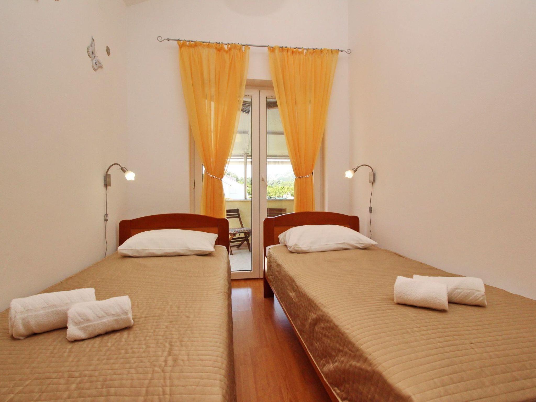 No. of persons: 4-5 Surface : 50 m2 (1st floor) Equipment holiday flat: Bedroom No.1 : double room , laminate , french bed Bedroom No.2 double room , separate beds , laminate living area : living room, dining room and kitchen are one unit; dining table and seating for all persons; an additional sleeping possibility on a sofa bed; with balcony; tiled kitchen : kitchenette, dishes, cooking pots, cutlery etc. are available, dish towels available, electric cooker, number of hotplates: 2, fridge with freezer compartment, coffee machine bathroom : bathroom with toilet, with shower Special features of the accommodation unit : air conditioning, air conditioning included in price: Anzahl 1, Sat-TV, Bed linen provided in weekly change, Towels available (2 small/person and week), One pet allowed (up to 45 cm shoulder height), The prices include the following additional costs: Change of bed linen (weekly), final cleaning as well as the consumption of electricity, gas and water, free Wi-Fi Balcony : private balcony, covered, balcony with sea view, table and chairs for the balcony are available, Area of the balcony: 15sqm Outdoor area : free car park