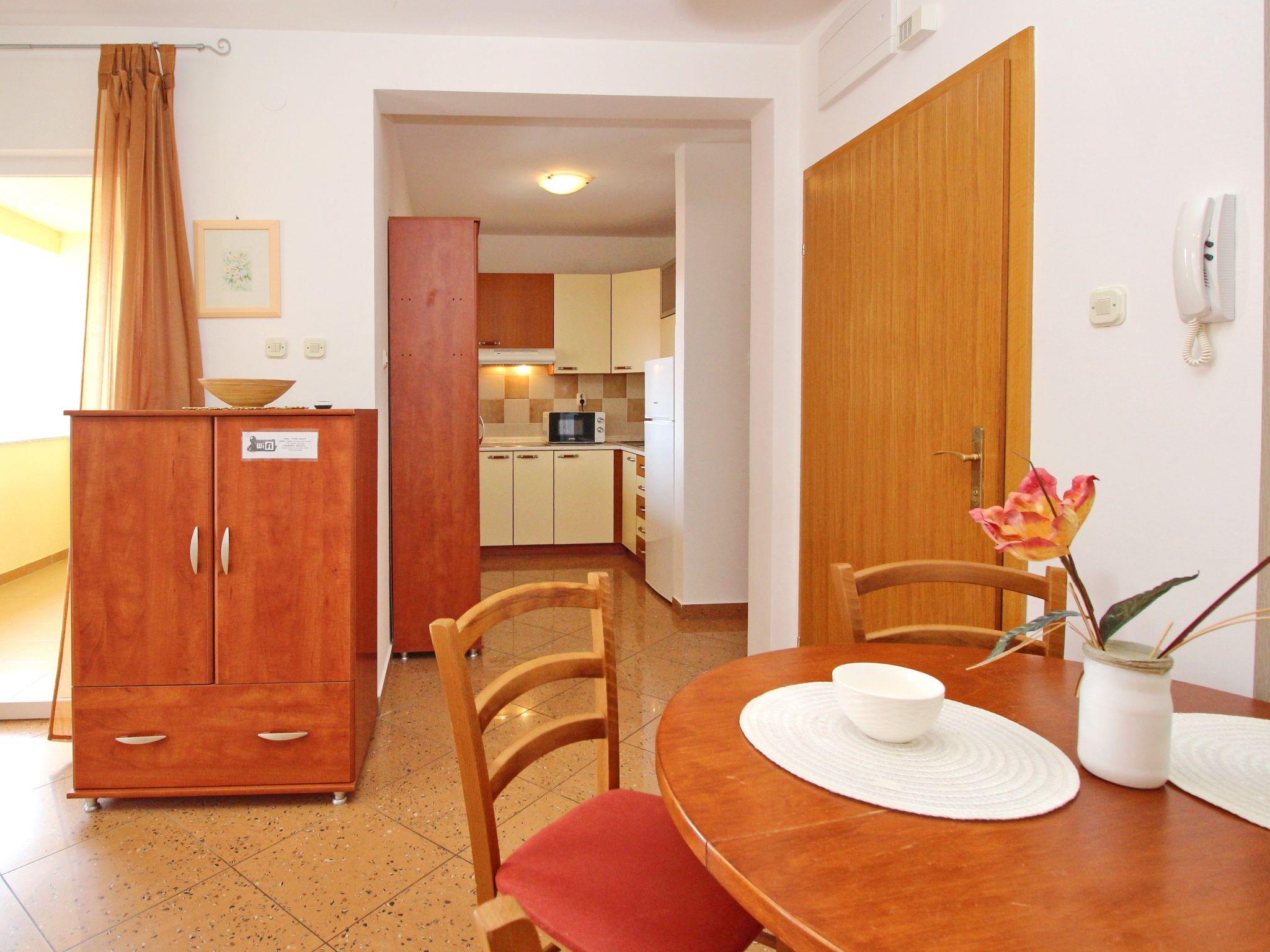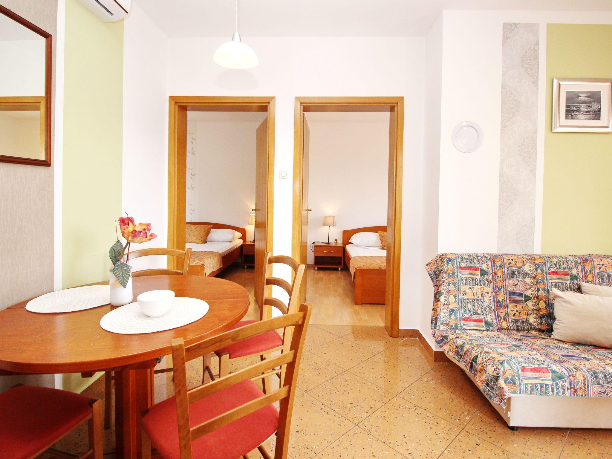 Living area : Living room, dining room and kitchen are one unit; dining table and seating for all persons; one additional sleeping possibility on a sofa bed; with balcony; tiled