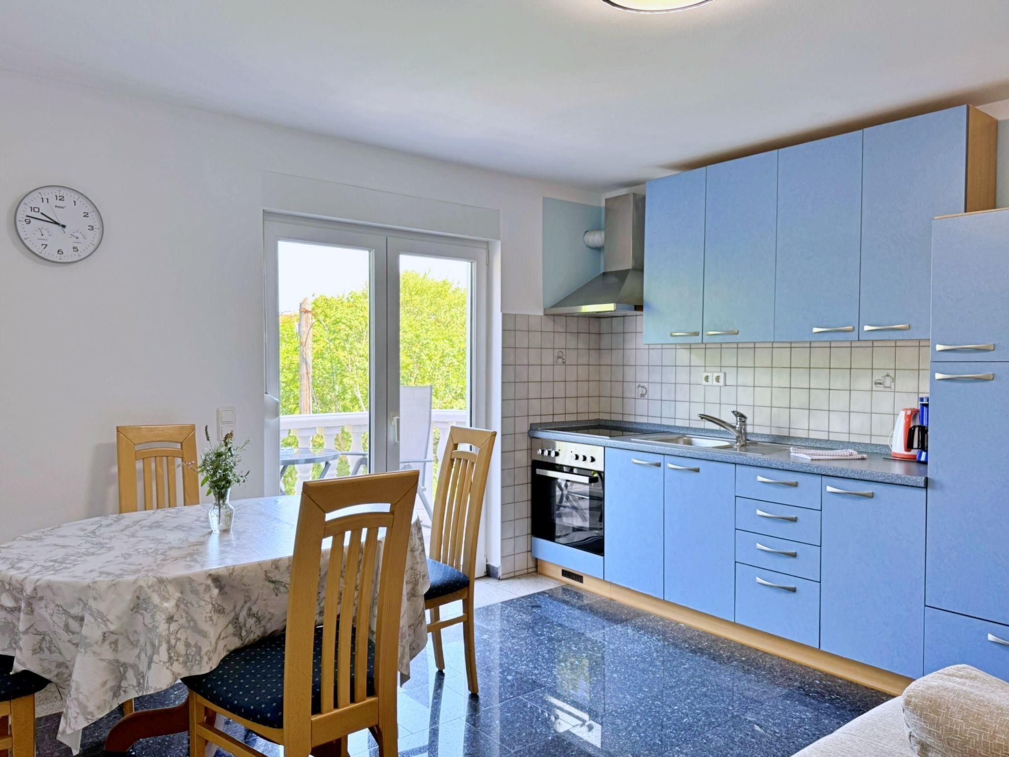 This first-floor apartment, located just 250 m from the sea, features a cozy 3 m2 balcony. The kitchen is equipped with an electric stove, oven, fridge with freezer compartment, coffee machine, kettle, and toaster. The air-conditioned living room offers a dining table, a seating area with a pull-out couch for two, cable/satellite TV, Wi-Fi, and direct access to the balcony. The bedroom includes a queen bed, and the bathroom is fitted with a shower, toilet, and hairdryer. Guests can enjoy a shared BBQ in the yard and free private parking.