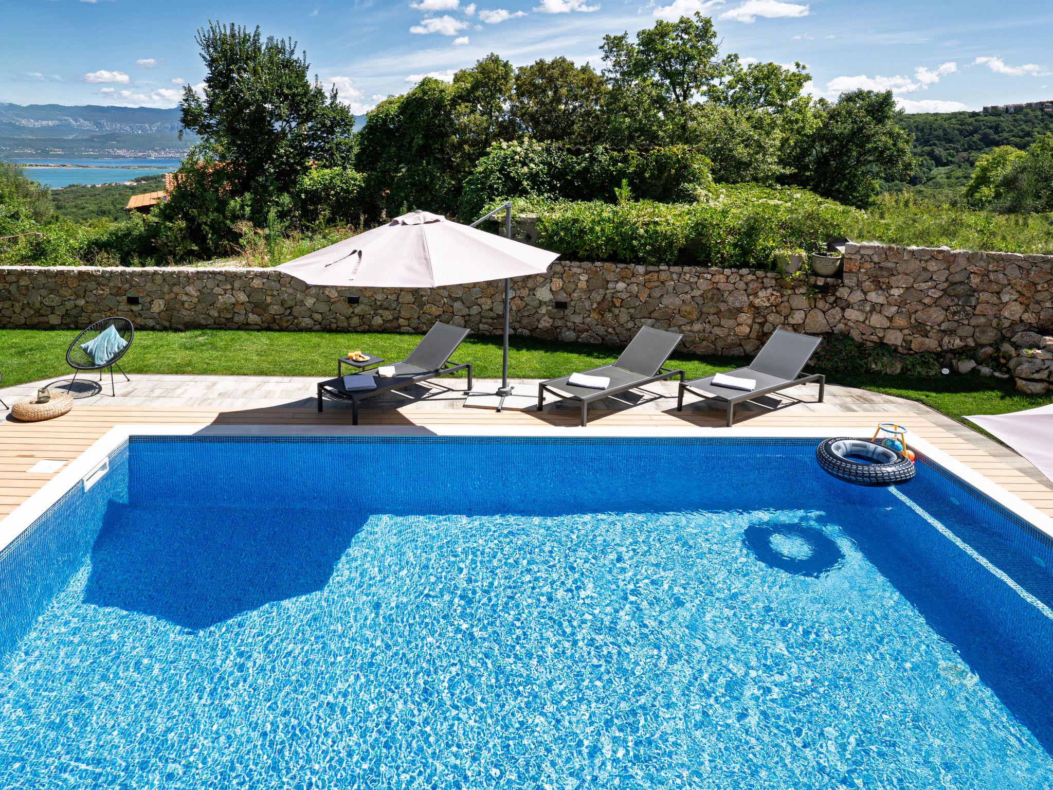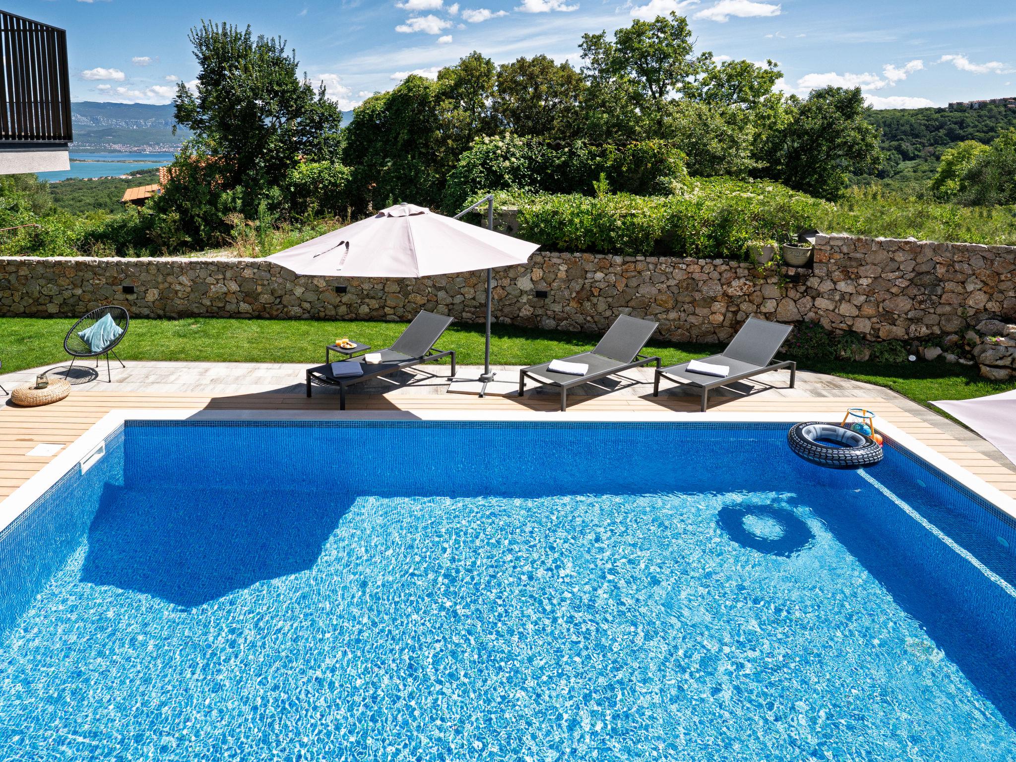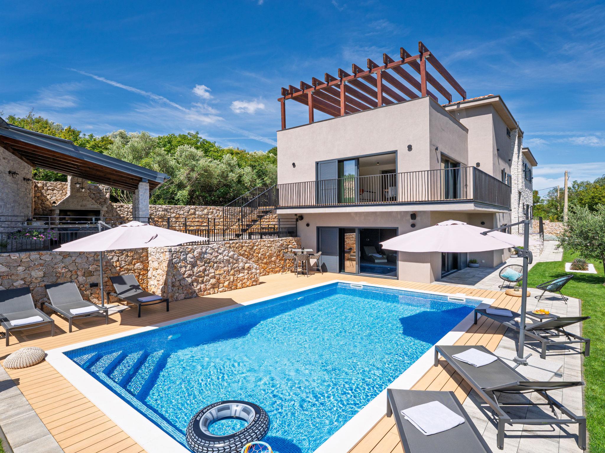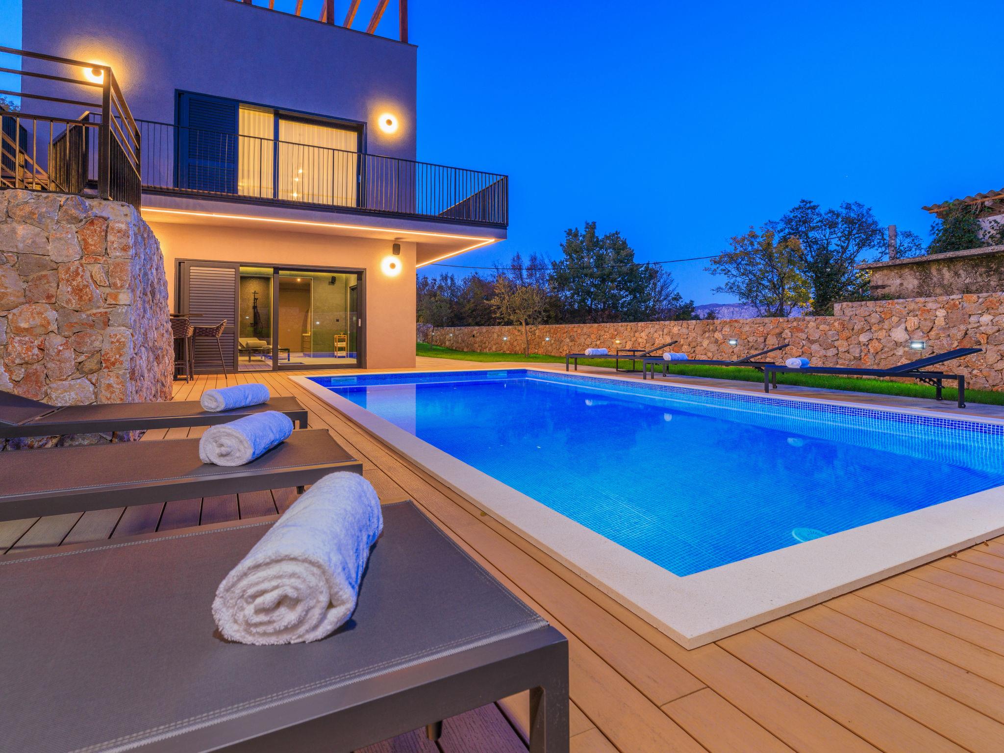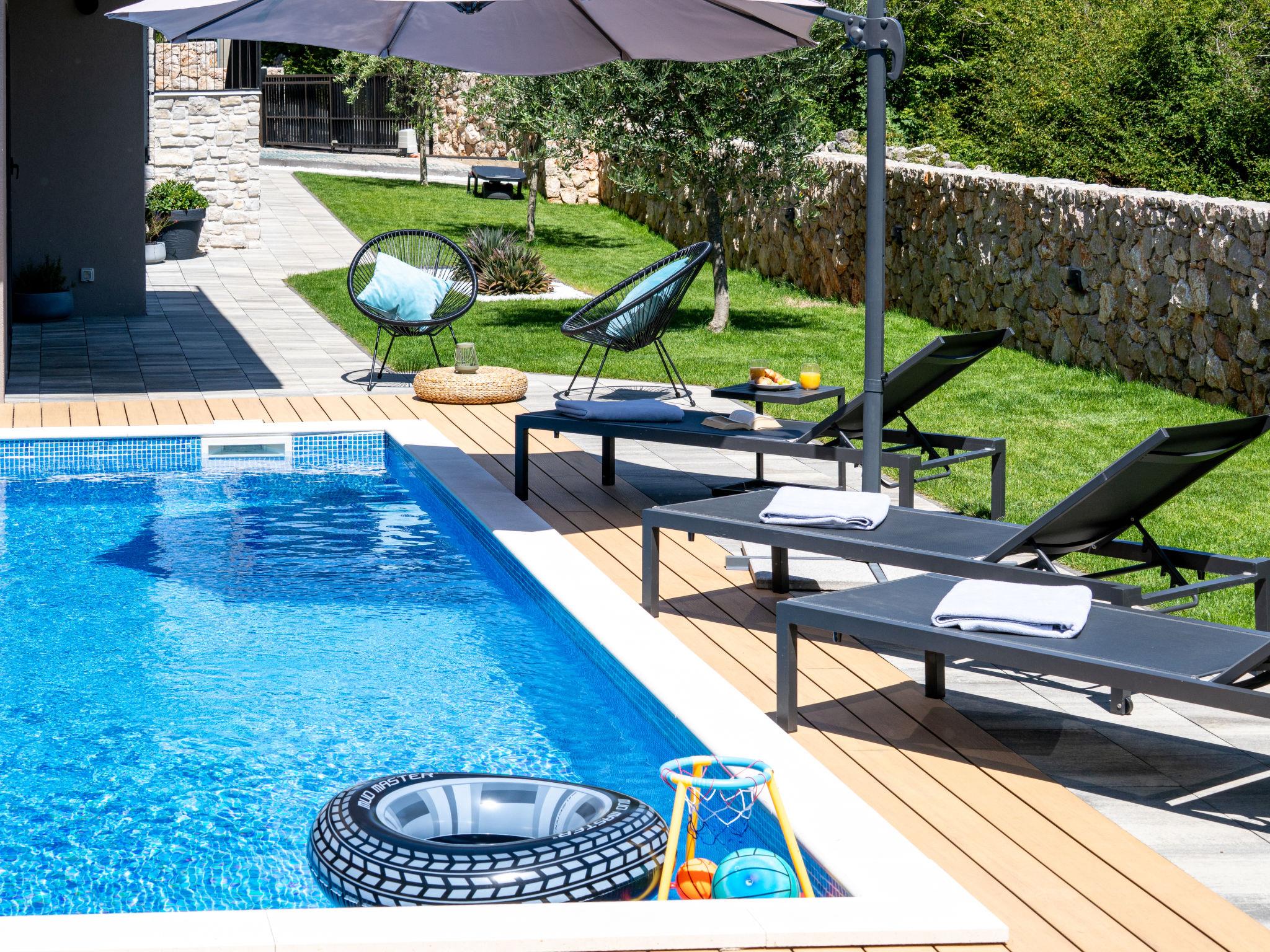 Klanice: Beautiful villa "Le Maris", 3 storeys, built in 2023. 4 km from the centre of Dobrinj, 6 km from the centre of Malinska, in a quiet, sunny, elevated position, 3.5 km from the sea, 3.5 km from the beach, in a cul-de-sac. Private: property 800 m2 (fenced), well-kept garden with lawn, swimming pool, indoor pool heated (8 m2, depth 130 cm, seasonal availability: 01.Jan. - 31.Dec.). Outdoor shower, table tennis, badminton, barbecue, pool maintenance by the owner/gardener. In the house: internet access, sauna, fitness room, hot tub (all included), trampoline, roof terrace, central heating system, air conditioning, washing machine, tumble dryer. Parking (for 3 cars) at the house on the premises. Shop 200 m, supermarket 6 km, restaurant 2 km, bus stop 5 km, sandy beach "Cižici" 3.5 km. Groups of teenagers on request only. Please note: airfield 15 km from the property. Private: swimming pool (30m2, depth: 1,50m ,angular, heated, available 01.04.- 15.10.).