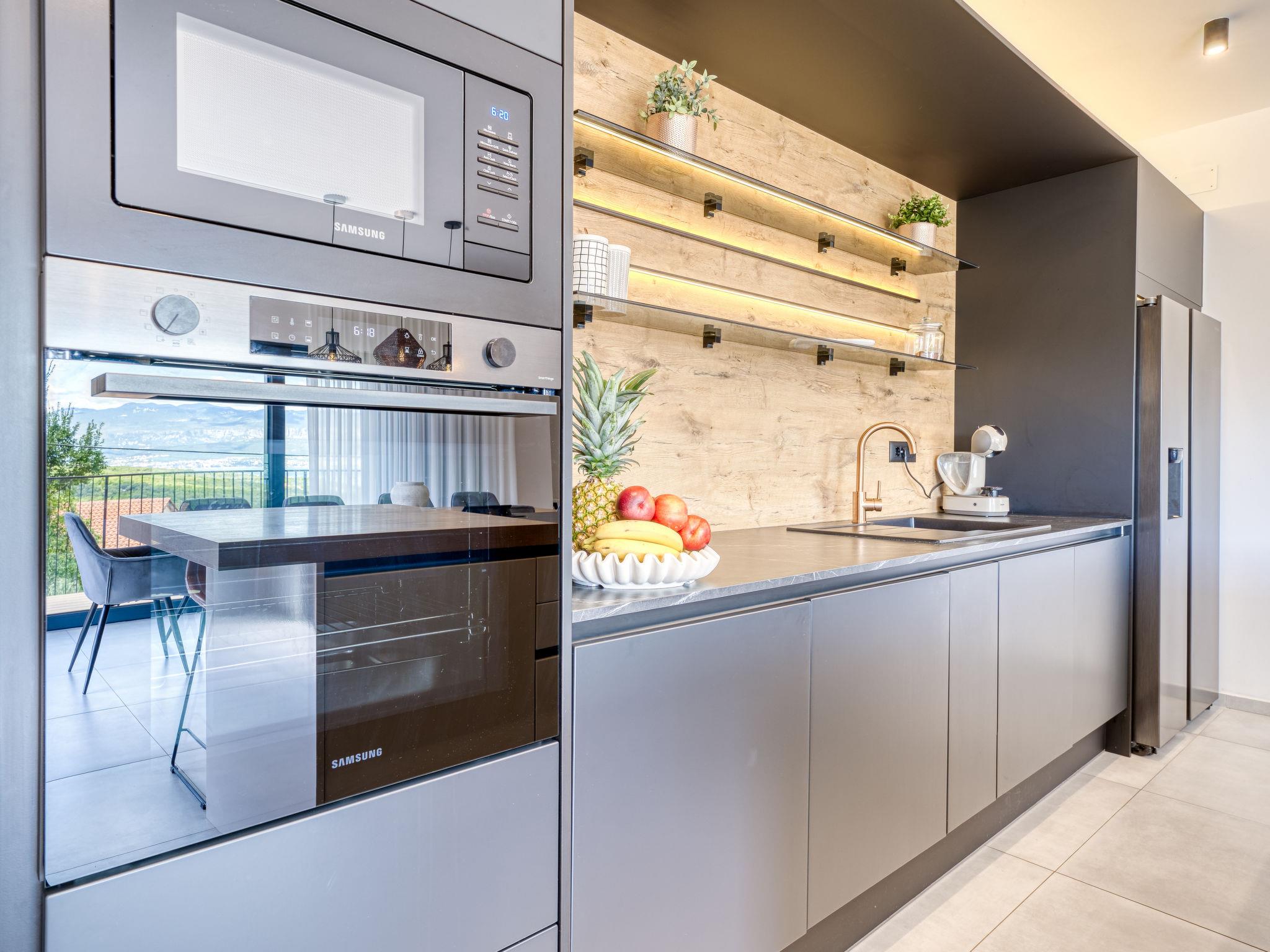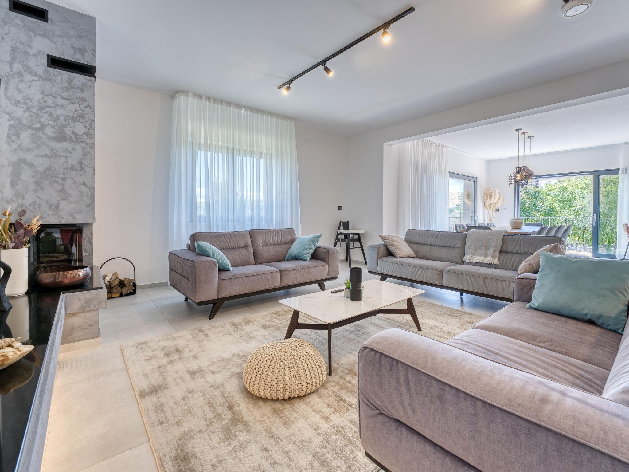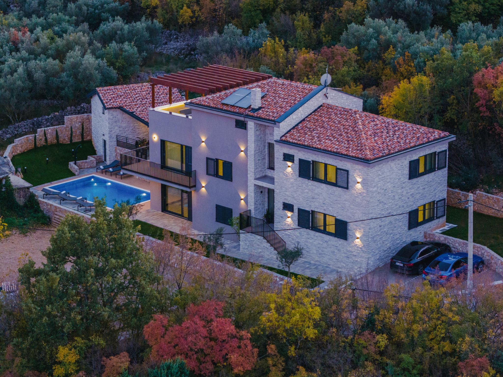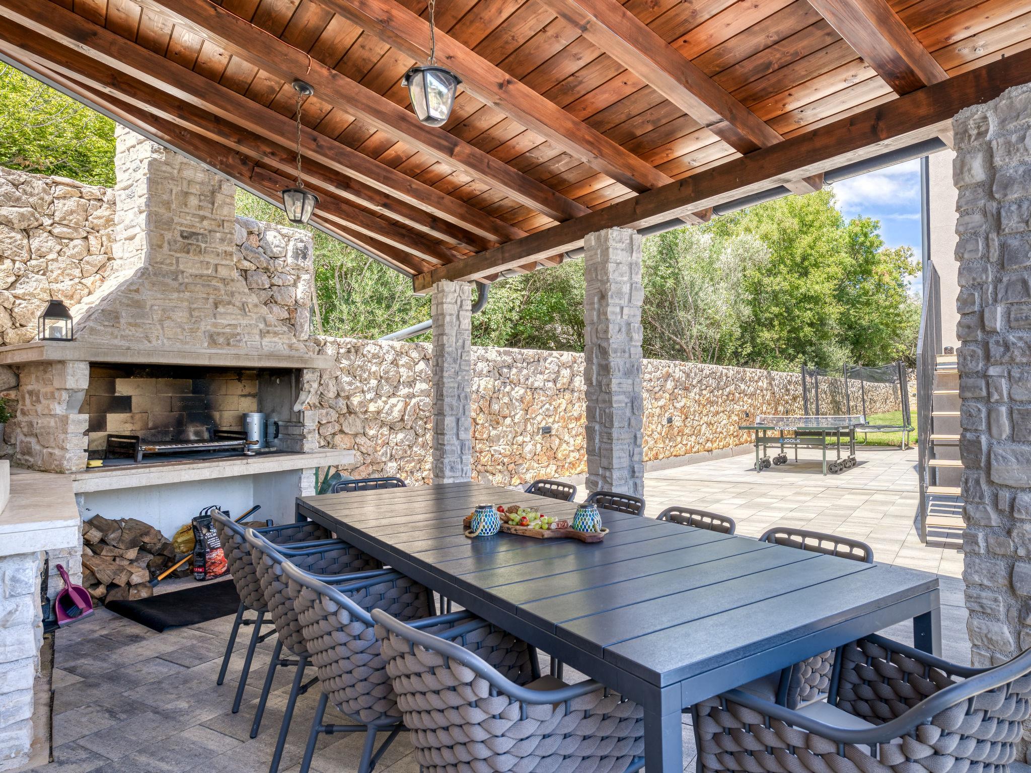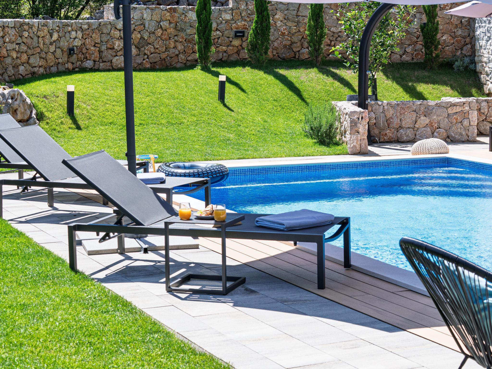 Klanice: Beautiful villa "Le Maris", 3 storeys, built in 2023. 4 km from the centre of Dobrinj, 6 km from the centre of Malinska, in a quiet, sunny, elevated position, 3.5 km from the sea, 3.5 km from the beach, in a cul-de-sac. Private: property 800 m2 (fenced), well-kept garden with lawn, swimming pool, indoor pool heated (8 m2, depth 130 cm, seasonal availability: 01.Jan. - 31.Dec.). Outdoor shower, table tennis, badminton, barbecue, pool maintenance by the owner/gardener. In the house: internet access, sauna, fitness room, hot tub (all included), trampoline, roof terrace, central heating system, air conditioning, washing machine, tumble dryer. Parking (for 3 cars) at the house on the premises. Shop 200 m, supermarket 6 km, restaurant 2 km, bus stop 5 km, sandy beach "Cižici" 3.5 km. Groups of teenagers on request only. Please note: airfield 15 km from the property. Private: swimming pool (30m2, depth: 1,50m ,angular, heated, available 01.04.- 15.10.).