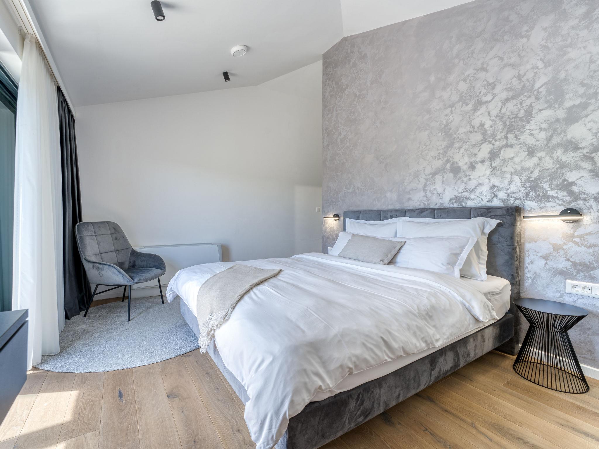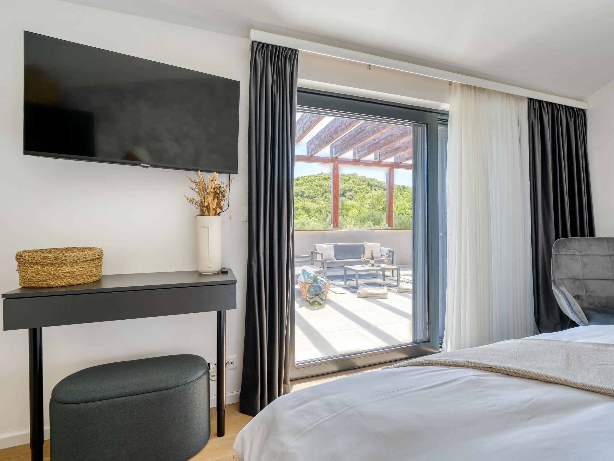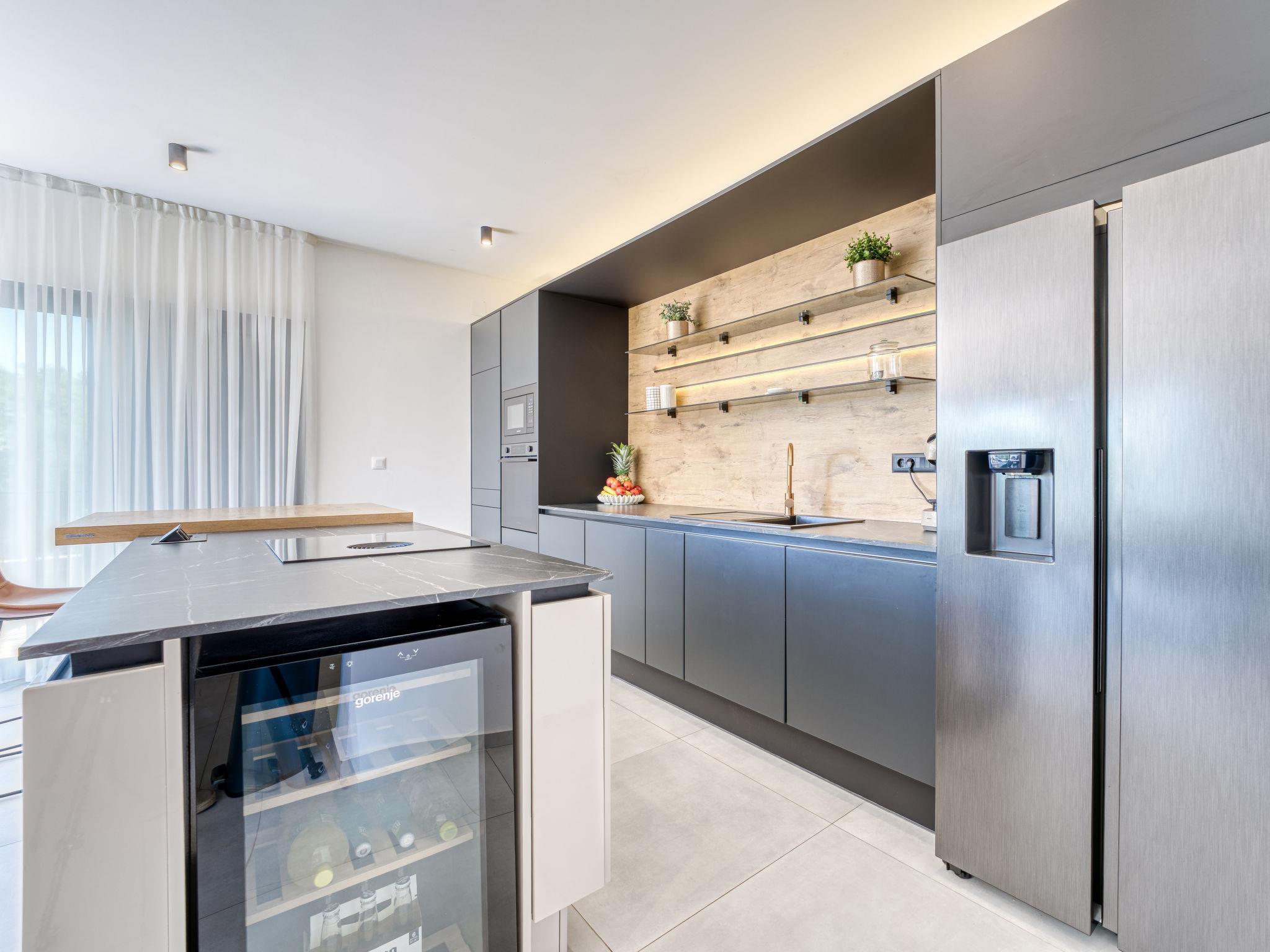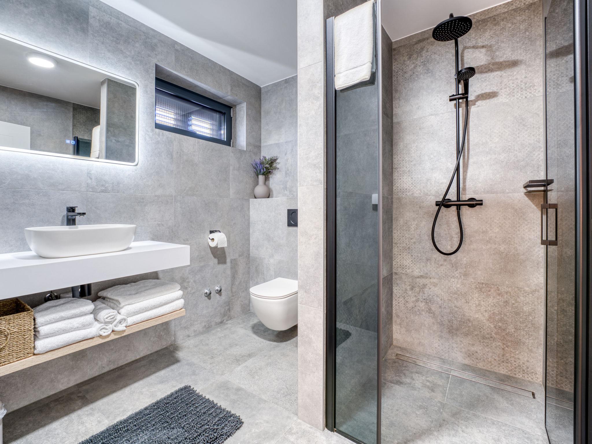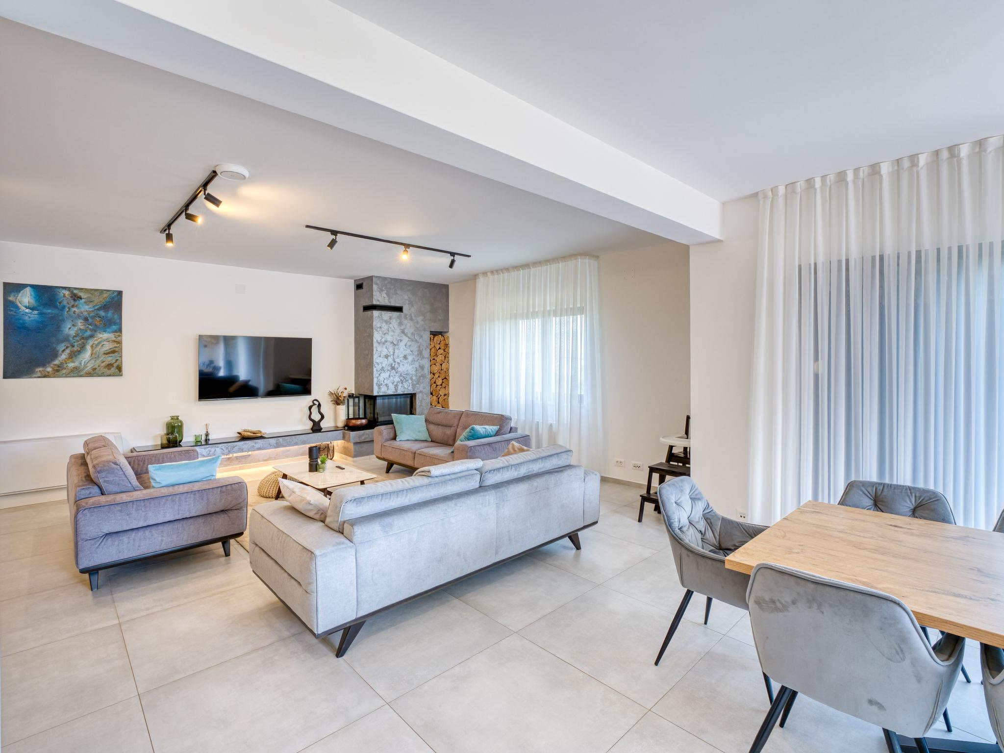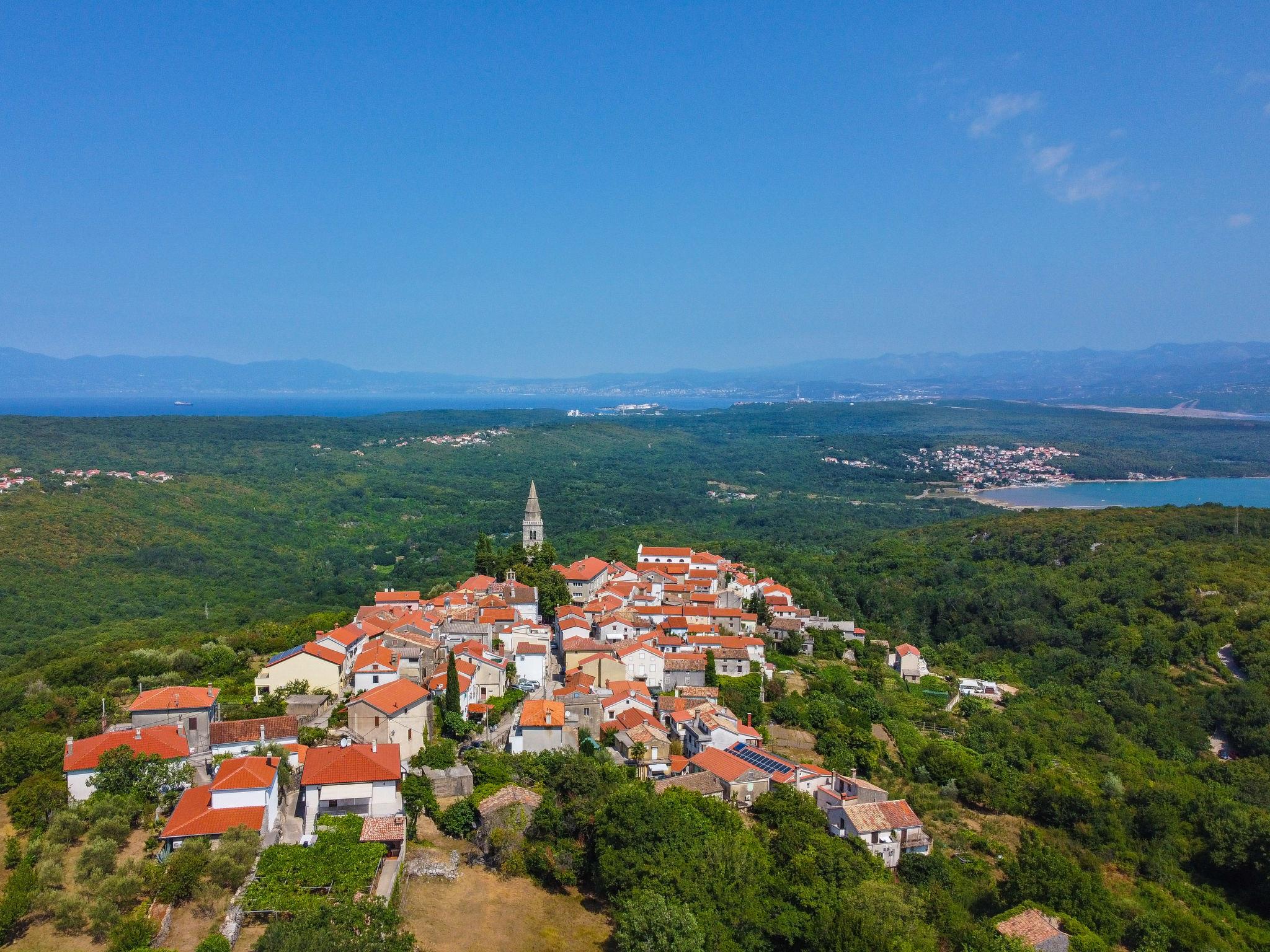 Klanice: Beautiful villa "Le Maris", 3 storeys, built in 2023. 4 km from the centre of Dobrinj, 6 km from the centre of Malinska, in a quiet, sunny, elevated position, 3.5 km from the sea, 3.5 km from the beach, in a cul-de-sac. Private: property 800 m2 (fenced), well-kept garden with lawn, swimming pool, indoor pool heated (8 m2, depth 130 cm, seasonal availability: 01.Jan. - 31.Dec.). Outdoor shower, table tennis, badminton, barbecue, pool maintenance by the owner/gardener. In the house: internet access, sauna, fitness room, hot tub (all included), trampoline, roof terrace, central heating system, air conditioning, washing machine, tumble dryer. Parking (for 3 cars) at the house on the premises. Shop 200 m, supermarket 6 km, restaurant 2 km, bus stop 5 km, sandy beach "Cižici" 3.5 km. Groups of teenagers on request only. Please note: airfield 15 km from the property. Private: swimming pool (30m2, depth: 1,50m ,angular, heated, available 01.04.- 15.10.).