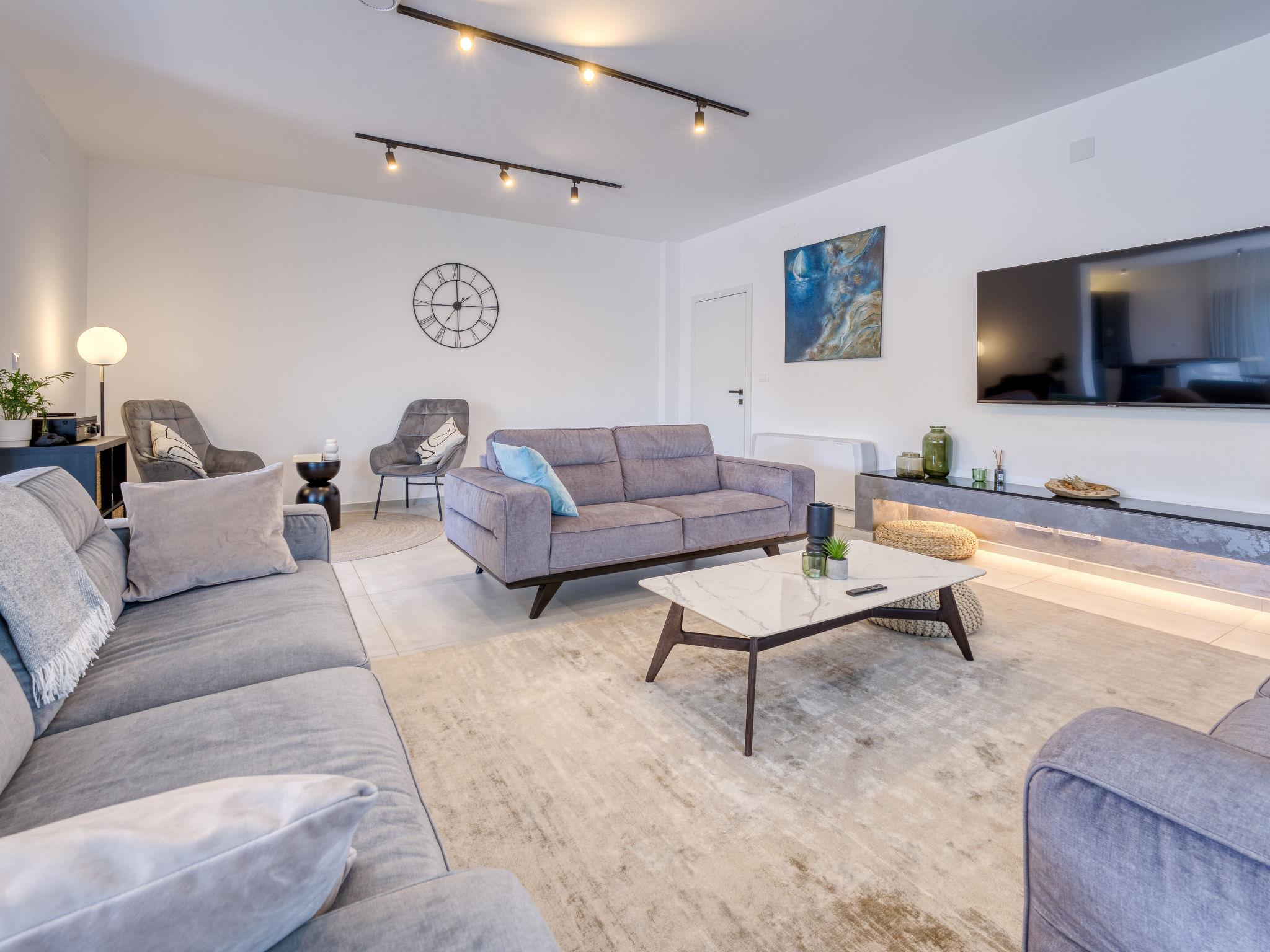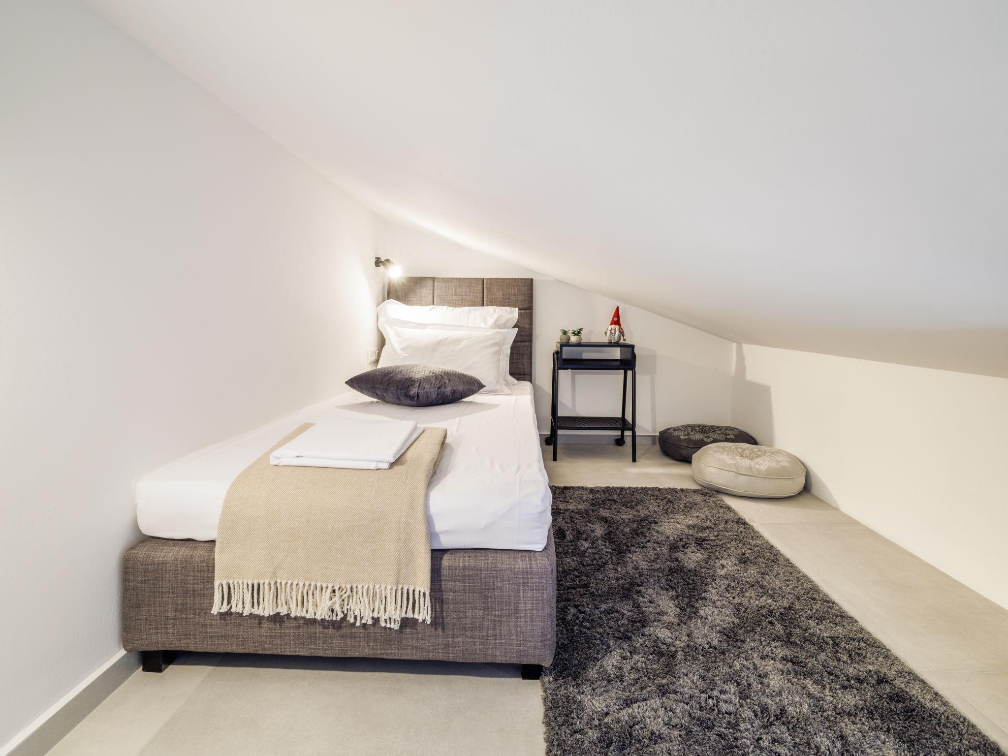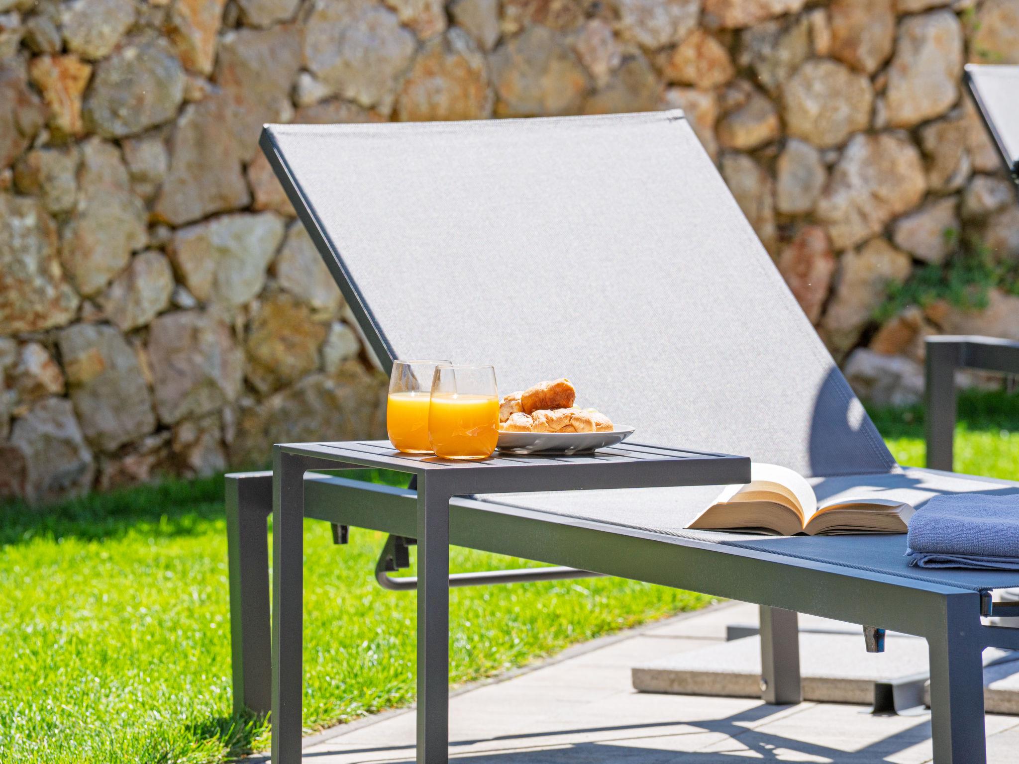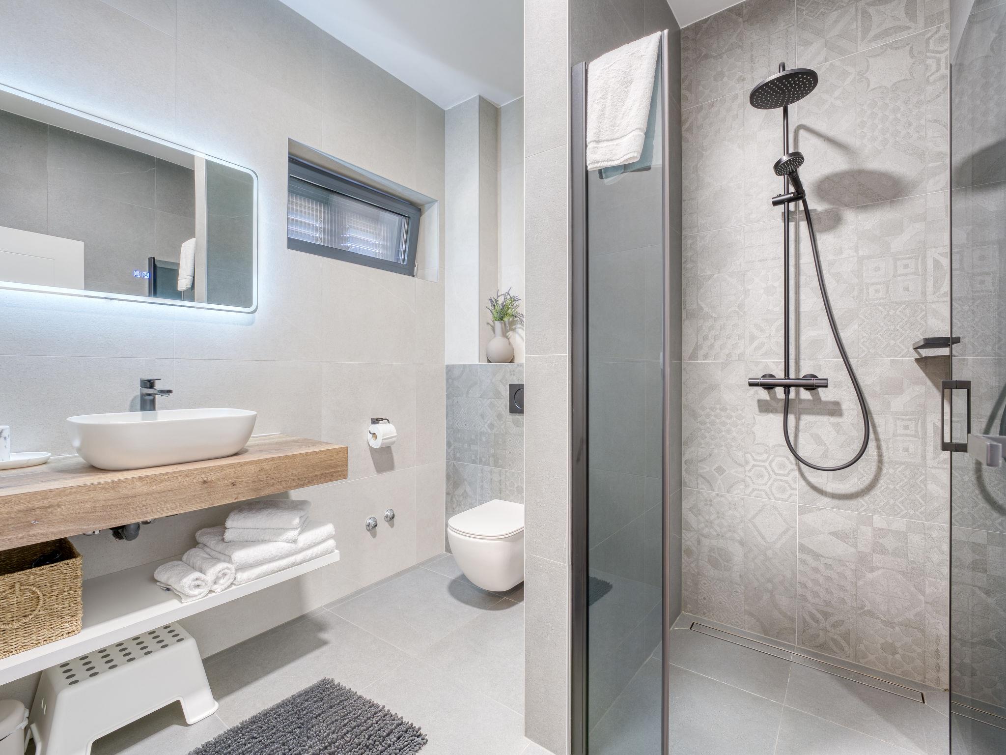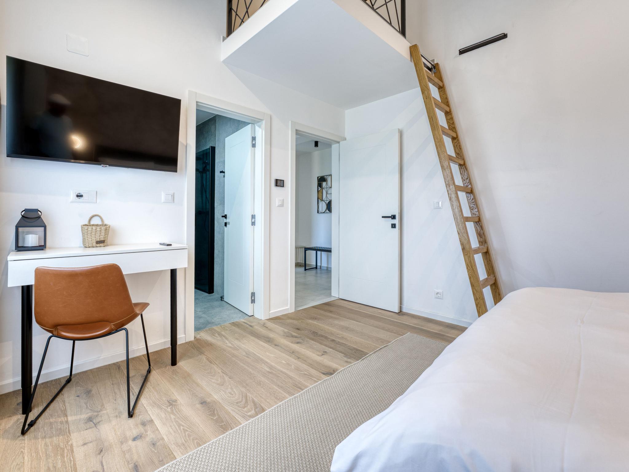 Klanice: Beautiful villa "Le Maris", 3 storeys, built in 2023. 4 km from the centre of Dobrinj, 6 km from the centre of Malinska, in a quiet, sunny, elevated position, 3.5 km from the sea, 3.5 km from the beach, in a cul-de-sac. Private: property 800 m2 (fenced), well-kept garden with lawn, swimming pool, indoor pool heated (8 m2, depth 130 cm, seasonal availability: 01.Jan. - 31.Dec.). Outdoor shower, table tennis, badminton, barbecue, pool maintenance by the owner/gardener. In the house: internet access, sauna, fitness room, hot tub (all included), trampoline, roof terrace, central heating system, air conditioning, washing machine, tumble dryer. Parking (for 3 cars) at the house on the premises. Shop 200 m, supermarket 6 km, restaurant 2 km, bus stop 5 km, sandy beach "Cižici" 3.5 km. Groups of teenagers on request only. Please note: airfield 15 km from the property. Private: swimming pool (30m2, depth: 1,50m ,angular, heated, available 01.04.- 15.10.).