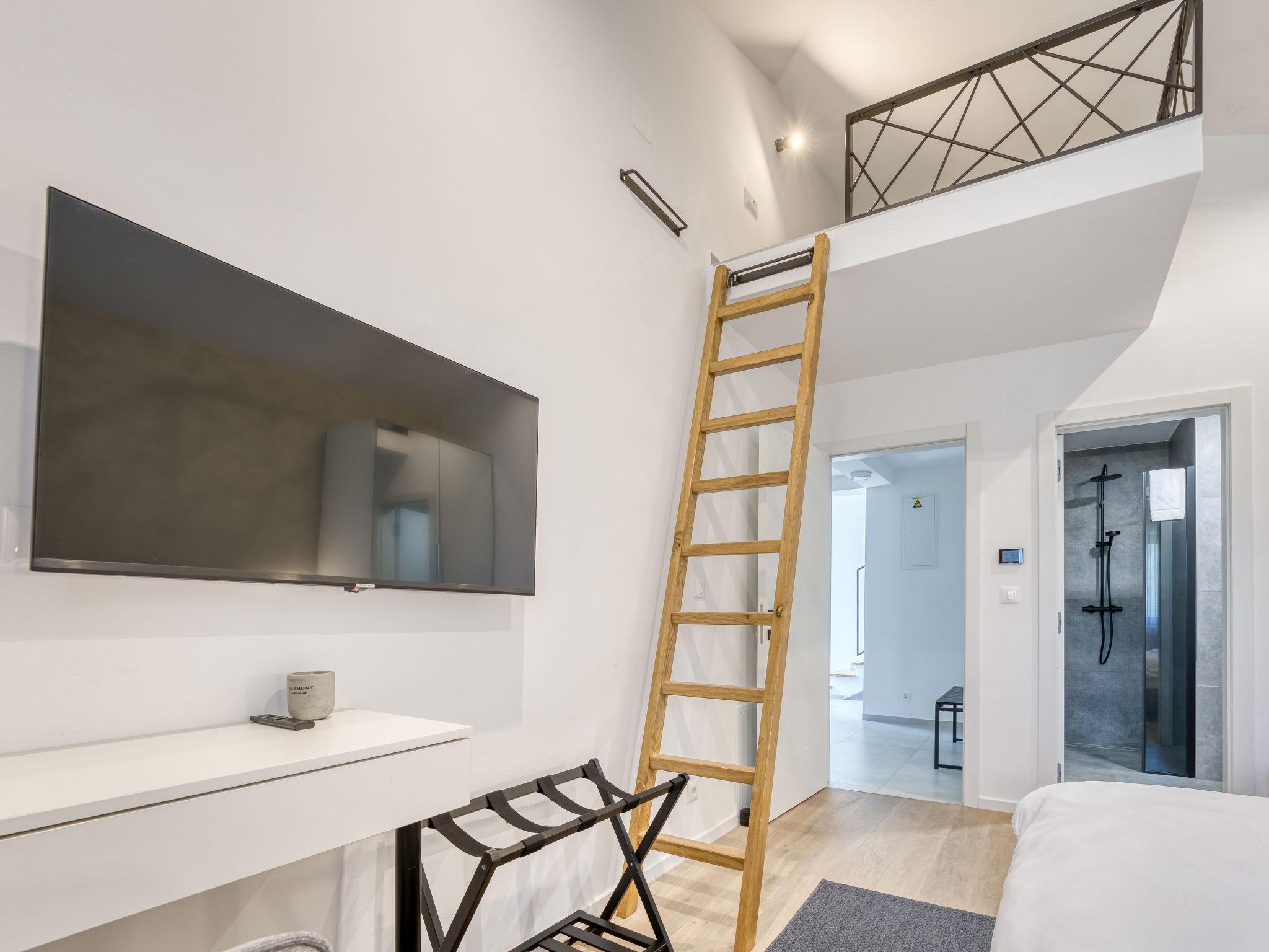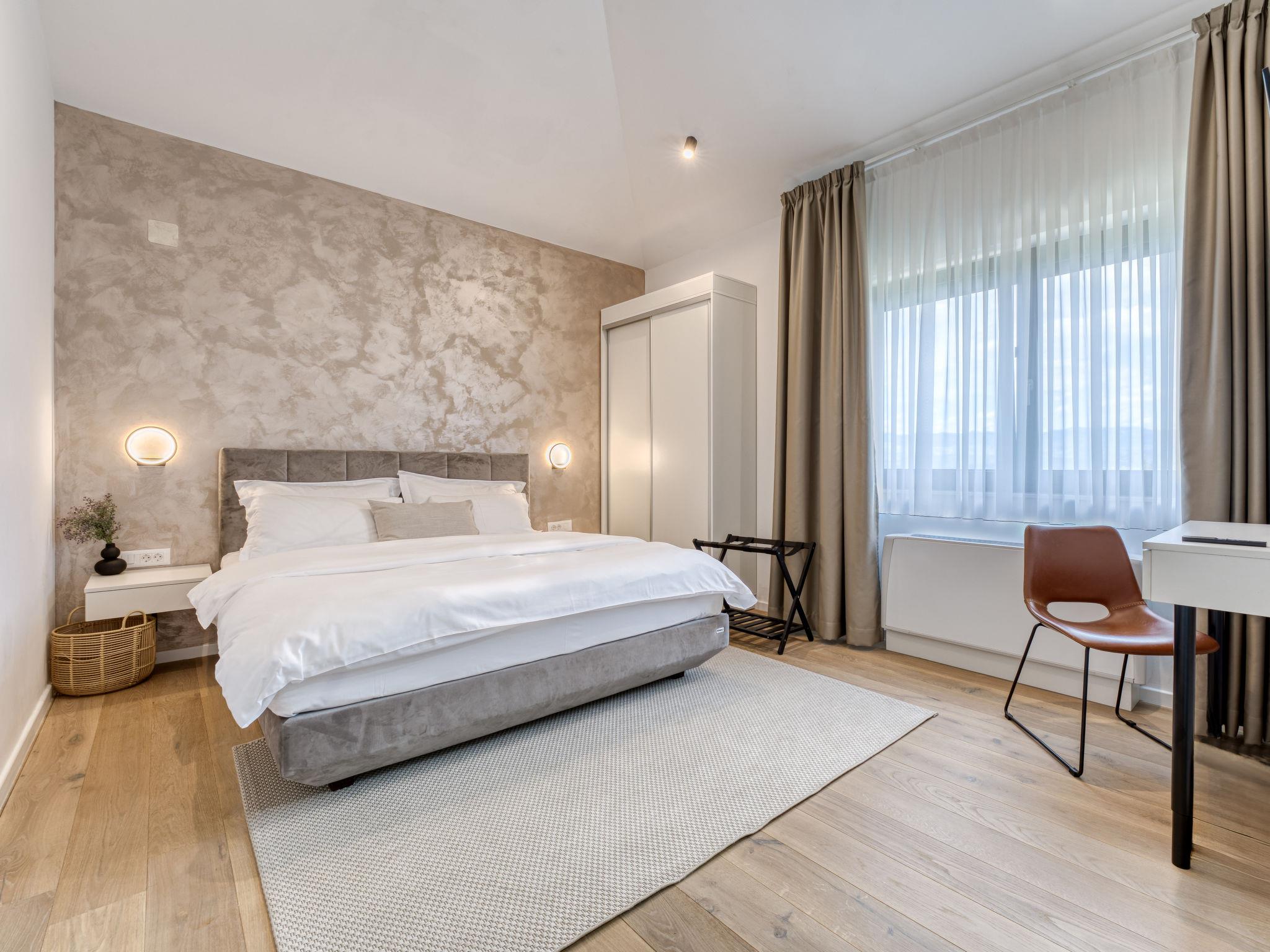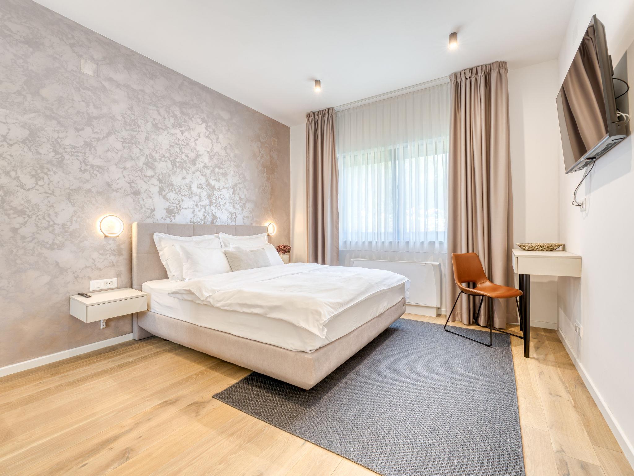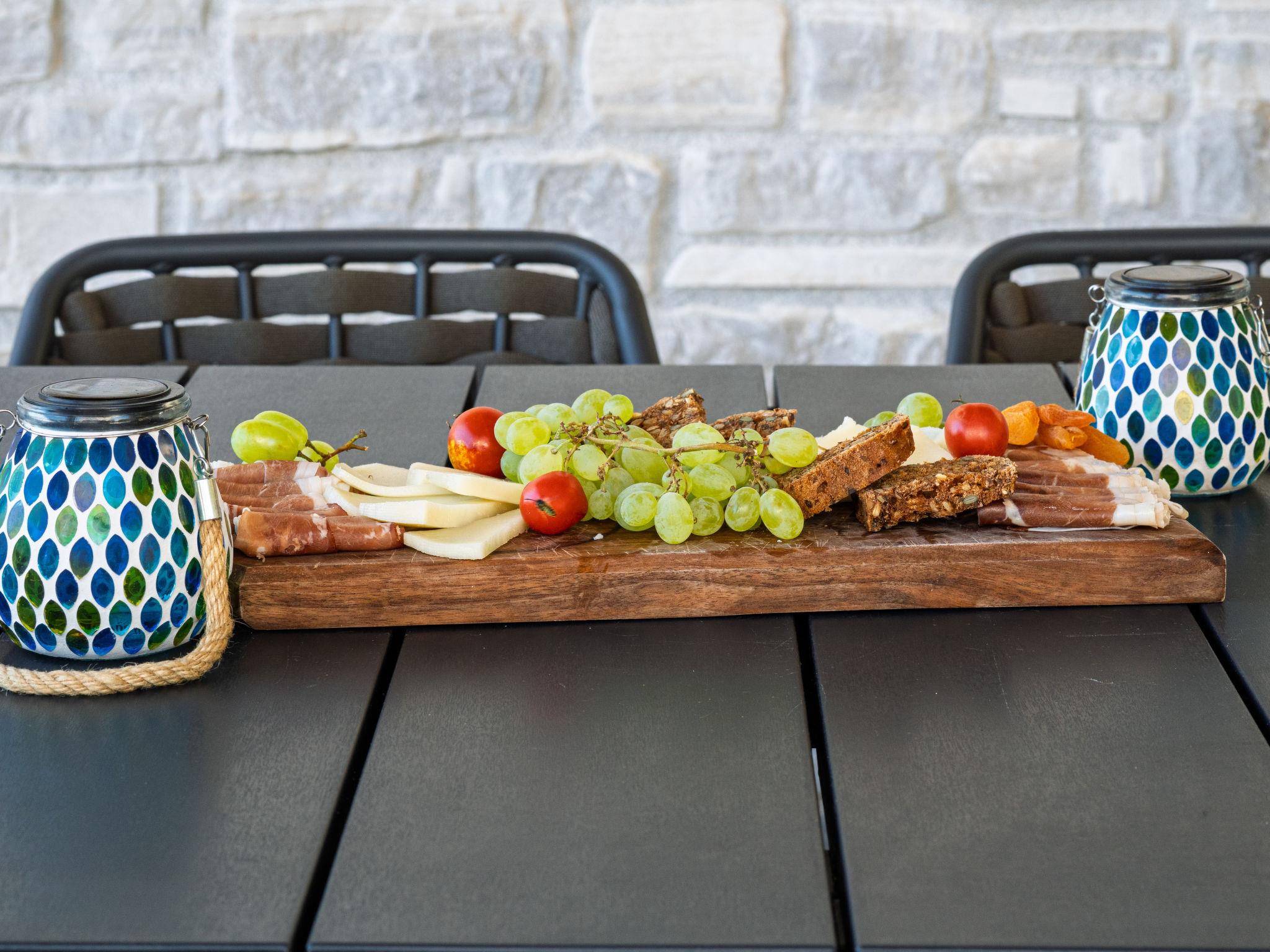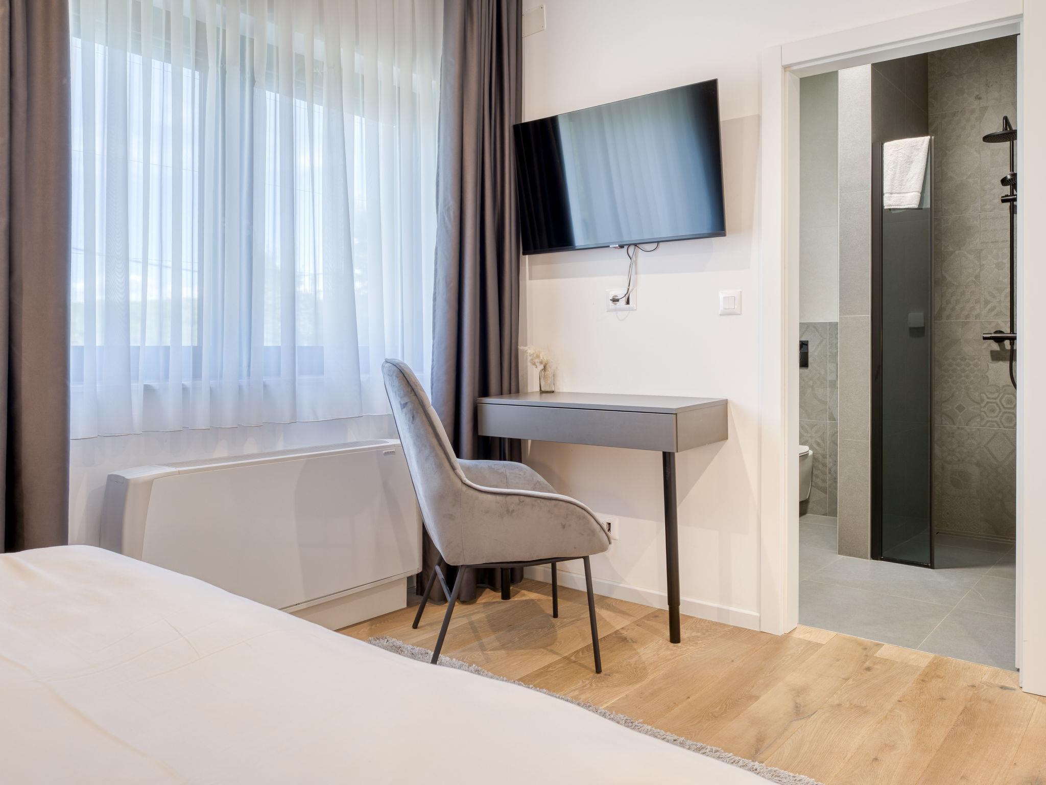 Klanice: Beautiful villa "Le Maris", 3 storeys, built in 2023. 4 km from the centre of Dobrinj, 6 km from the centre of Malinska, in a quiet, sunny, elevated position, 3.5 km from the sea, 3.5 km from the beach, in a cul-de-sac. Private: property 800 m2 (fenced), well-kept garden with lawn, swimming pool, indoor pool heated (8 m2, depth 130 cm, seasonal availability: 01.Jan. - 31.Dec.). Outdoor shower, table tennis, badminton, barbecue, pool maintenance by the owner/gardener. In the house: internet access, sauna, fitness room, hot tub (all included), trampoline, roof terrace, central heating system, air conditioning, washing machine, tumble dryer. Parking (for 3 cars) at the house on the premises. Shop 200 m, supermarket 6 km, restaurant 2 km, bus stop 5 km, sandy beach "Cižici" 3.5 km. Groups of teenagers on request only. Please note: airfield 15 km from the property. Private: swimming pool (30m2, depth: 1,50m ,angular, heated, available 01.04.- 15.10.).