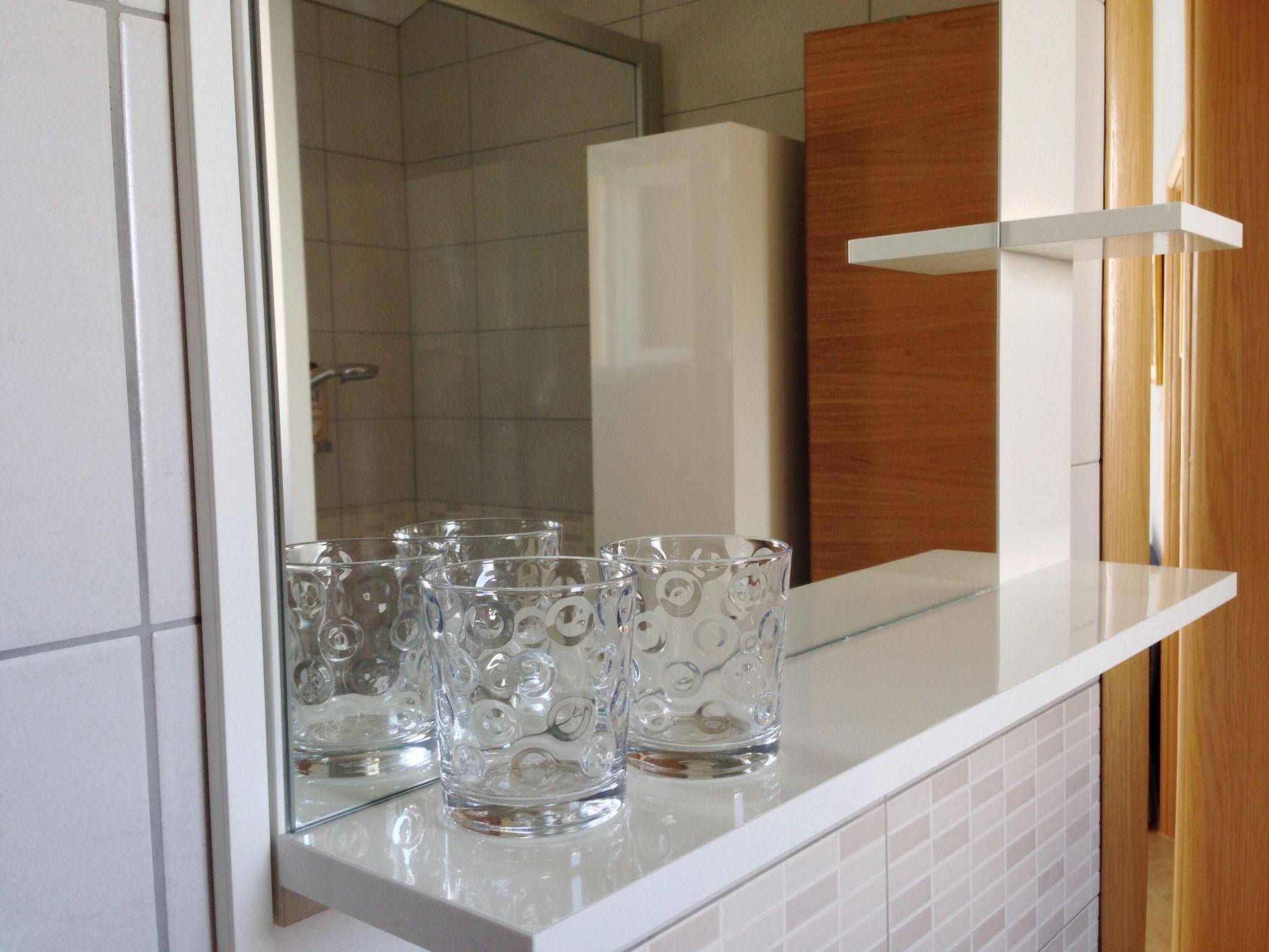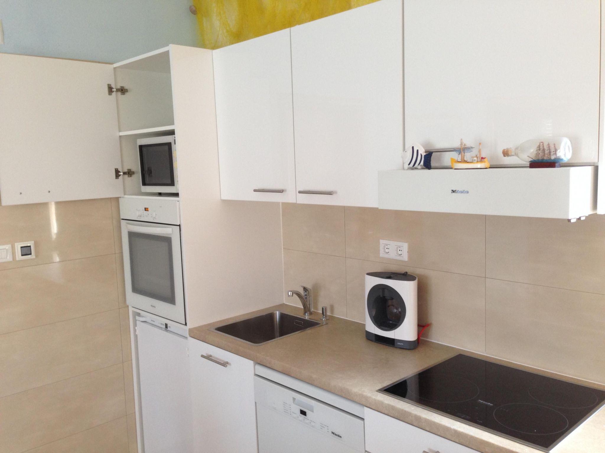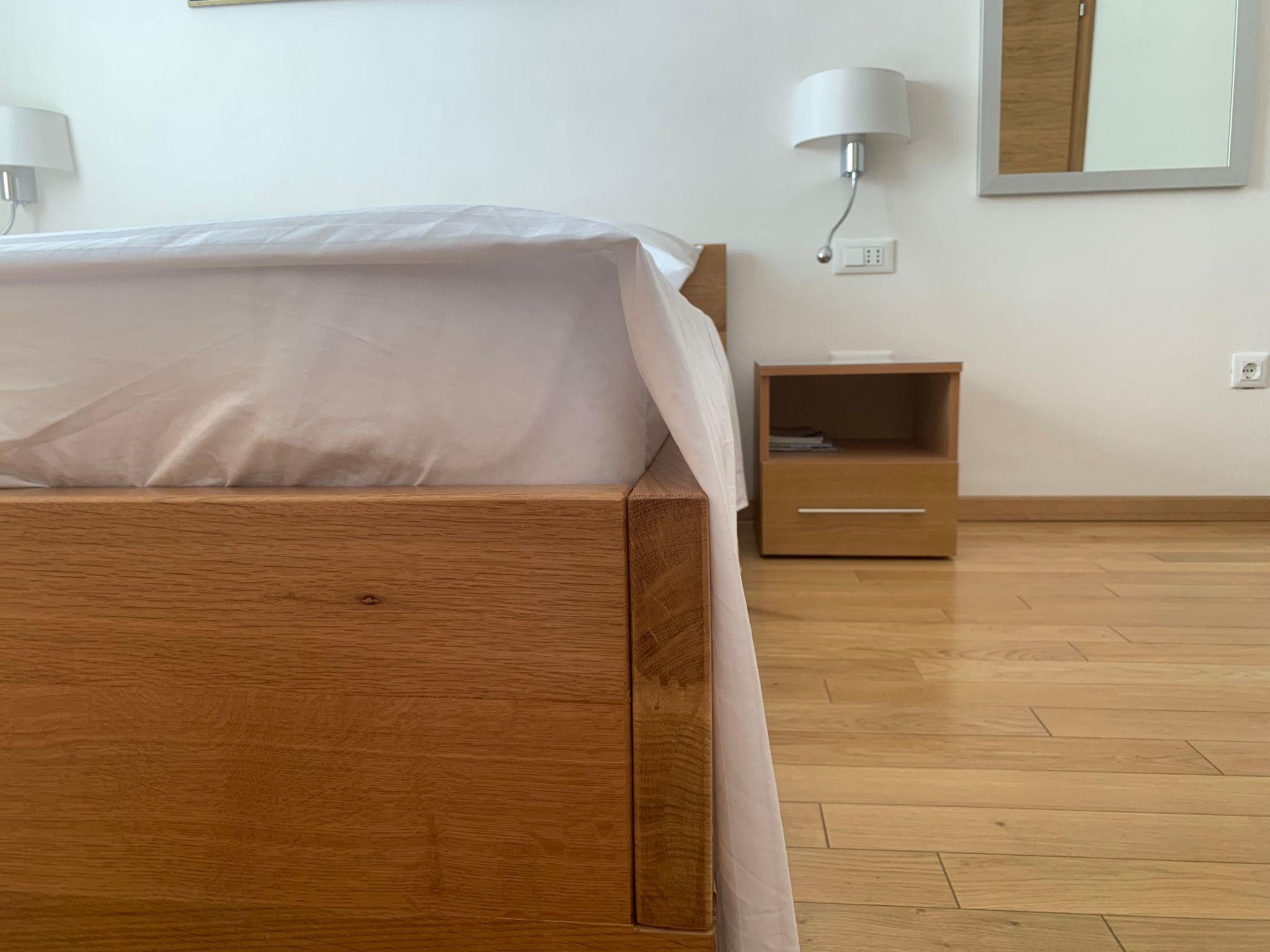 The 43m² apartment was finished in 2014 and can accommodate up to four people. It has a bathroom with a shower and a bedroom with a double bed (160 x 200cm) and a single bed (80 x 190cm). The beds are made of real wood with organic varnishing. Quality mattresses, comfortable pillows and bed covers made of 100% cotton for impeccable hygiene ensure a good night’s sleep. The wardrobe provides ample storage space. The living room has a sofa bed for a fourth person. Next to the sofa there is a round dining table, with an adjoining modern kitchen unit, equipped with a dishwasher, microwave, induction hob, oven, fridge and coffee machine (high class-Miele). The sleeping room features real wood parquet flooring. The living room is tiled with ceramic tiles and has underfloor heating. Free wireless Internet access is available.