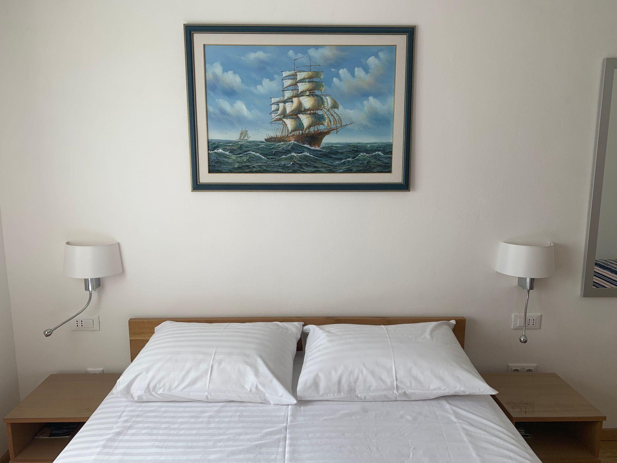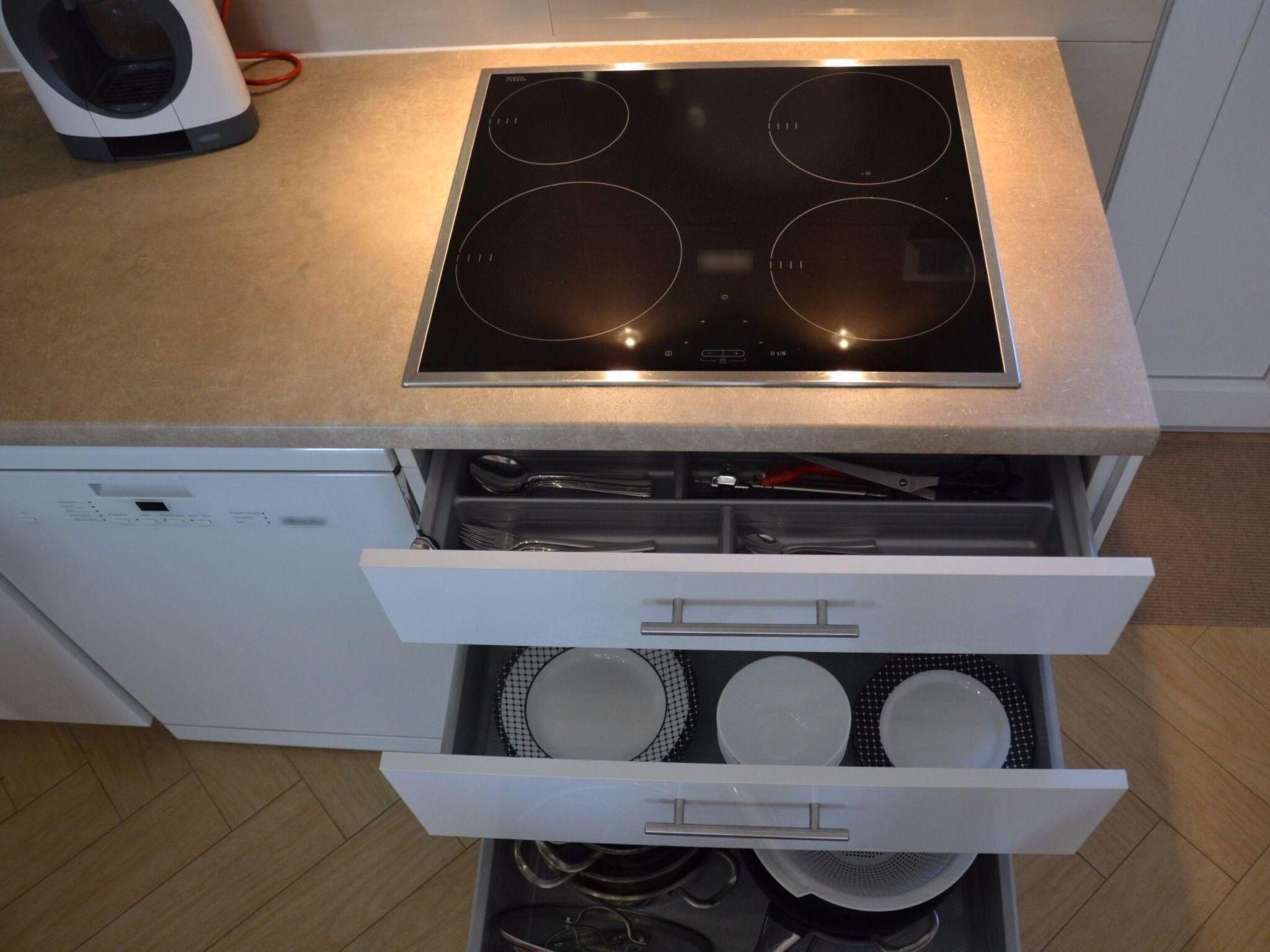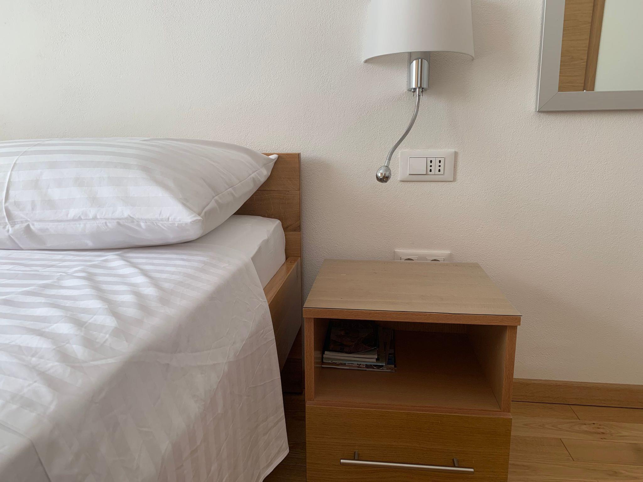The 43m² apartment was finished in 2014 and can accommodate up to four people. It has a bathroom with a shower and a bedroom with a double bed (160 x 200cm) and a single bed (80 x 190cm). The beds are made of real wood with organic varnishing. Quality mattresses, comfortable pillows and bed covers made of 100% cotton for impeccable hygiene ensure a good night’s sleep. The wardrobe provides ample storage space. The living room has a sofa bed for a fourth person. Next to the sofa there is a round dining table, with an adjoining modern kitchen unit, equipped with a dishwasher, microwave, induction hob, oven, fridge and coffee machine (high class-Miele). The sleeping room features real wood parquet flooring. The living room is tiled with ceramic tiles and has underfloor heating. Free wireless Internet access is available.
