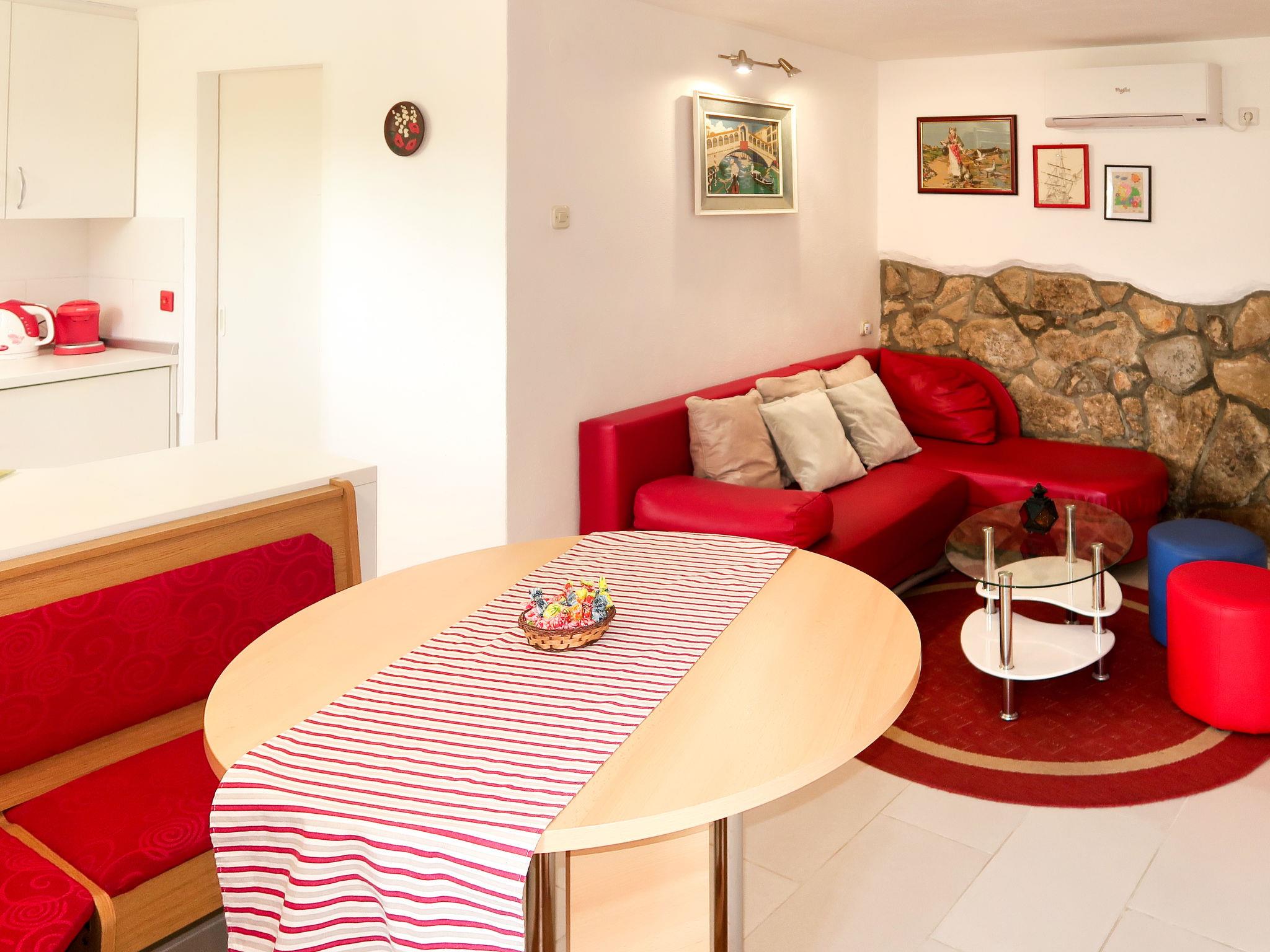 Terraced house "Margeta", 2 storeys. In the hamlet Lakmartin 5 km from the centre of Krk, 2 km from the centre of Kornic, 3.5 km from the centre of Punat, 3 km from the sea, 3 km from the beach. For shared use: property. Private: swimming pool round (2.5 m diameter, depth 80 cm, seasonal availability: 01.May. - 01.Nov.). Terrace (45 m2), garden furniture, barbecue. In the house: internet access, washing machine. Roofed, parking (for 2 cars). Shop 2 km, restaurant 3.5 km, bus stop 2 km, pebble beach 3 km. Please note: airfield 25 km from the property. For privately use: summer kitchen (4 ceramic hobs, dishwasher, fridge). The owner lives on the edge of the property (access via terrace, 45 m2).