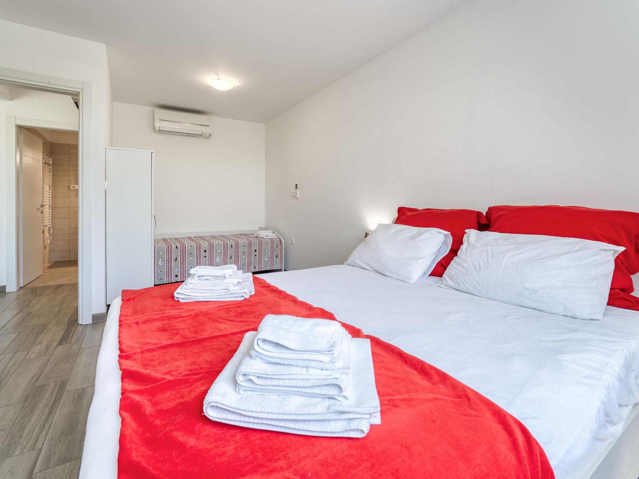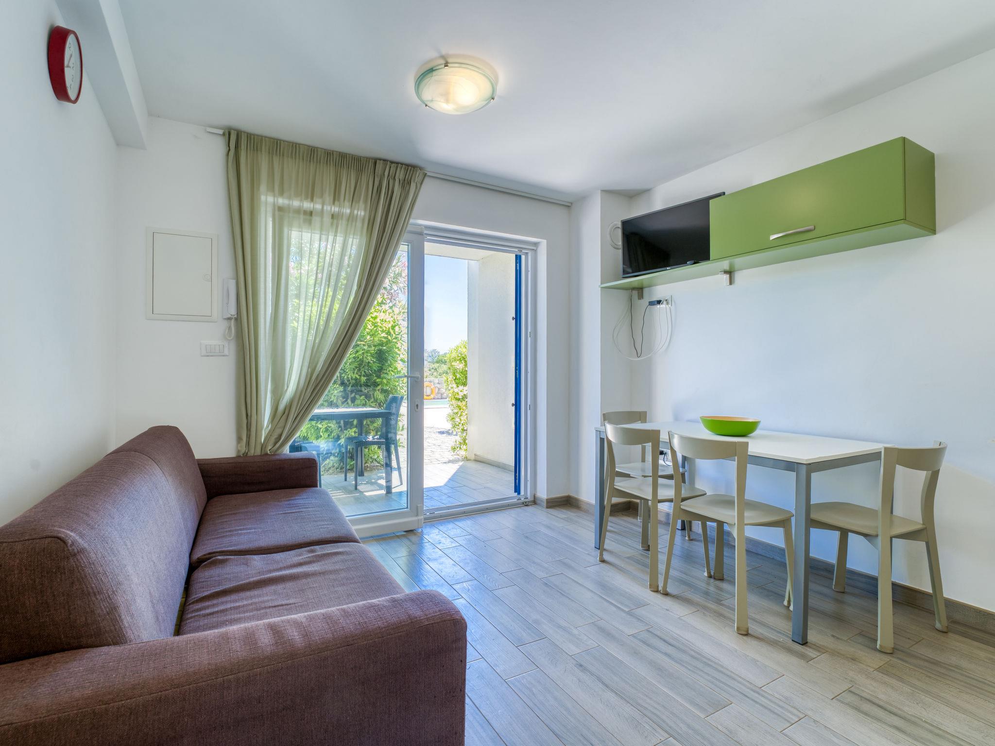 "Fuoco", 2-room apartment 40 m2, on the ground floor. Living/dining room with 1 sofabed (120 cm, length 200 cm), satellite TV and air conditioning. Exit to the terrace. 1 room with 1 bed (90 cm, length 200 cm), 1 french bed (160 cm, length 200 cm), air conditioning. Open kitchen (oven, 4 ceramic glass hob hotplates, toaster, kettle, microwave, freezer, electric coffee machine). Shower/bidet/WC. Forced-air heating. Terrace 15 m2, roofed. Terrace furniture. Facilities: Internet (WiFi, free). Please note: non-smoking house. 1 small pet/ dog allowed. Private entrance, fire extinguisher.