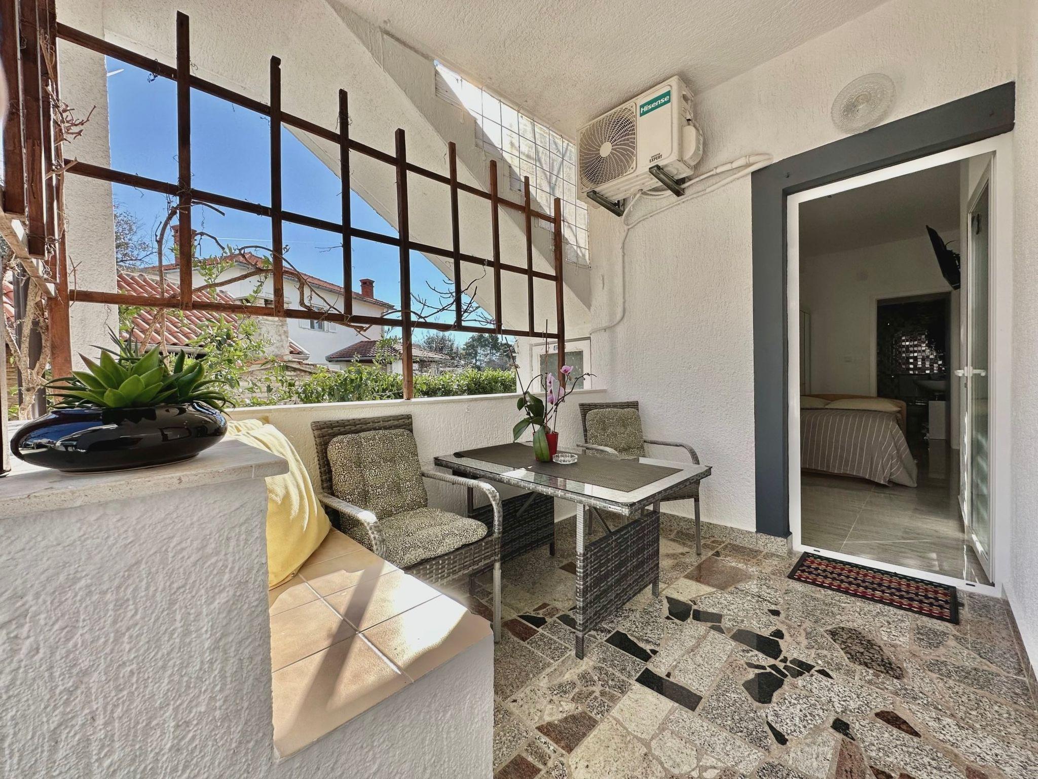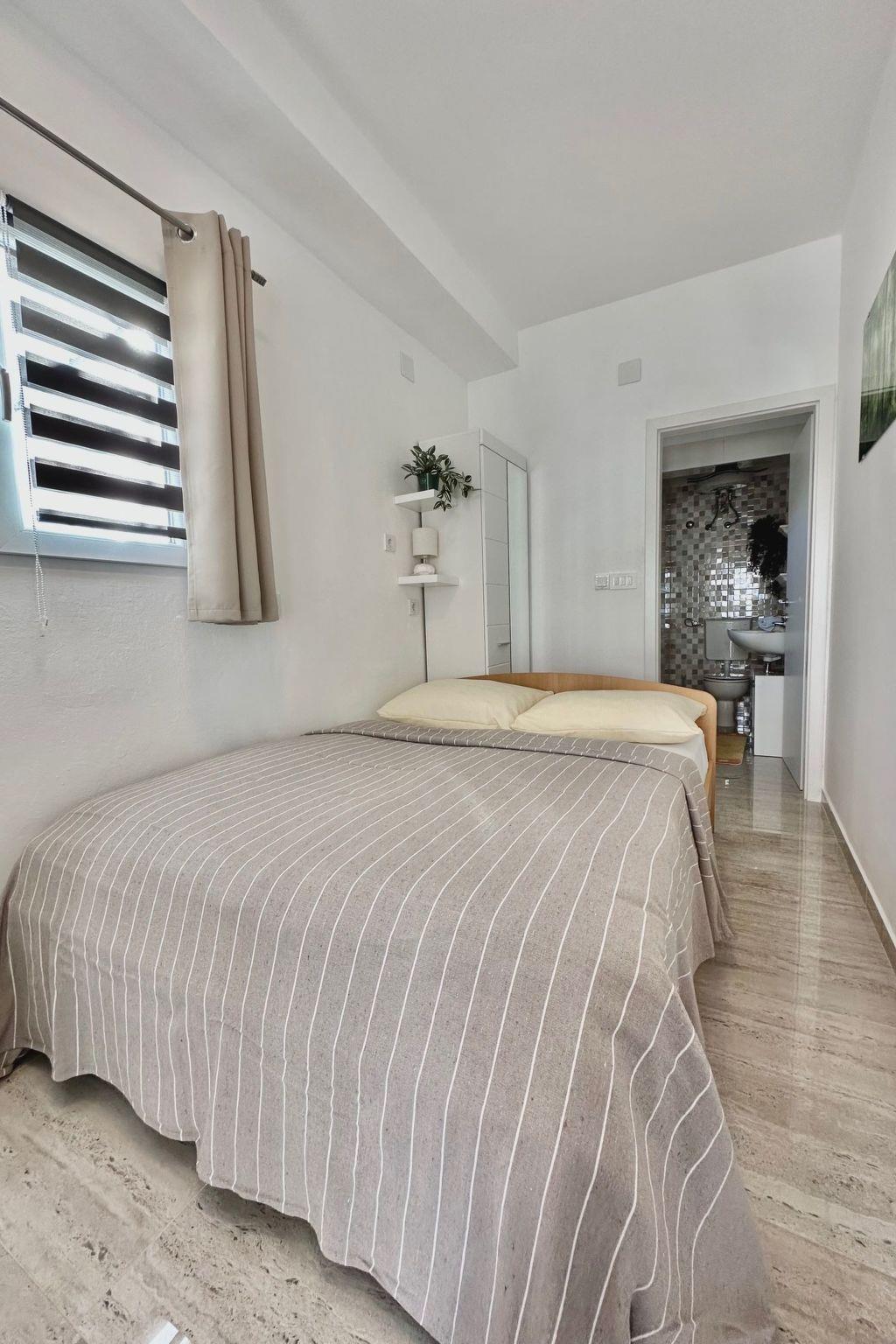 This accommodation is on the ground floor and consists of a dining area with a kitchen unit, a bathroom with a shower, a bedroom with a double bed. The bedroom has laminate flooring and satellite TV. Kitchenware, an electric hob with two hotplates, a fridge with a small freezer compartment, a coffee machine, a table and two chairs are provided. The kitchen area and the bathroom are tiled. There is also air conditioning.