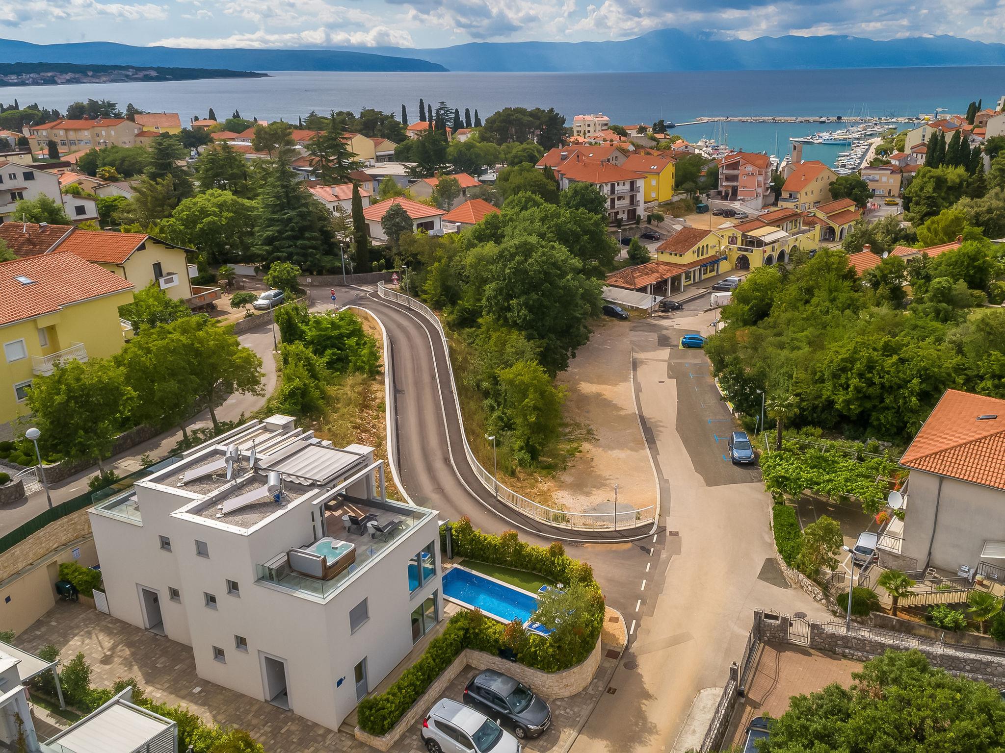 Modern semi-detached house "Nika", 2 storeys. In the centre of Malinska 5 km from the centre of Njivice, 15 km from the centre of Krk, in a sunny position, 350 m from the sea, 500 m from the beach. Private: property 150 m2, swimming pool angular, heated (17 m2, depth 140 cm, seasonal availability: 01.Jan. - 31.Dec.). Outdoor shower, hot tub. In the house: internet access, roof terrace, washing machine, tumble dryer. Parking (for 2 cars) at the house on the premises. Shop, supermarket 400 m, restaurant 300 m, bakery 200 m, café 250 m, pedestrian zone 350 m, bus stop 400 m, pebble beach 500 m, public bathing area 600 m. Marina 400 m. Nearby attractions: Frankopanski kaštel 14 km, Biserujka cave 13 km. Groups of teenagers on request only. Please note: airfield 15 km from the property. Hot tub is situated on the roof terrace (18m2).