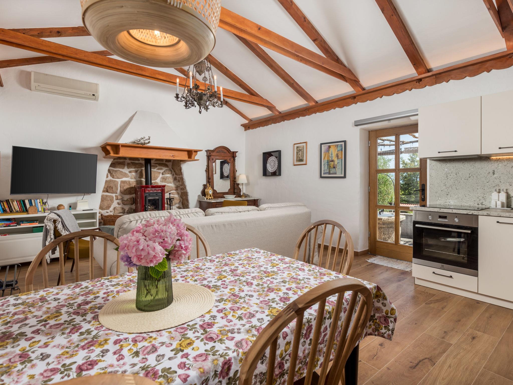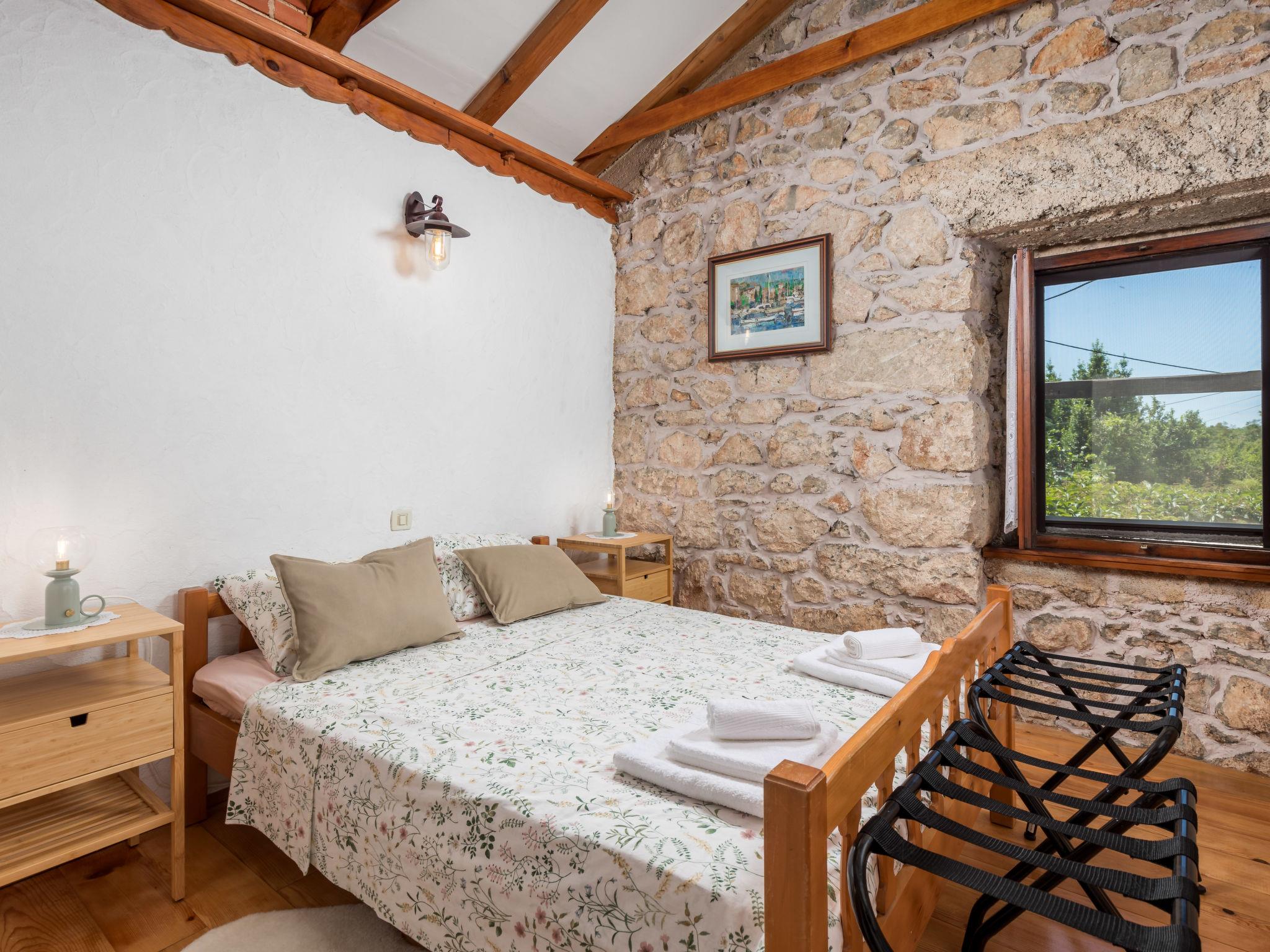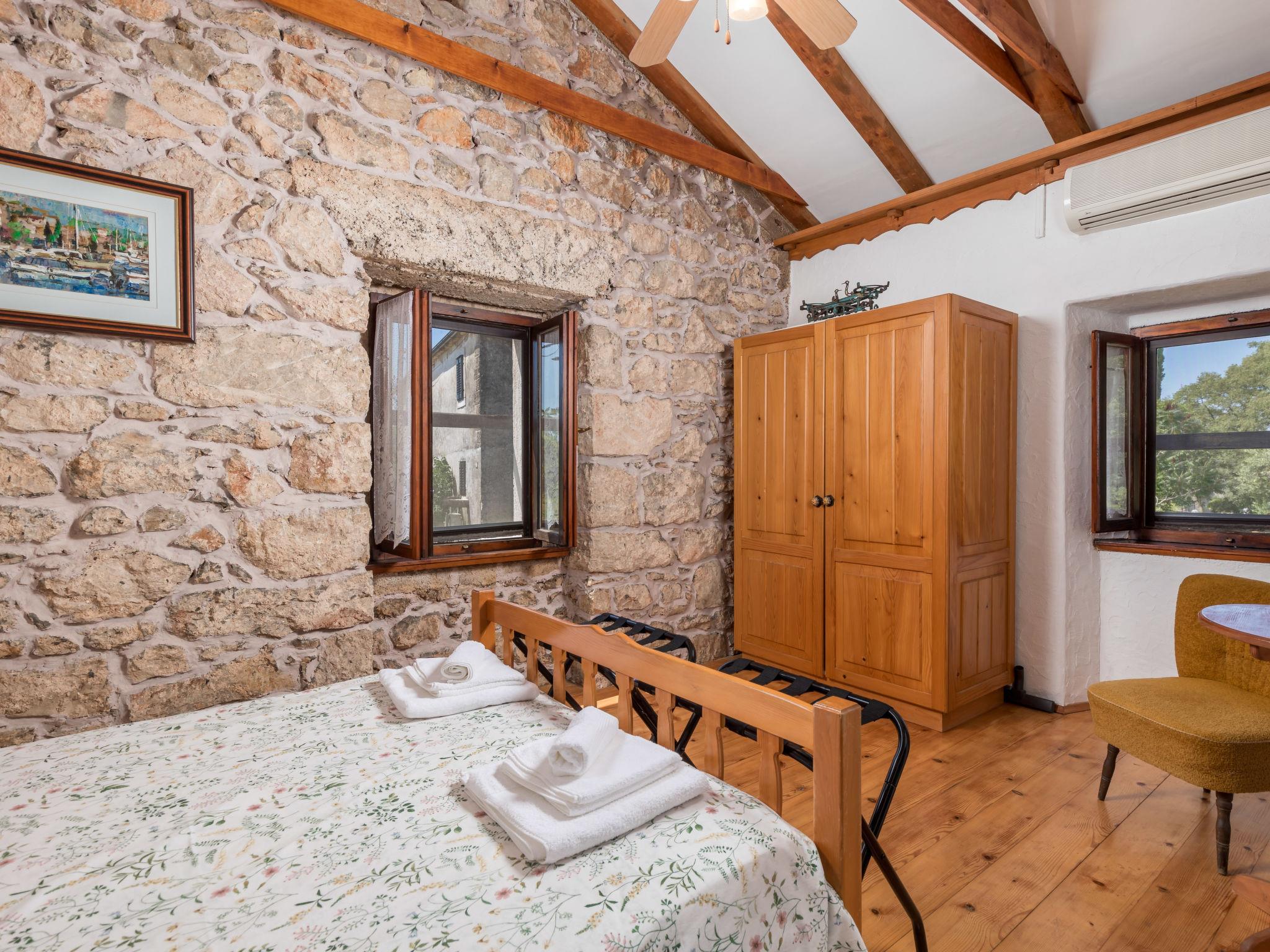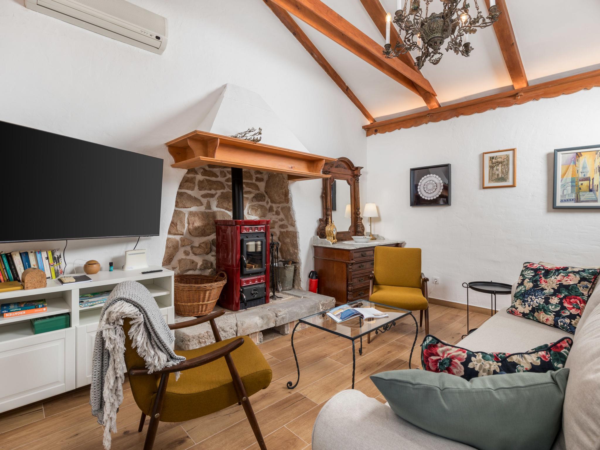2-room apartment 50 m2 on 1st floor. Living/sleeping room with 1 double sofabed, open-hearth fireplace, shower/WC, satellite TV and air conditioning. Exit to the terrace. 1 room with 1 french bed (160 cm, length 200 cm), shower/WC, TV and air conditioning. Open kitchen (4 hot plates, oven, dishwasher, toaster, kettle, microwave, freezer, electric coffee machine). Electric heating, forced-air heating. Terrace 12 m2, terrace 16 m2. Terrace furniture, deck chairs. Facilities: children's high chair, baby cot (extra), hair dryer. Internet (WiFi, free). Please note: non-smoking house. Private entrance, smoke alarm, fire extinguisher. UPRAVNI ODJEL ZA TURIZAM, PODUZETNIŠTVO I RURALNI