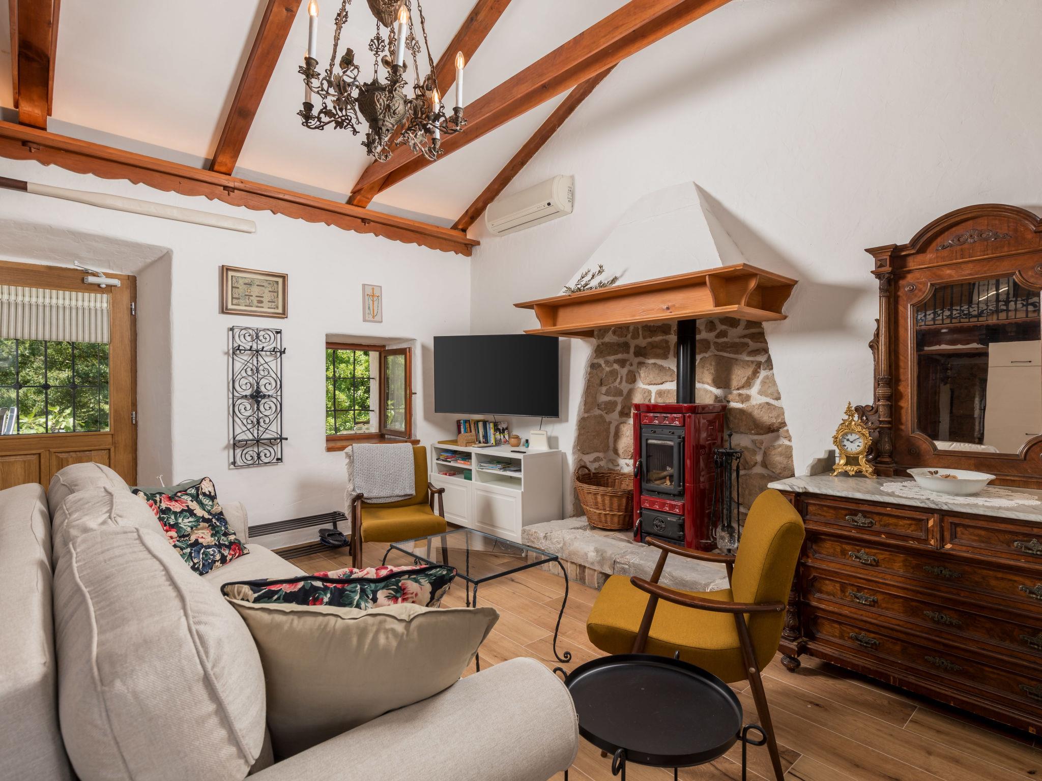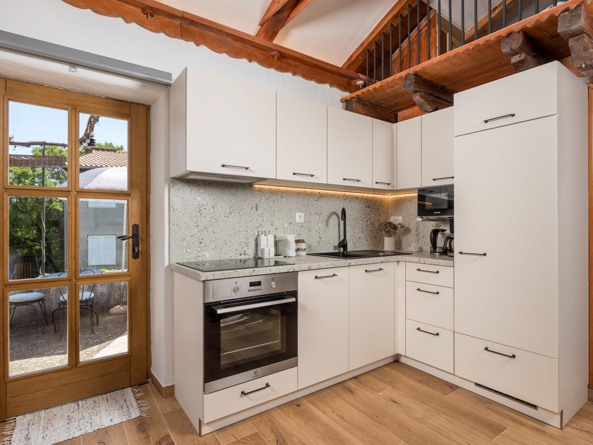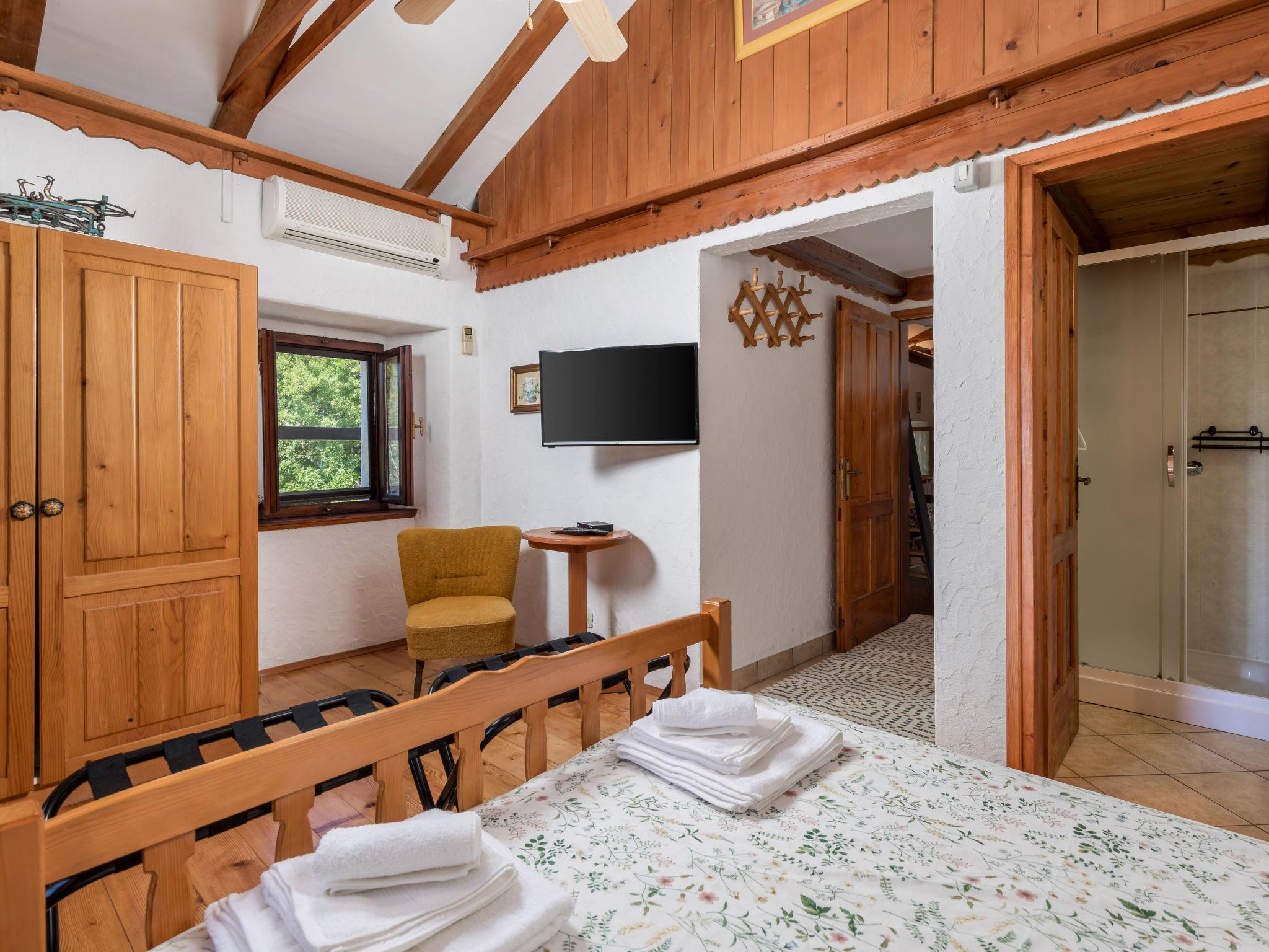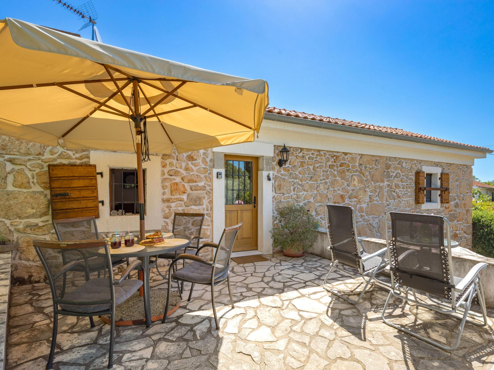 2-room apartment 50 m2 on 1st floor. Living/sleeping room with 1 double sofabed, open-hearth fireplace, shower/WC, satellite TV and air conditioning. Exit to the terrace. 1 room with 1 french bed (160 cm, length 200 cm), shower/WC, TV and air conditioning. Open kitchen (4 hot plates, oven, dishwasher, toaster, kettle, microwave, freezer, electric coffee machine). Electric heating, forced-air heating. Terrace 12 m2, terrace 16 m2. Terrace furniture, deck chairs. Facilities: children's high chair, baby cot (extra), hair dryer. Internet (WiFi, free). Please note: non-smoking house. Private entrance, smoke alarm, fire extinguisher. UPRAVNI ODJEL ZA TURIZAM, PODUZETNIŠTVO I RURALNI
