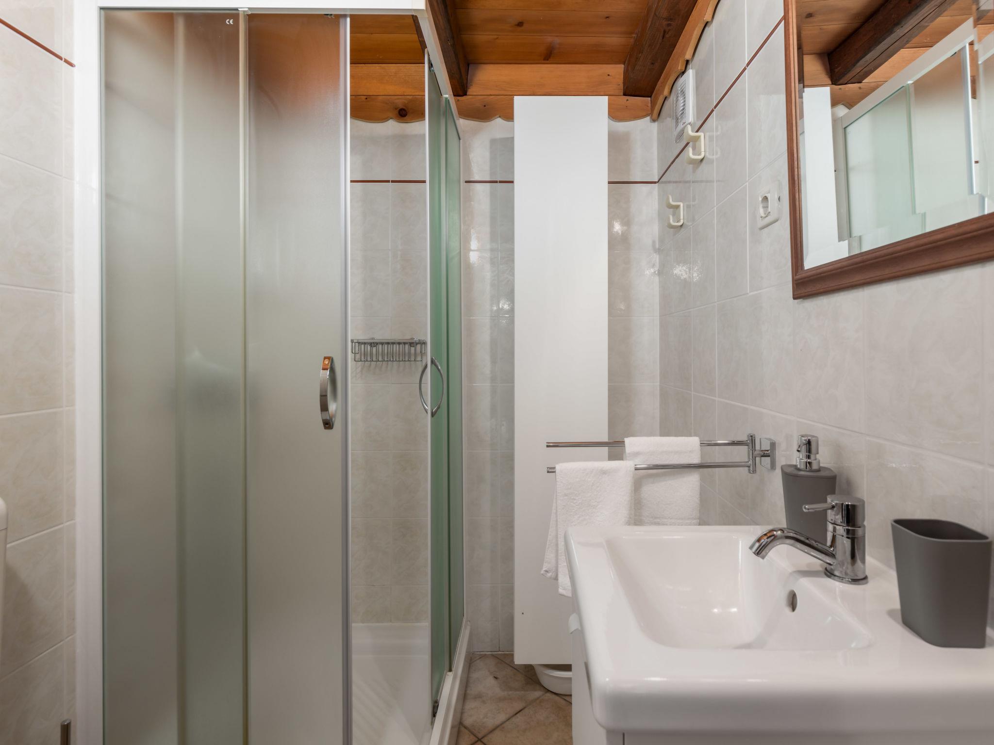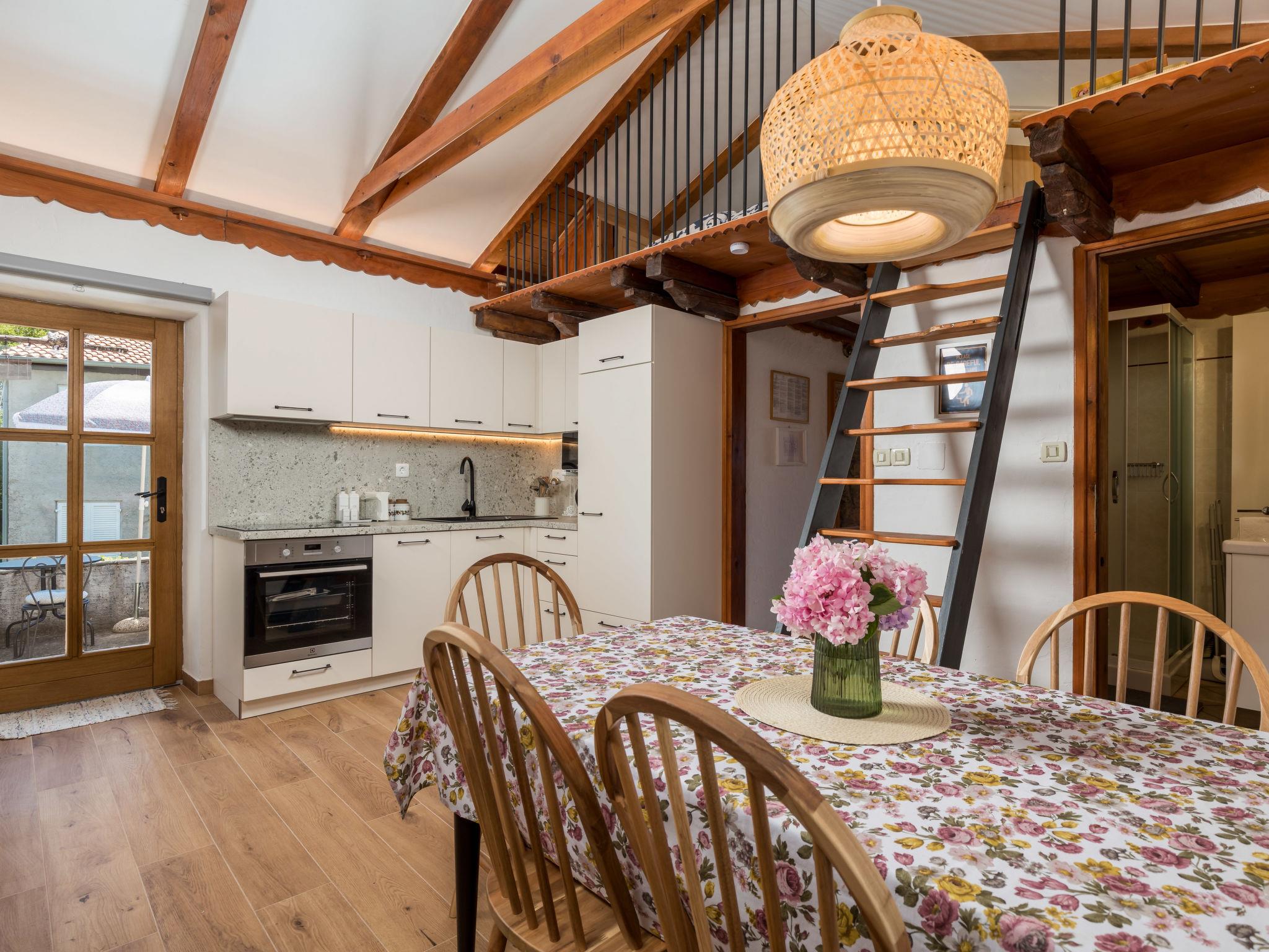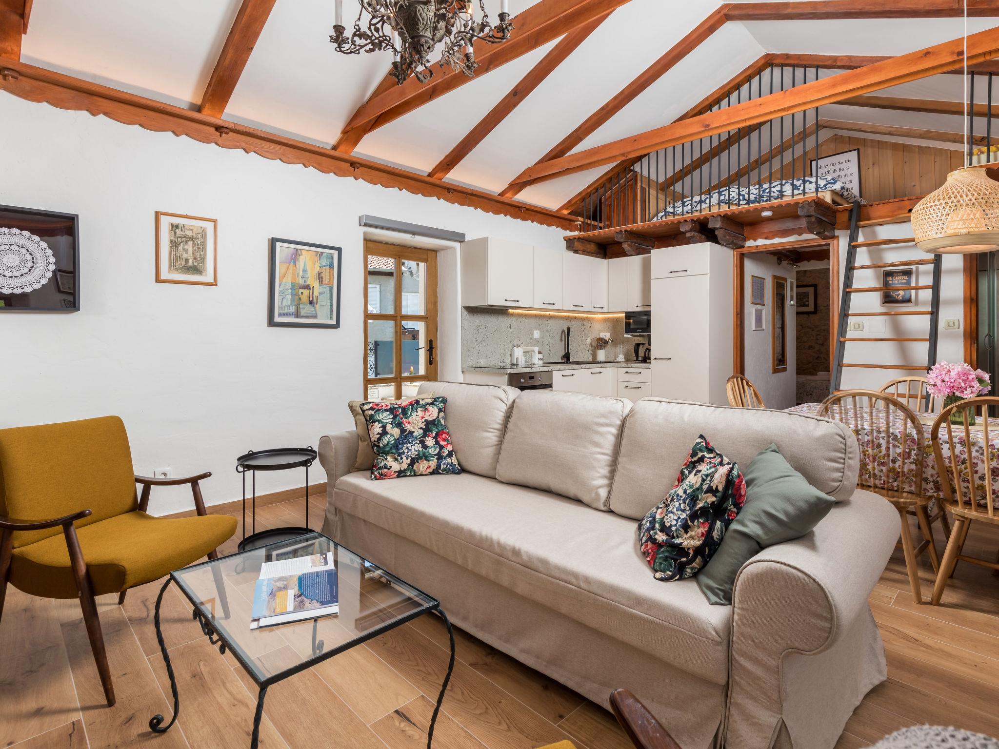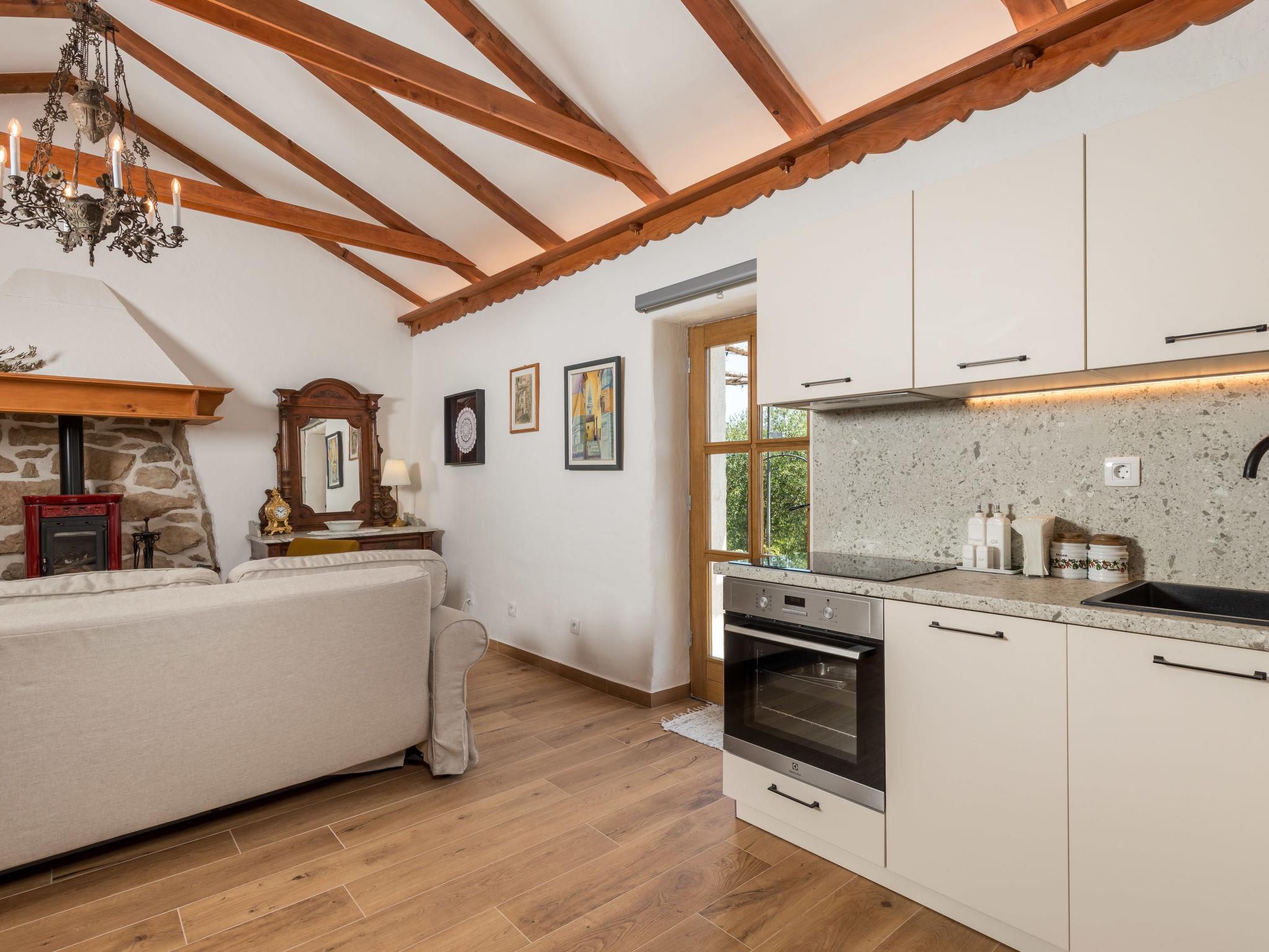 2-room apartment 50 m2 on 1st floor. Living/sleeping room with 1 double sofabed, open-hearth fireplace, shower/WC, satellite TV and air conditioning. Exit to the terrace. 1 room with 1 french bed (160 cm, length 200 cm), shower/WC, TV and air conditioning. Open kitchen (4 hot plates, oven, dishwasher, toaster, kettle, microwave, freezer, electric coffee machine). Electric heating, forced-air heating. Terrace 12 m2, terrace 16 m2. Terrace furniture, deck chairs. Facilities: children's high chair, baby cot (extra), hair dryer. Internet (WiFi, free). Please note: non-smoking house. Private entrance, smoke alarm, fire extinguisher. UPRAVNI ODJEL ZA TURIZAM, PODUZETNIŠTVO I RURALNI