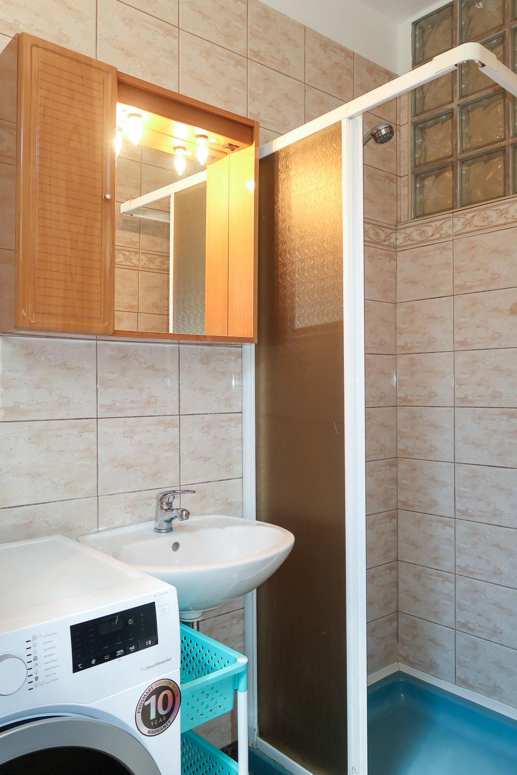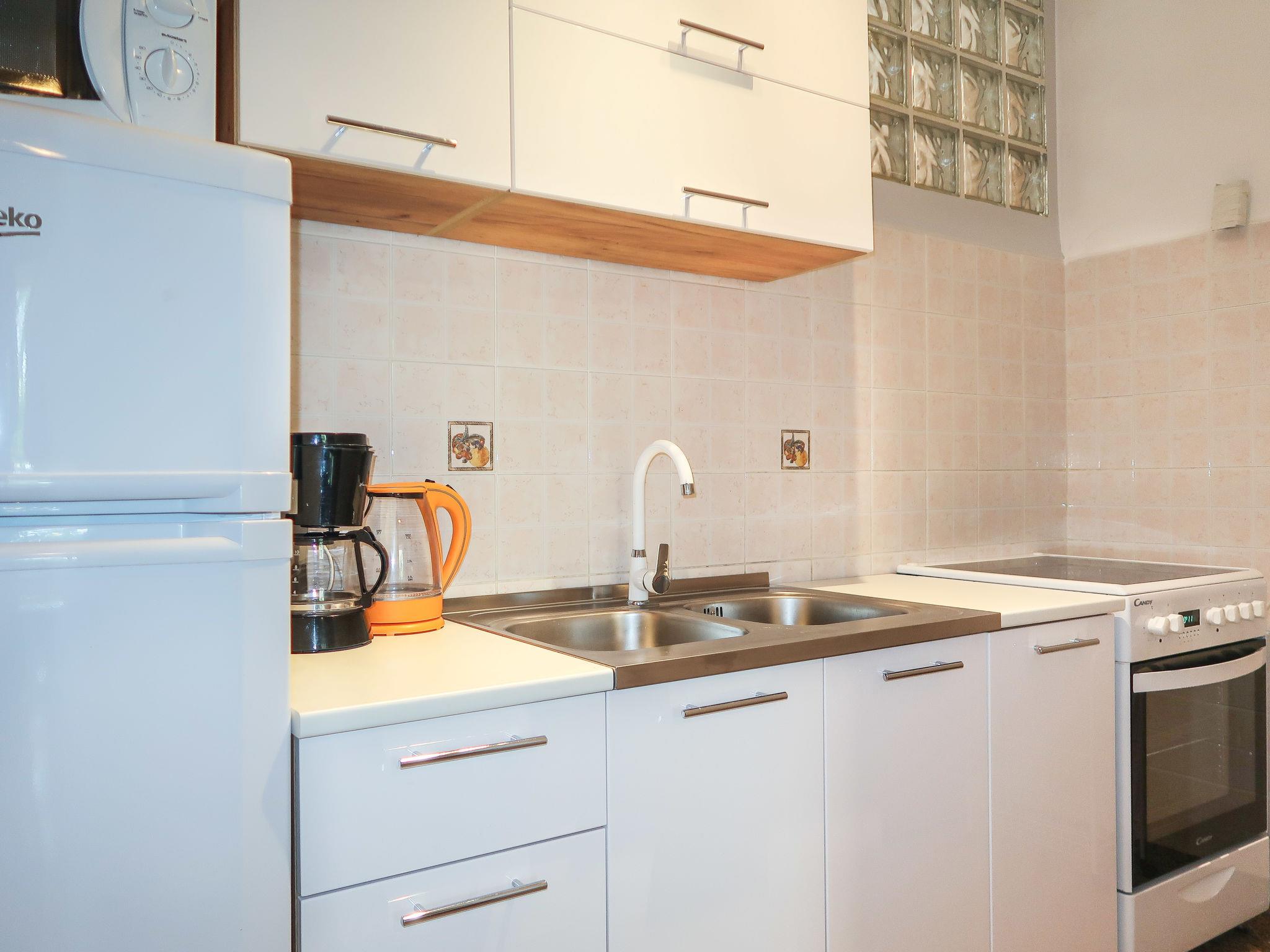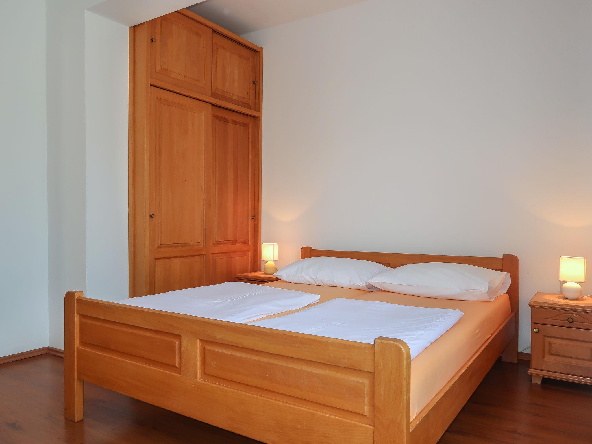 "Maravic", 3-room semi-detached house 70 m2 on 2 levels. Living/dining room with satellite TV. Exit to the terrace. Open kitchen (1 hot plate, oven, 3 gas rings, toaster, kettle, microwave, freezer, electric coffee machine). Shower/WC. Upper floor: 1 room with 1 bed (90 cm, length 200 cm), 1 double bed (2 x 80 cm, length 200 cm), air conditioning. Exit to the balcony. 1 room with 1 double bed (2 x 80 cm, length 200 cm), air conditioning. Exit to the balcony. Sep. WC. No heating option. Balcony 15 m2, balcony terrace 15 m2, roofed. Terrace furniture, balcony furniture, deck chairs. Facilities: Internet (WiFi, free). Please note: non-smoking house. Maximum 1 pet/ dog allowed. Private entrance.