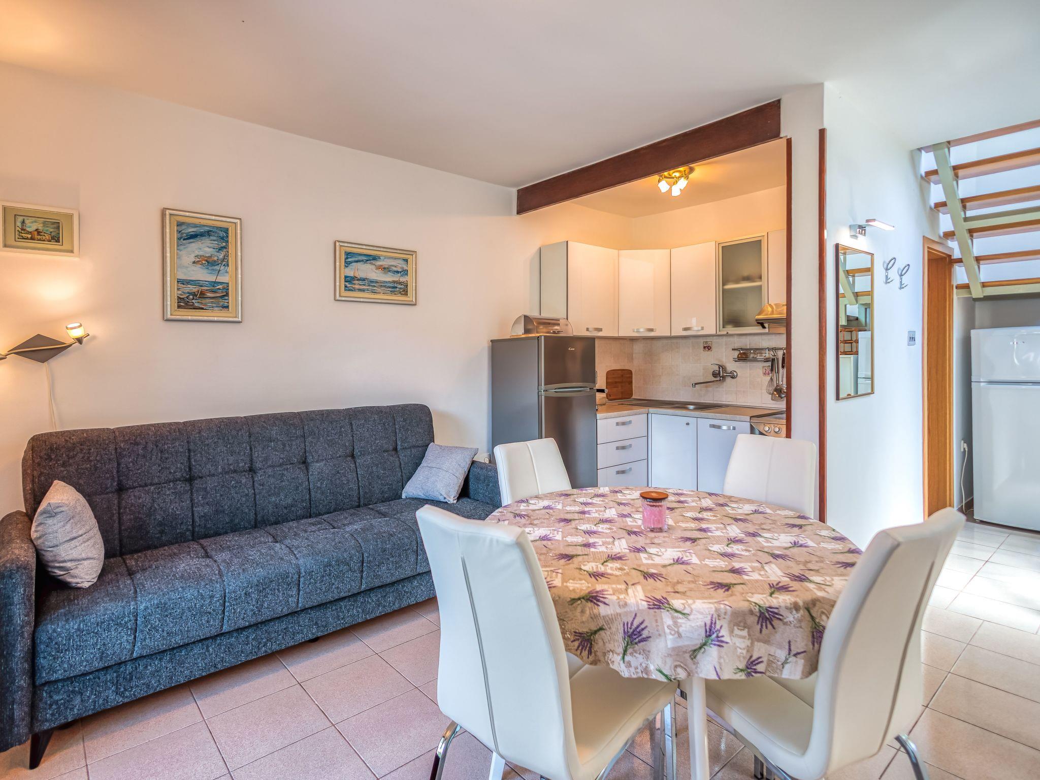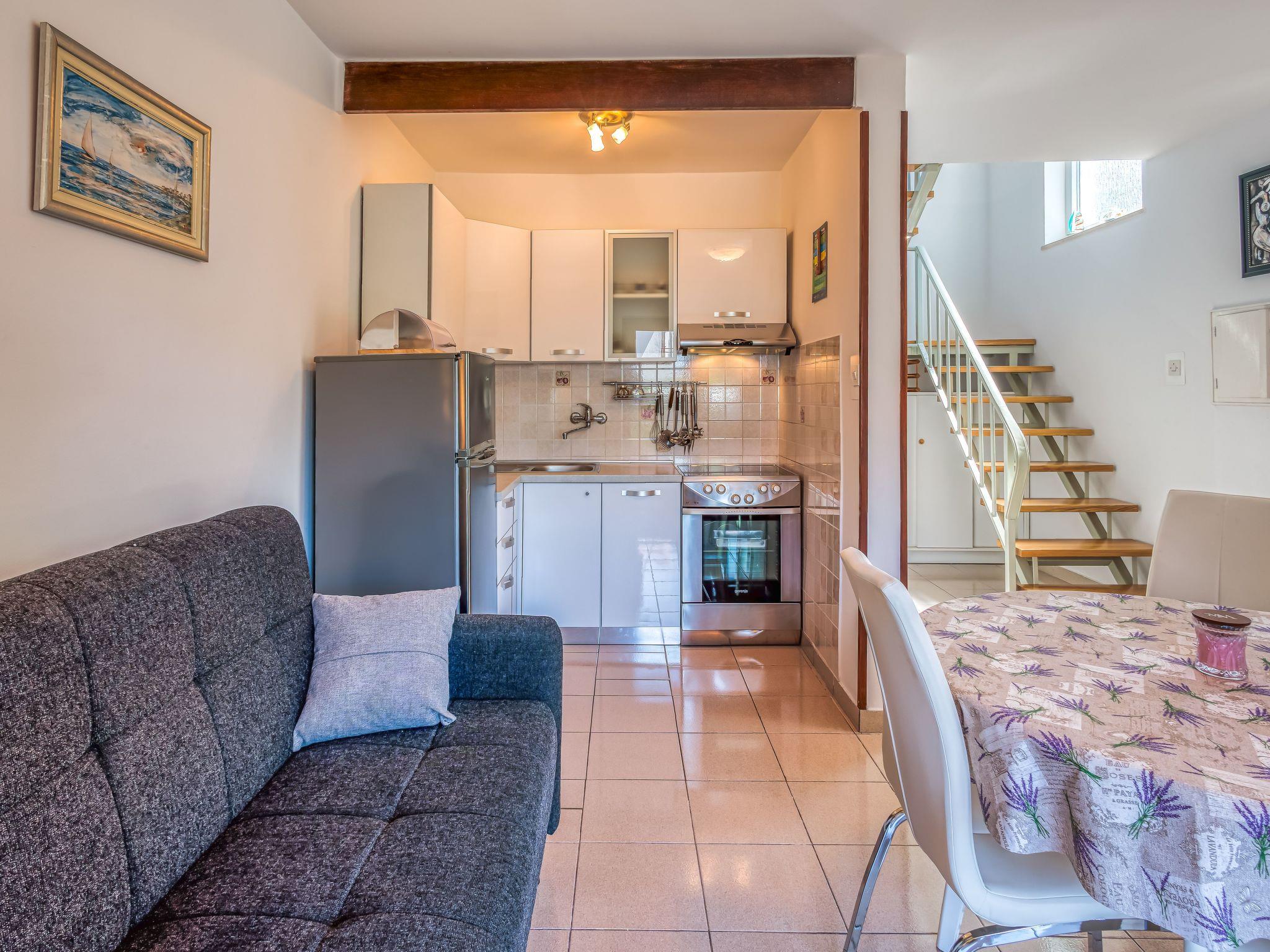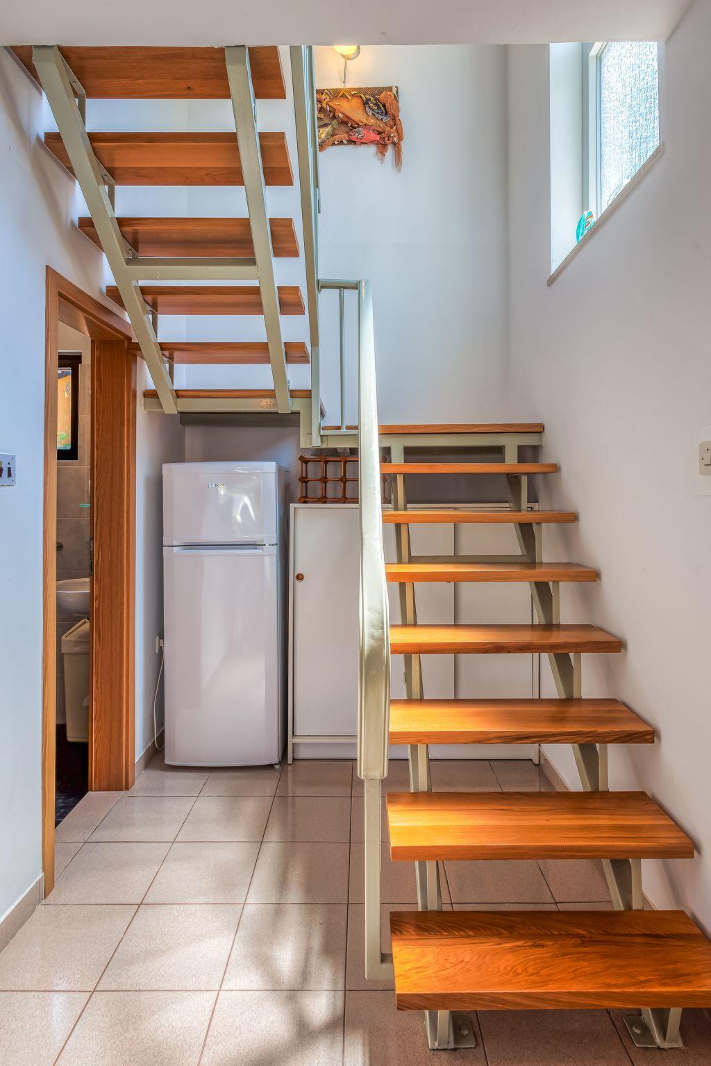 The 80m² apartment consists of a living room-kitchen, two bedrooms, a bathroom and a terrace. The air-conditioned living room comprises a comfortable sitting area with a leather sofa, a TV and a dining table, as well as an open cooking corner equipped with a stove, oven, coffee machine, fridge and espresso pot. The two bedrooms on the upper floor provide a double bed 160cm wide and two single beds 90cm wide. Bathroom has light tiles and is fitted with a shower, WC, hairdryer and washing machine. The apartment has a wireless Internet connection. Pets are not allowed.