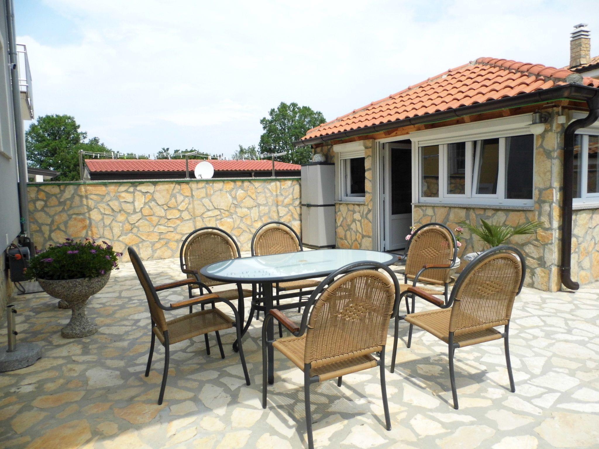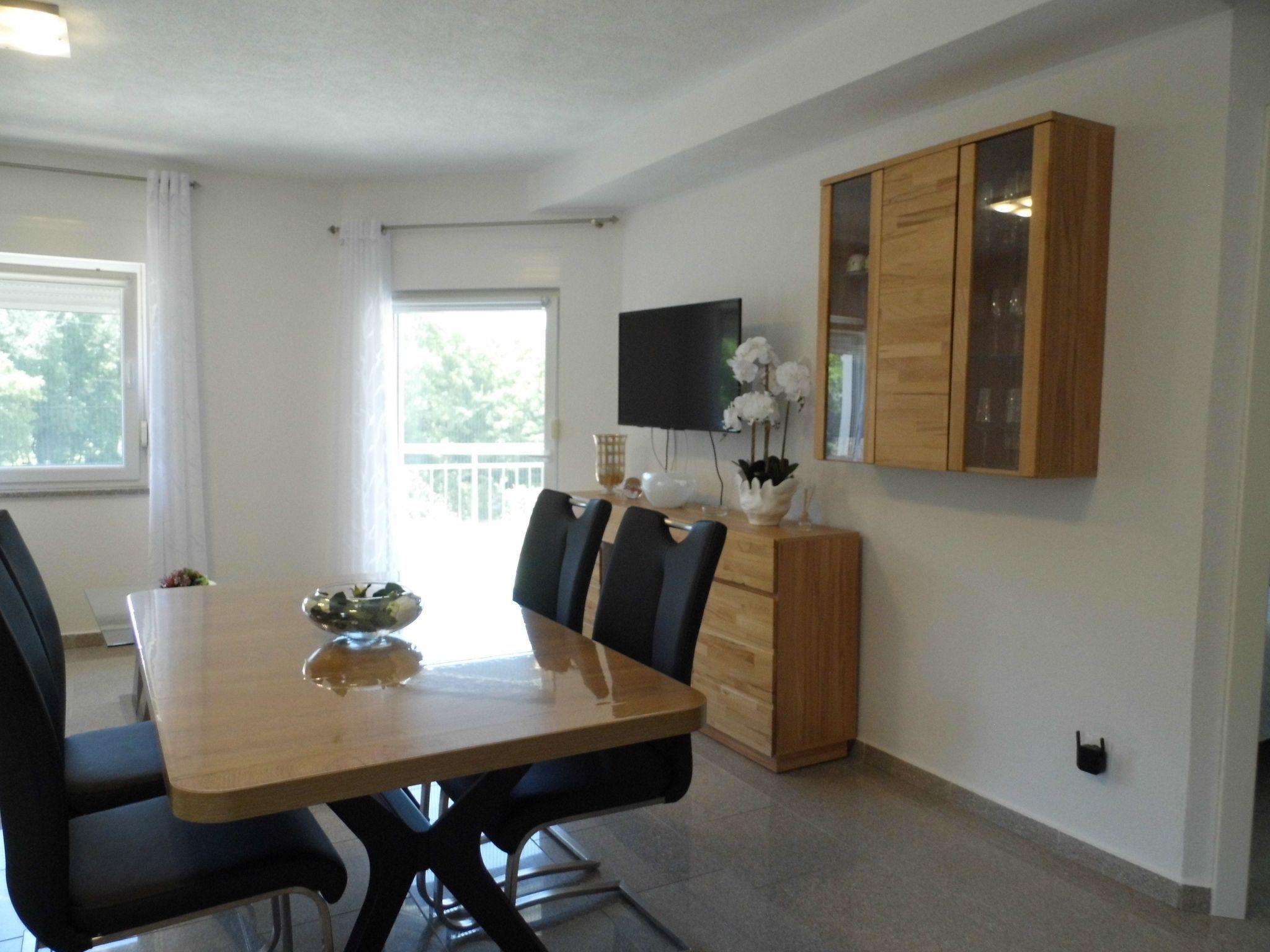 There is dinning table with chairs for all. Kitchen and dinning area are connected (same space) with living room, where is Sat Tv, air condition, sofa where can be prepared an extra bed suitable only for child till 12 years old.