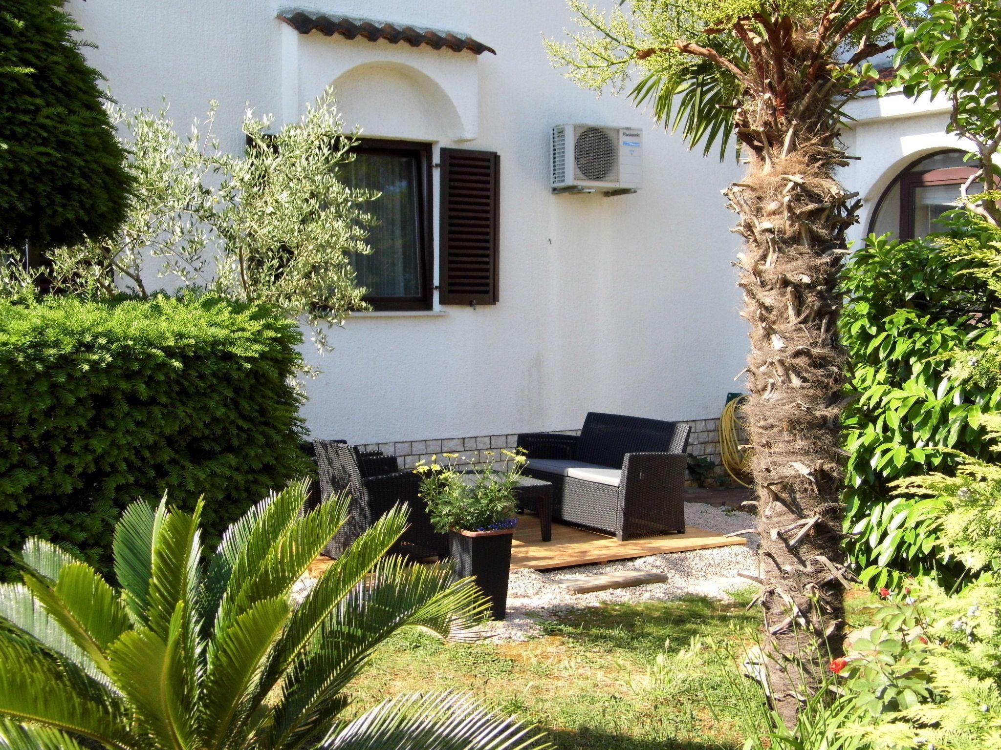 Outside, the apartment boasts not one, but two outdoor spaces for your enjoyment. The balcony, adjacent to the kitchen, provides a splendid view of the sea and is furnished with a sunshade for those sunny afternoons, while the terrace in the garden comes complete with outdoor furniture, offering another charming spot for relaxation or dining al fresco.