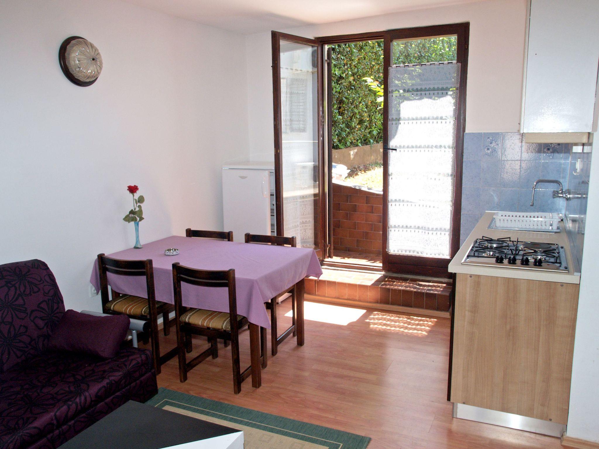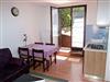 The studio is on the ground floor and can accommodate three persons. The sleeping area is furnished with a double bed, a single bed and a wardrobe. The bathroom consists of a shower, washbasin and toilet. The living room and kitchen area provides a sofa, a coffee table and a dining table with four chairs. The kitchen unit is equipped with a gas stove, fridge with freezer compartment, microwave and coffee machine.