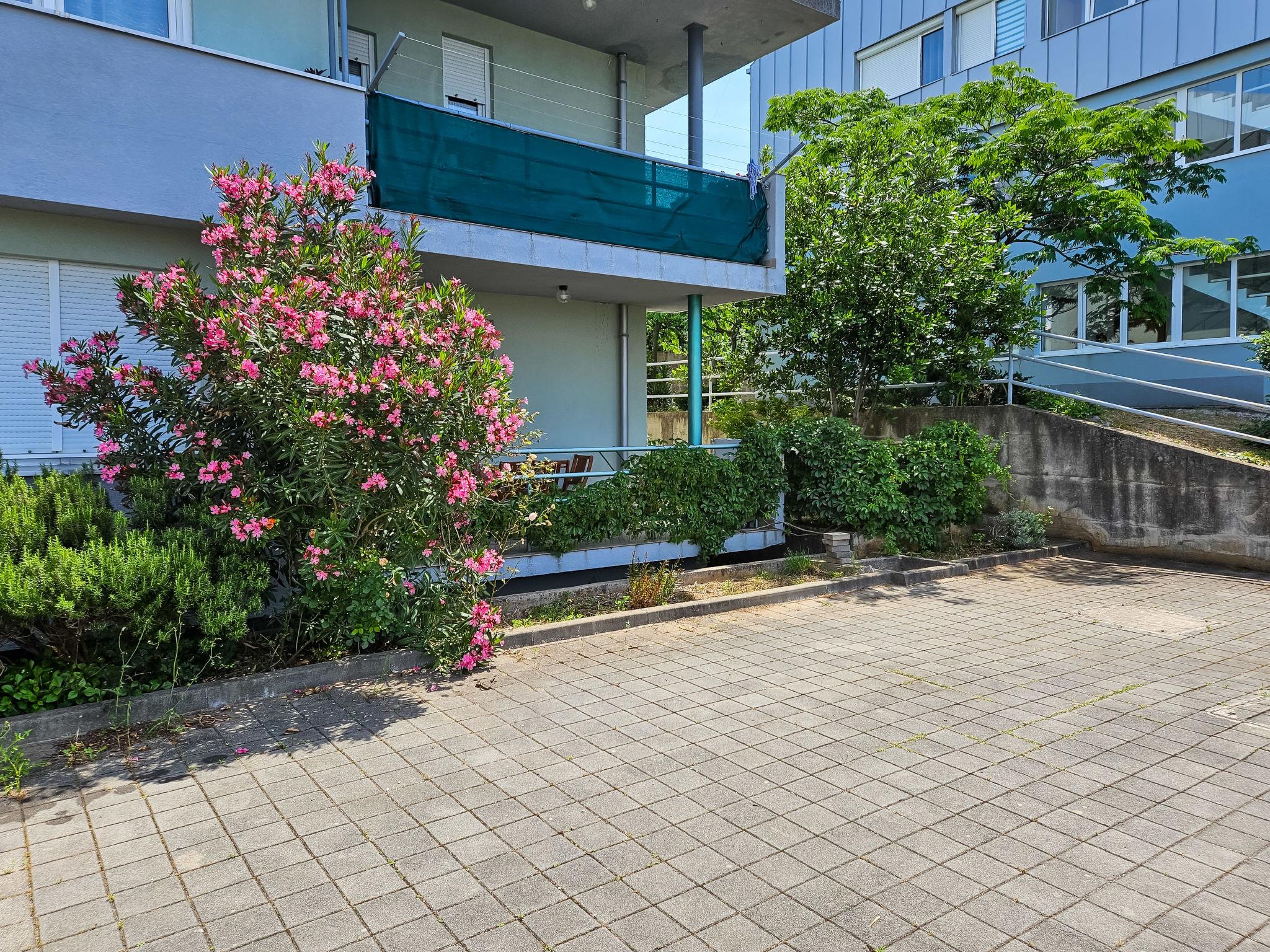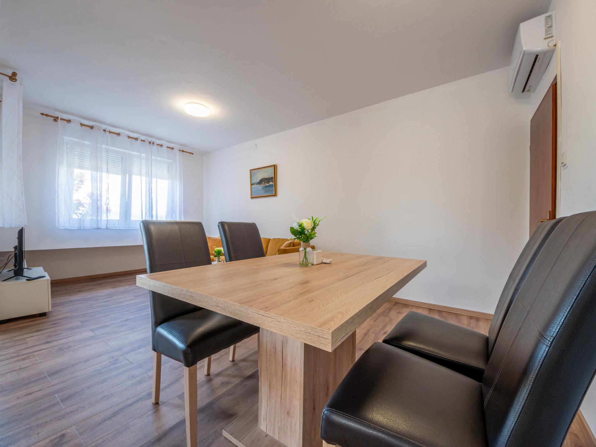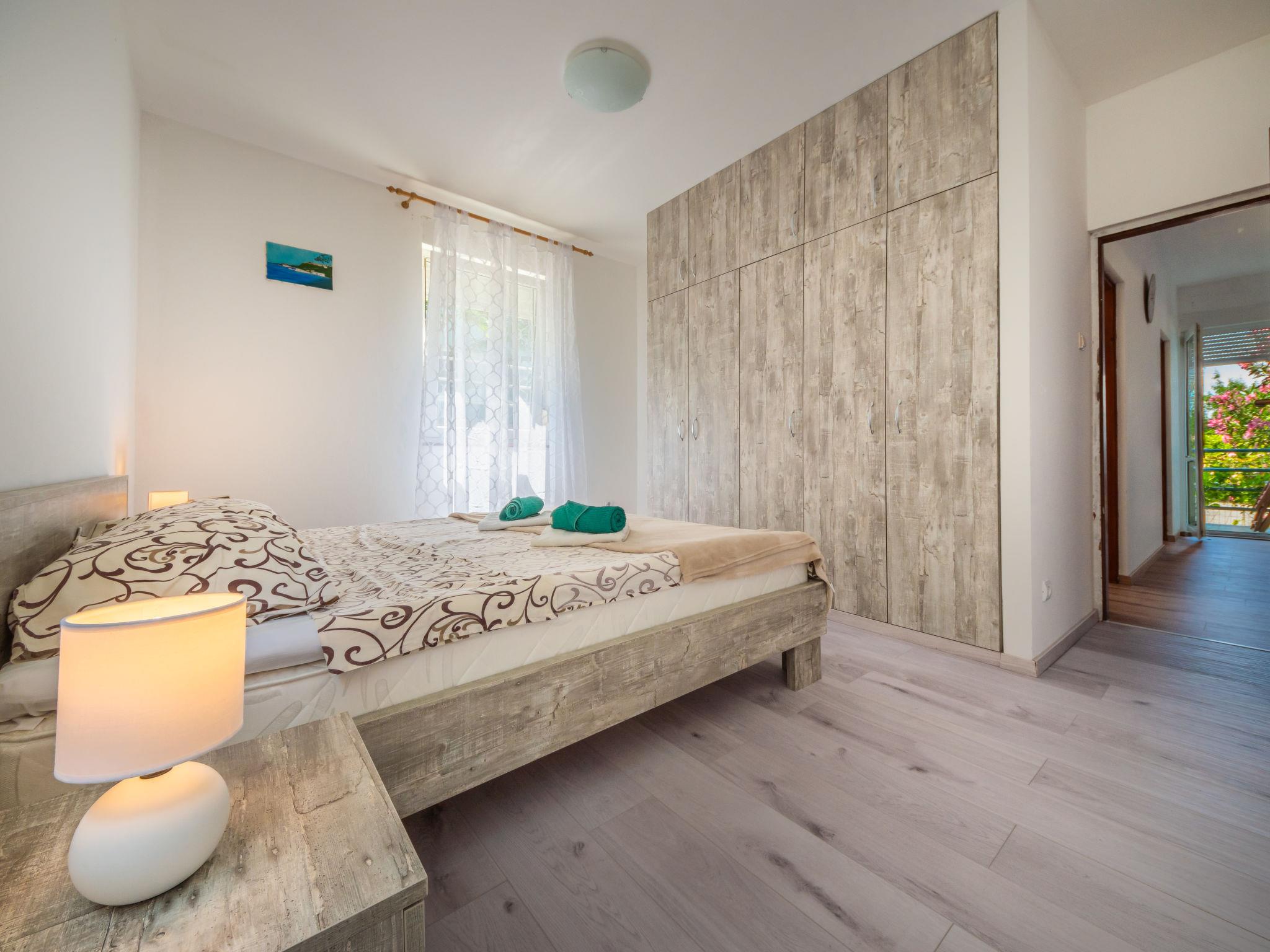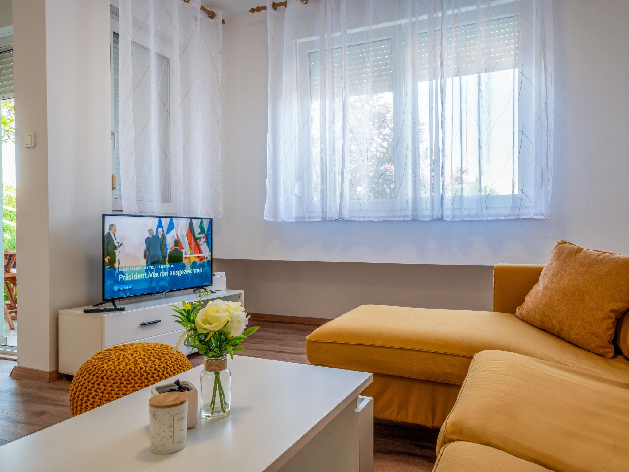 3-room apartment 68 m2, on the ground floor, south-west facing position. Partly renovated in 2024: living/dining room with cable TV, digital TV and air conditioning. Exit to the terrace. 1 room with 1 double bed (2 x 90 cm, length 200 cm). 1 room with 2 beds (80 cm, length 200 cm). Open kitchen (1 hot plate, oven, dishwasher, Gas stove, 3 gas rings, microwave, freezer). Shower/WC. No heating option. Terrace 8 m2, roofed. Terrace furniture, barbecue (portable). Partial view of the sea. Facilities: Internet (WiFi, free). Parking (1 car). Please note: private entrance.