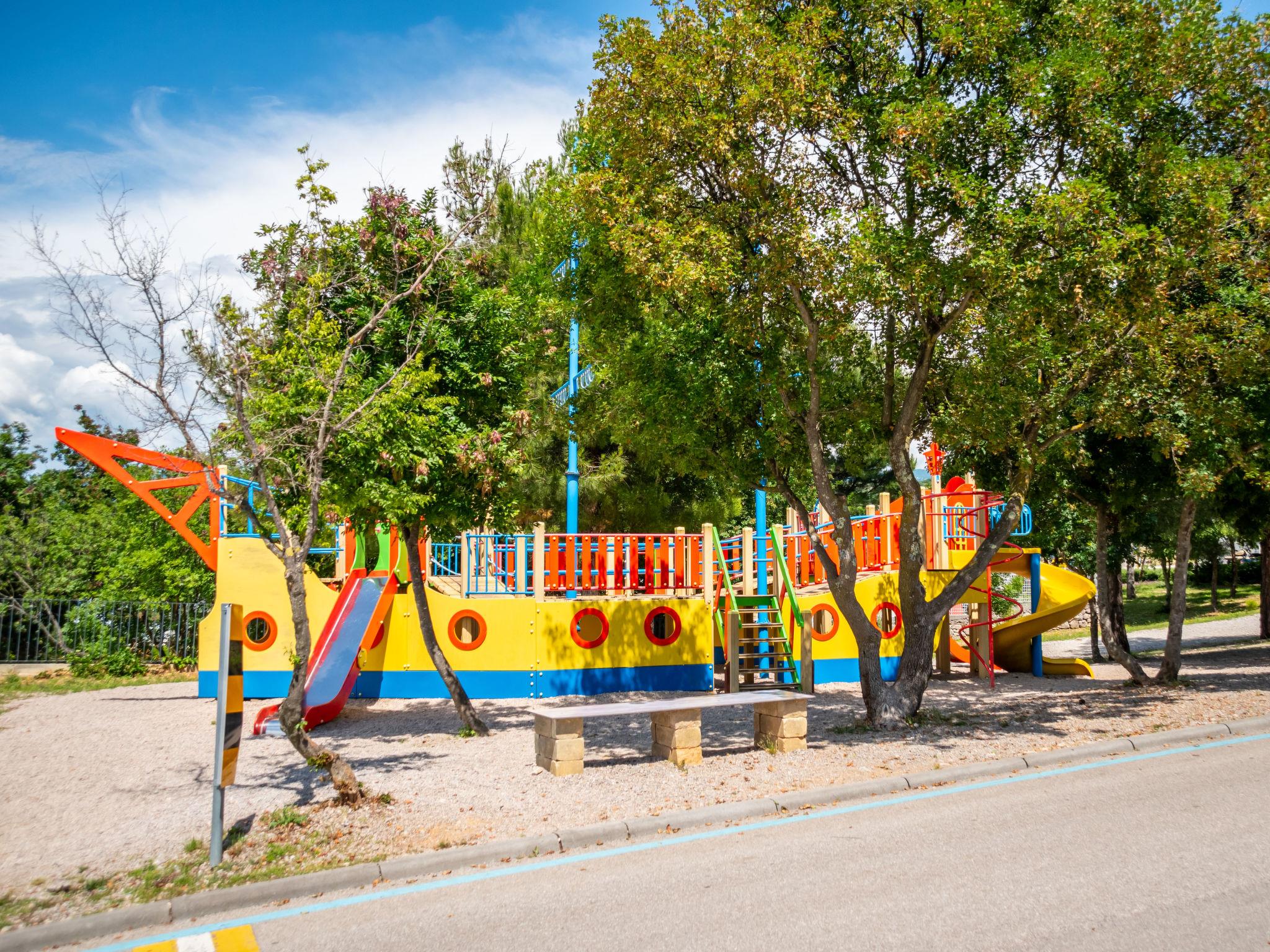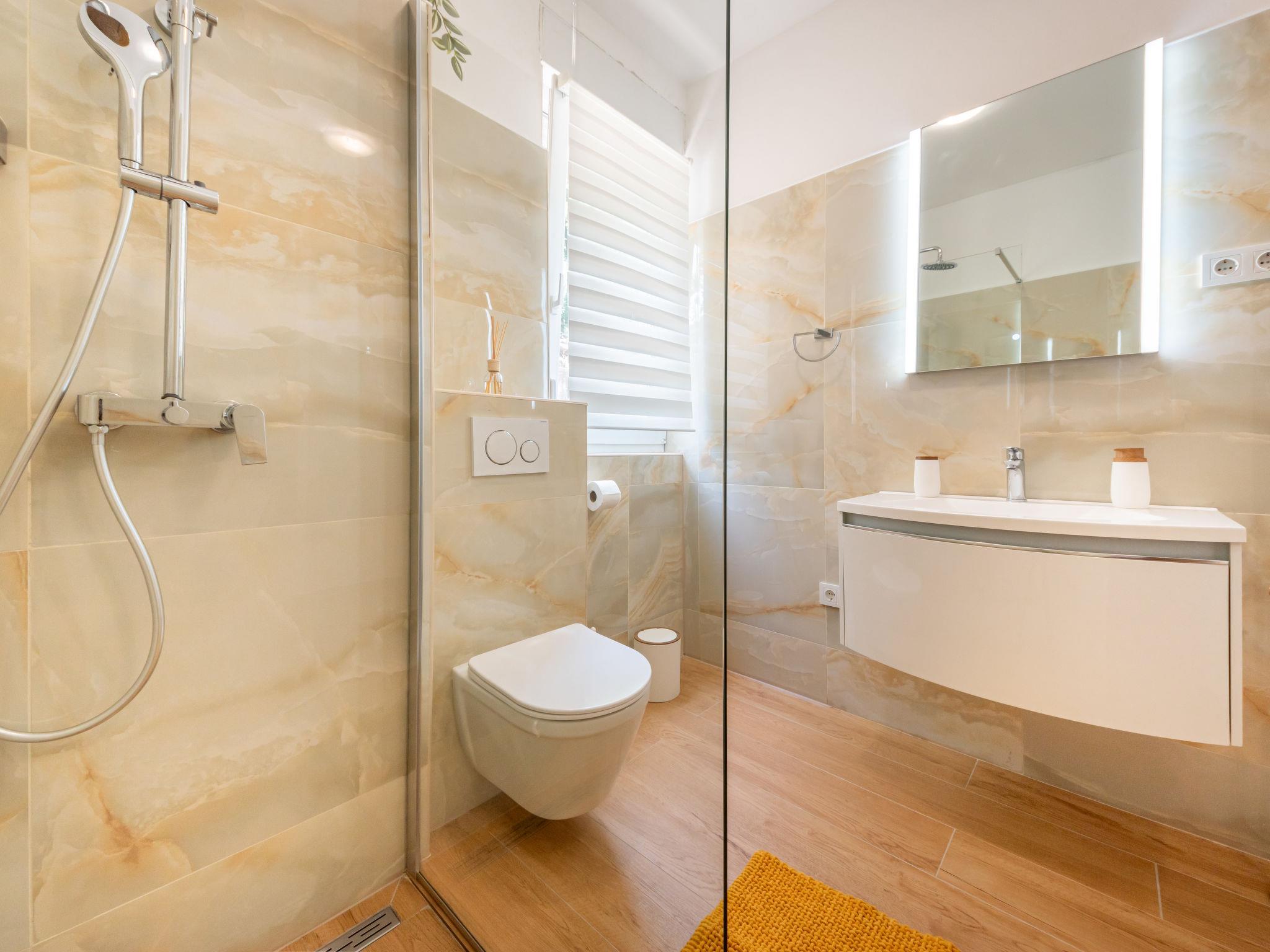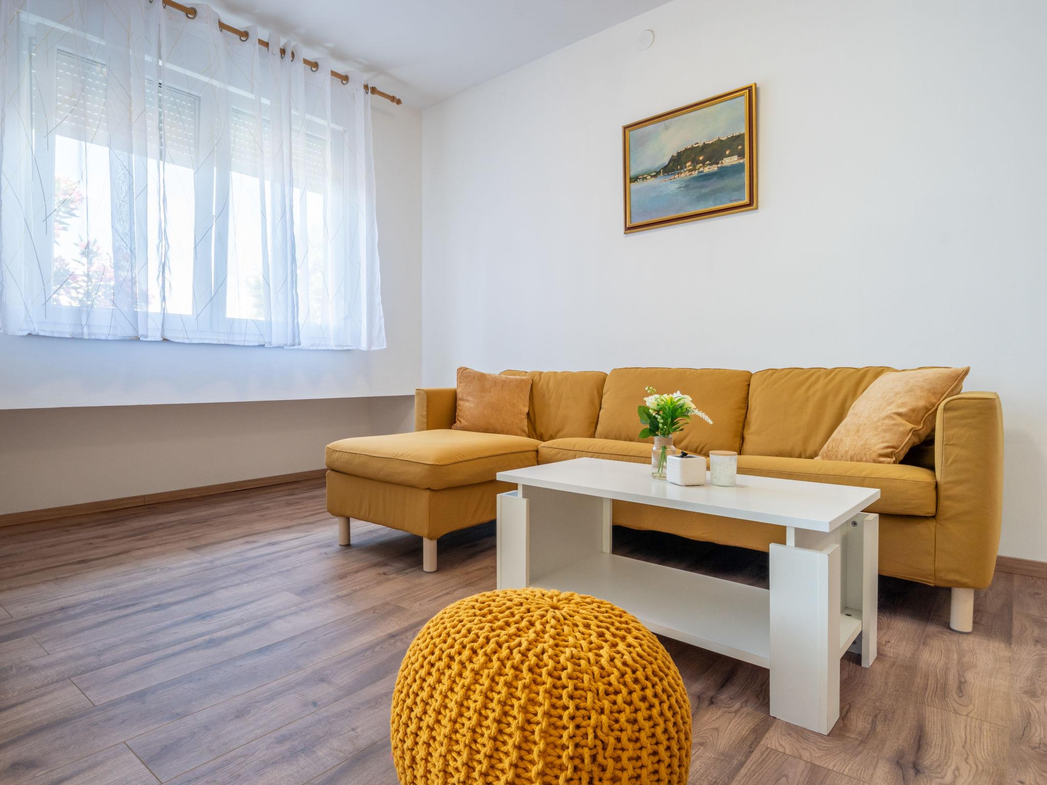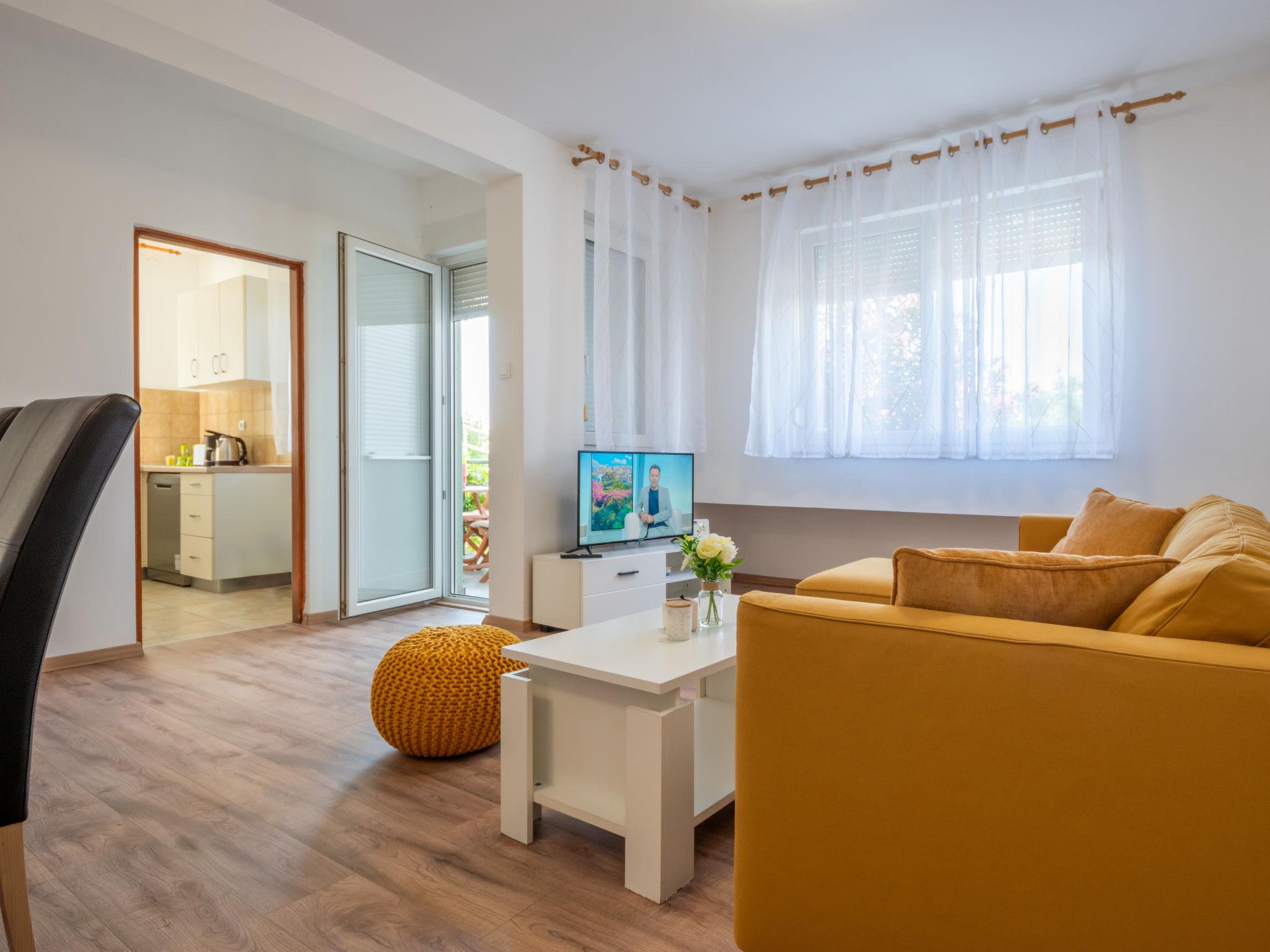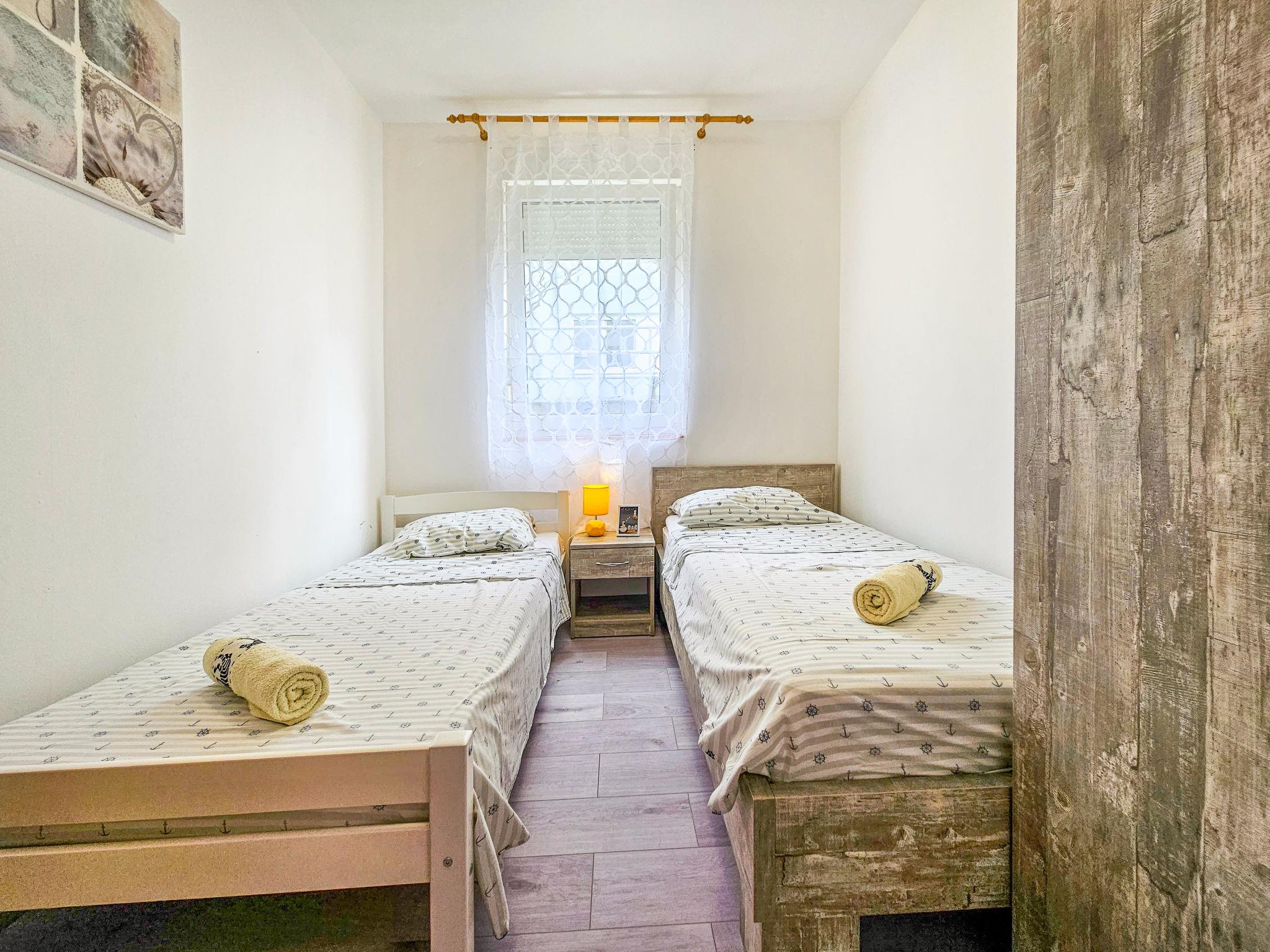 3-room apartment 68 m2, on the ground floor, south-west facing position. Partly renovated in 2024: living/dining room with cable TV, digital TV and air conditioning. Exit to the terrace. 1 room with 1 double bed (2 x 90 cm, length 200 cm). 1 room with 2 beds (80 cm, length 200 cm). Open kitchen (1 hot plate, oven, dishwasher, Gas stove, 3 gas rings, microwave, freezer). Shower/WC. No heating option. Terrace 8 m2, roofed. Terrace furniture, barbecue (portable). Partial view of the sea. Facilities: Internet (WiFi, free). Parking (1 car). Please note: private entrance.