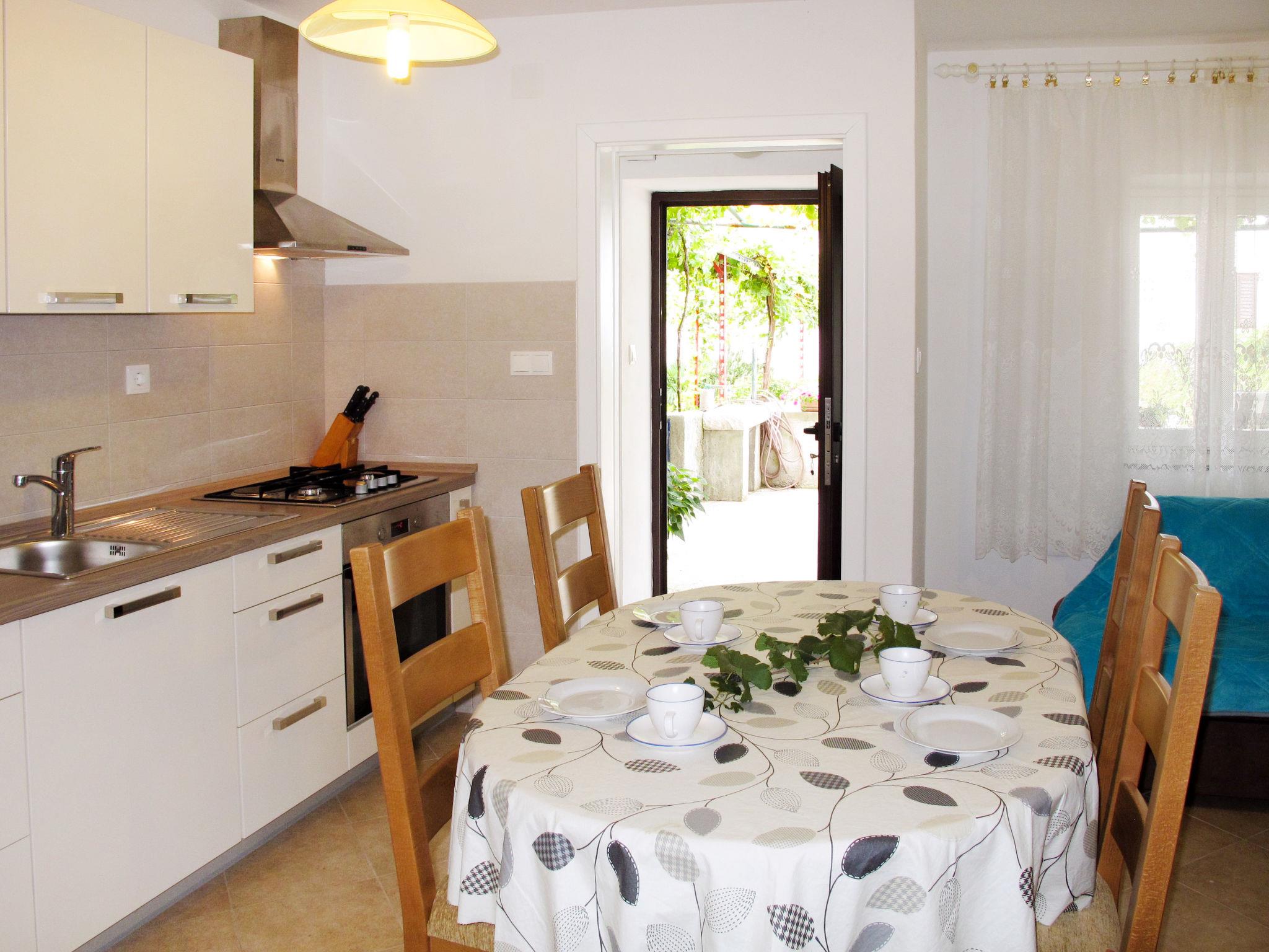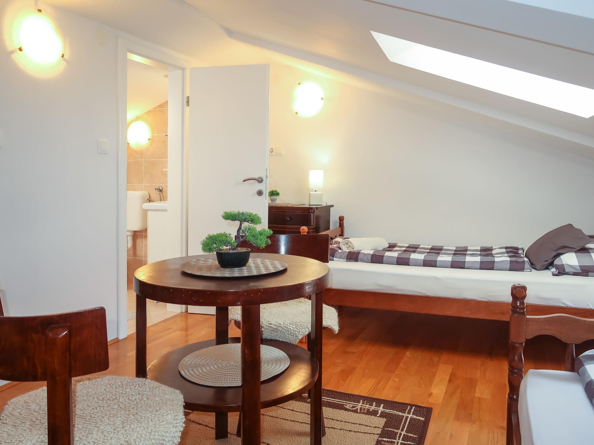 3-room terraced house 70 m2 on 3 levels. Living/dining room with 1 sleeping facility, satellite TV and air conditioning. Open kitchen (1 hot plate, oven, 3 gas rings, toaster, kettle, microwave, freezer, electric coffee machine). Shower/WC. Upper floor: 1 room with 1 double bed (2 x 90 cm, length 200 cm), bath/WC and air conditioning. Top floor: (spiral staircase), 1 room with sloping ceilings, - 180 cm with 2 beds (90 cm, length 200 cm), bath/WC and air conditioning. Heating (extra), air-conditioning (extra). Facilities: safe, iron, baby cot. Internet (WiFi, free). Please note: non-smokers only. Low placed windows in the bedrooom with sloping ceilings. 1511 doh.iznam.soba-PUNAT 360