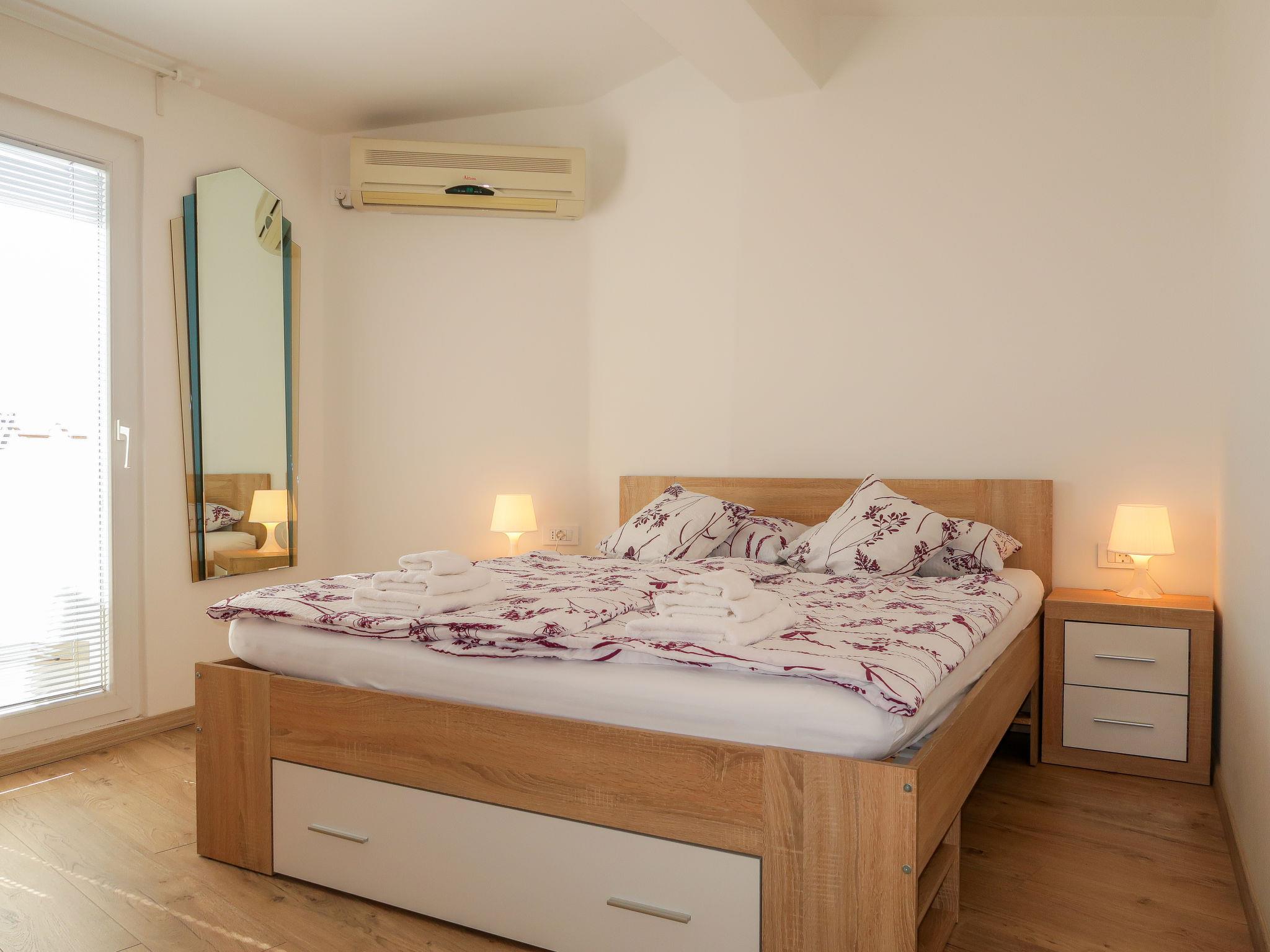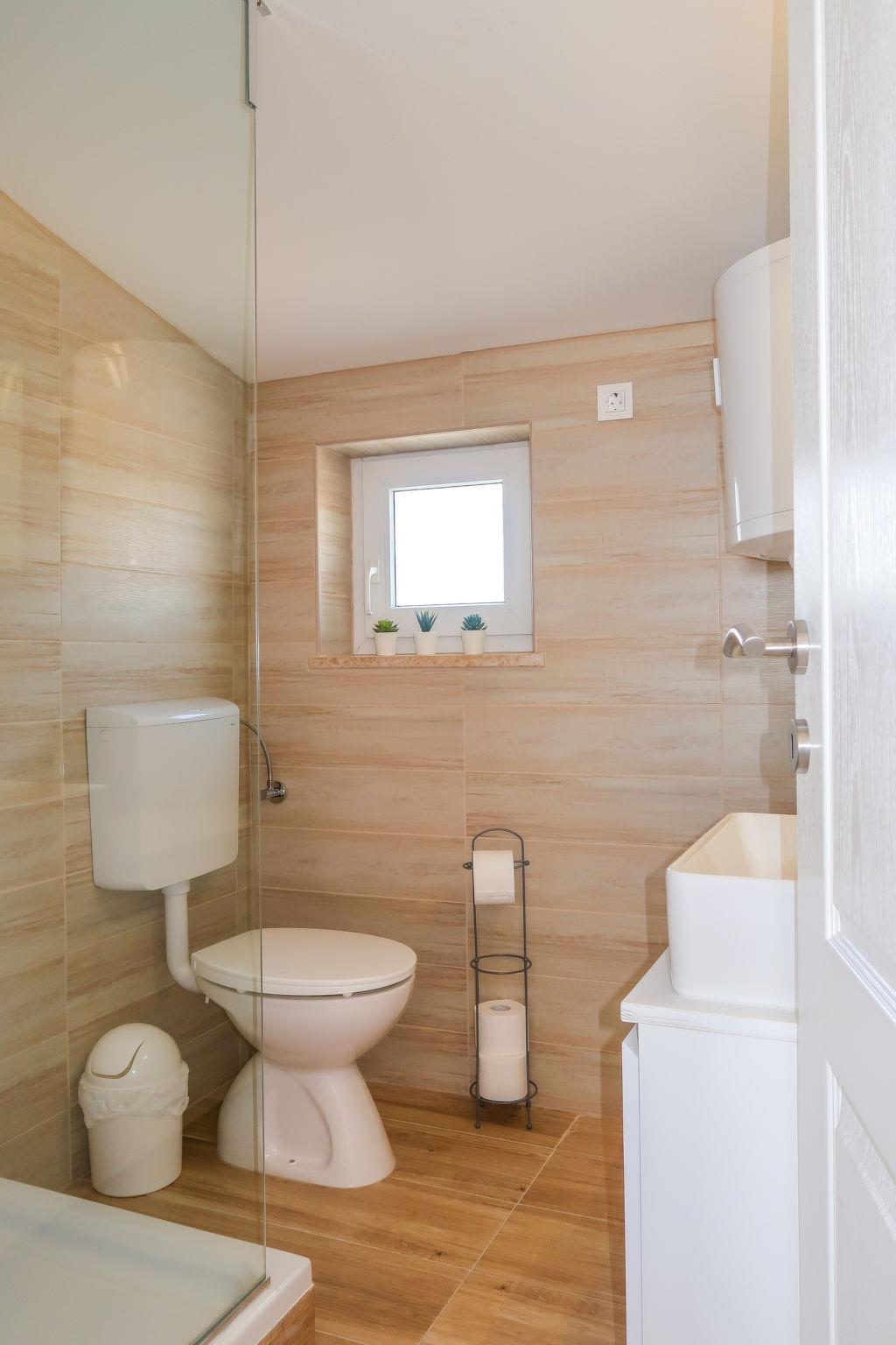"Barbara", 2-room apartment 32 m2 on 2nd floor. Object suitable for 2 adults + 2 children. 1 room with 1 french bed (160 cm, length 200 cm), TV and air conditioning. Exit to the terrace. 1 room with 2 beds (85 cm, length 185 cm). Kitchen-/living room (2 hot plates, toaster, kettle, microwave, electric coffee machine) with dining table. Exit to the terrace. Shower/WC. No heating option. Terrace 12 m2. Terrace furniture, barbecue, deck chairs. View of the sea. Facilities: Internet (WiFi, free). Maximum 3 pets/ dogs allowed.