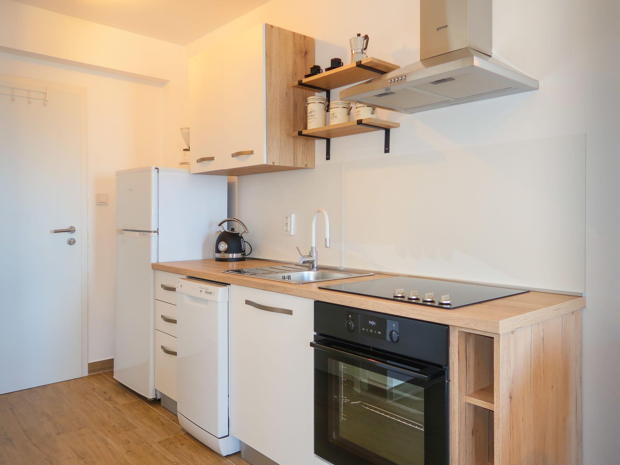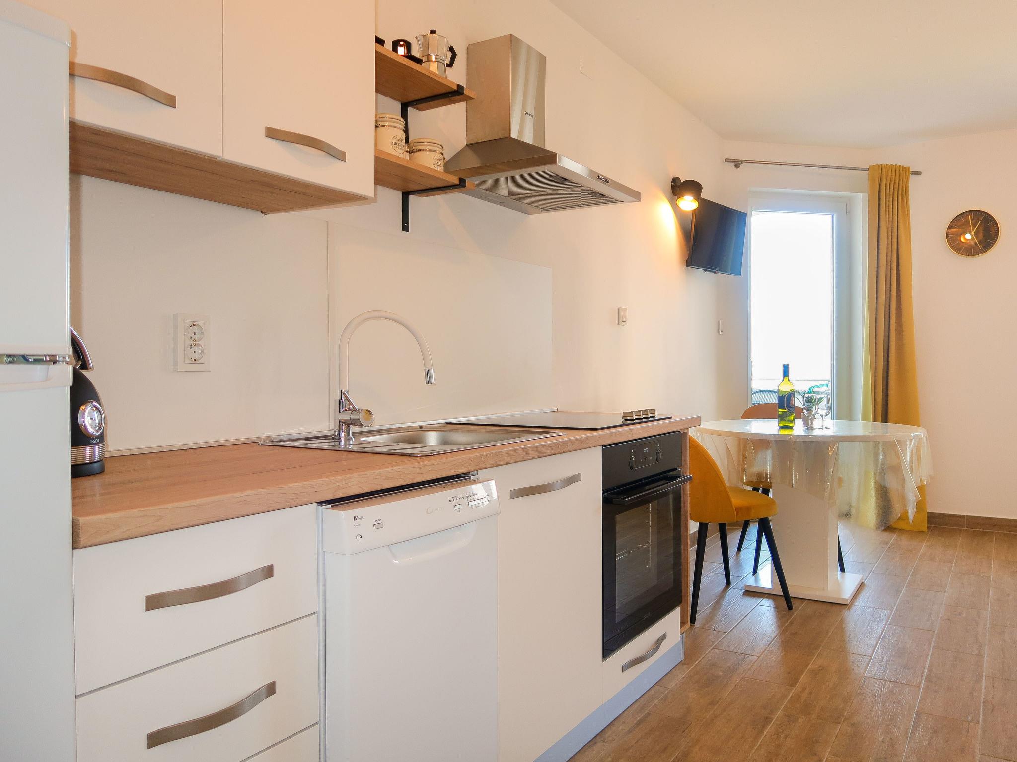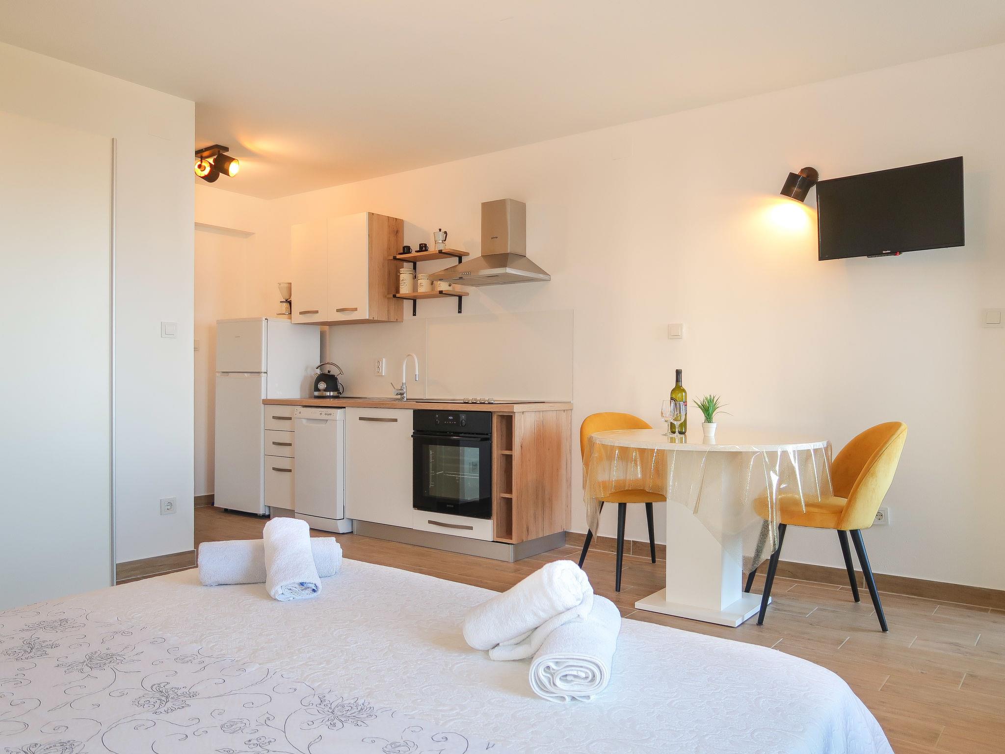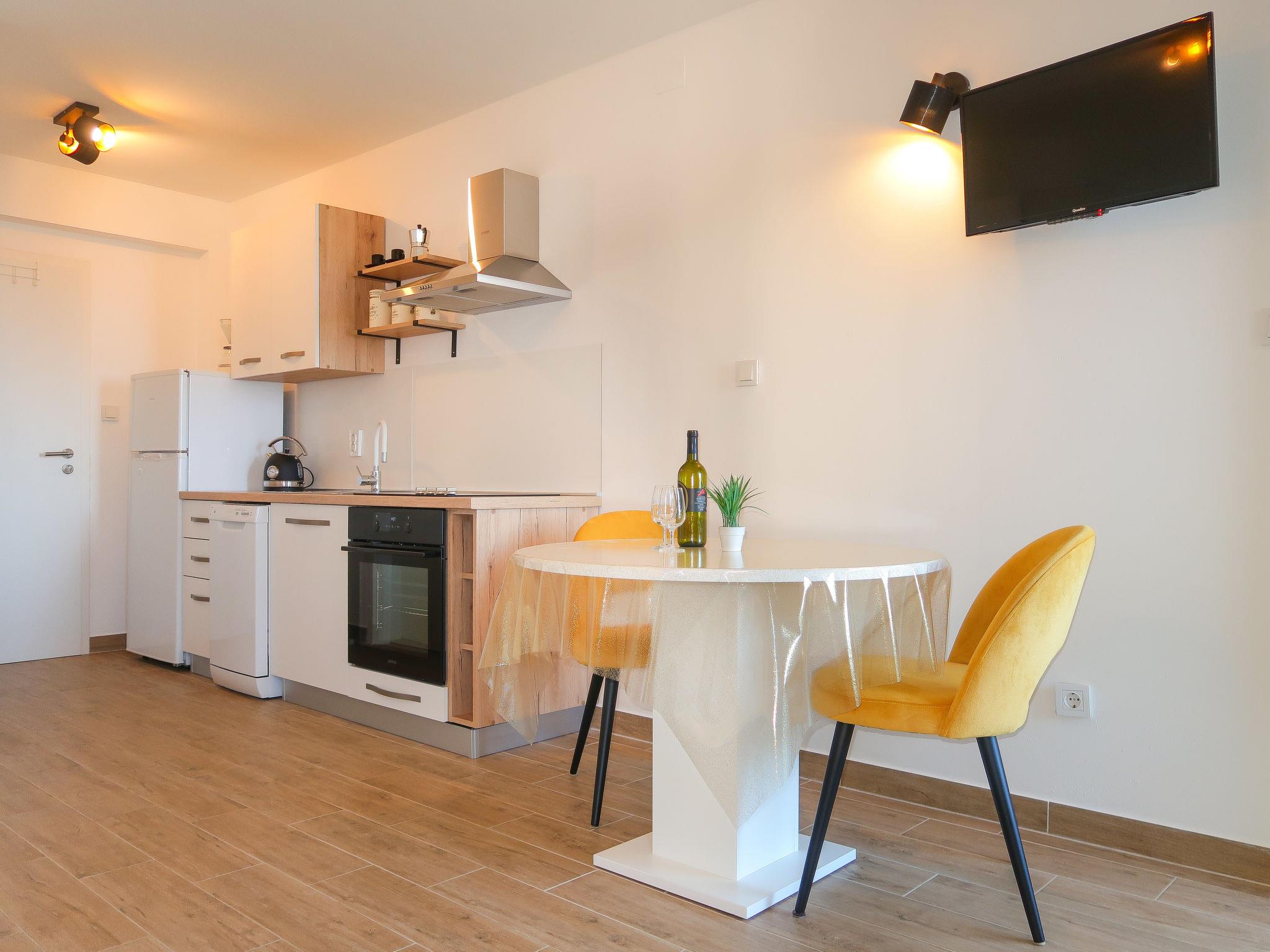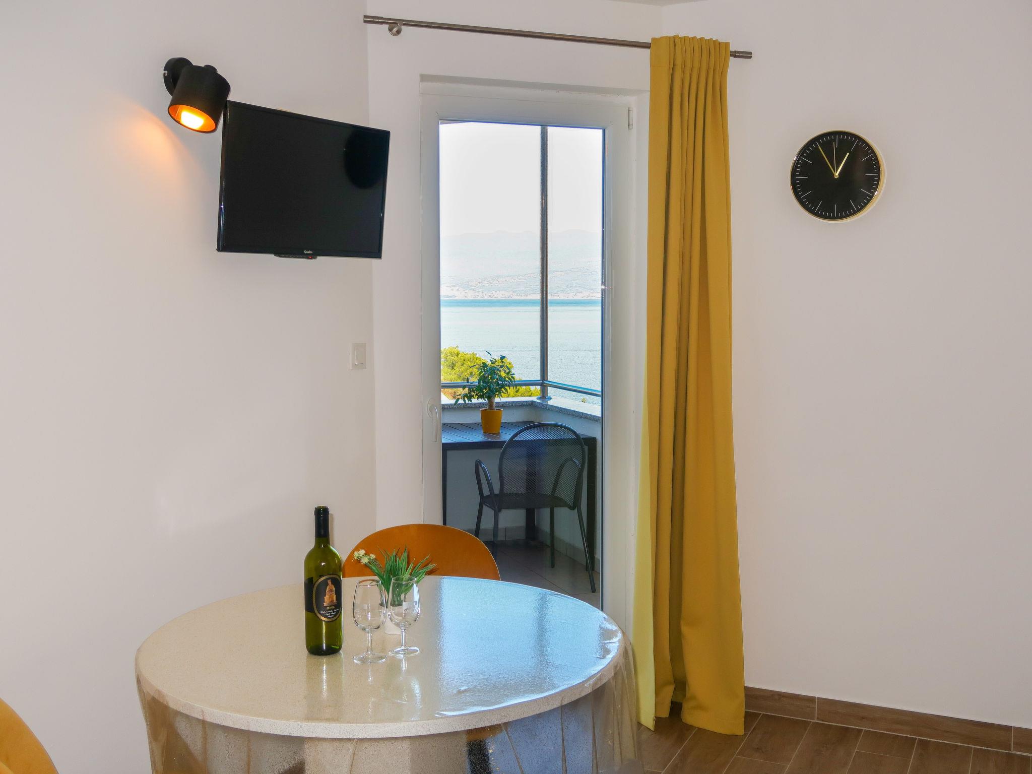 "Marija", 1-room apartment 27 m2 on 1st floor. Bright: living/sleeping room with 1 french bed (160 cm, length 200 cm), dining table, satellite TV and air conditioning. Exit to the balcony. Kitchenette (4 hot plates, oven, dishwasher, toaster, kettle, microwave, electric coffee machine). Shower/WC. Forced-air heating. Balcony. Balcony furniture. Very beautiful panoramic view of the sea and the mountains. Facilities: Internet (WiFi, free). Parking. Please note: non-smokers only.
