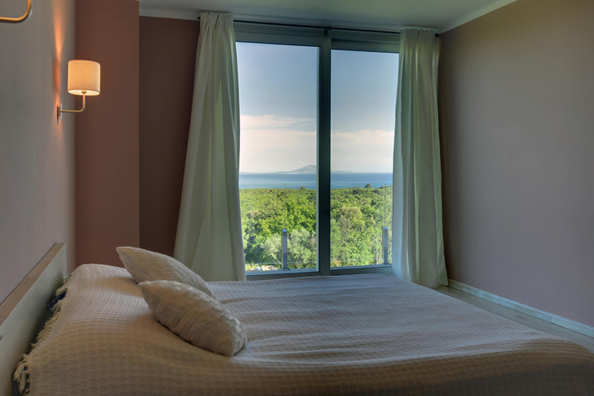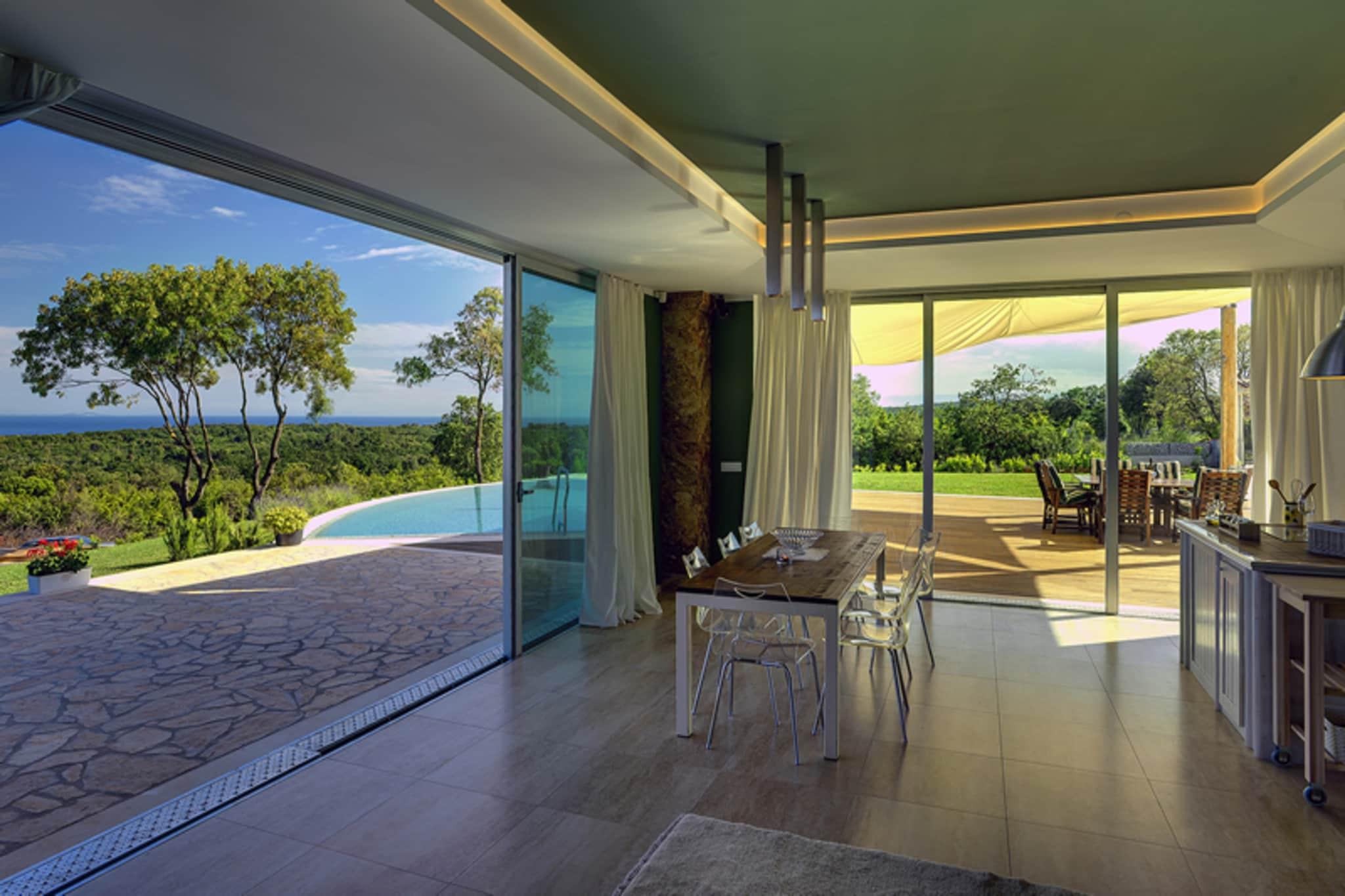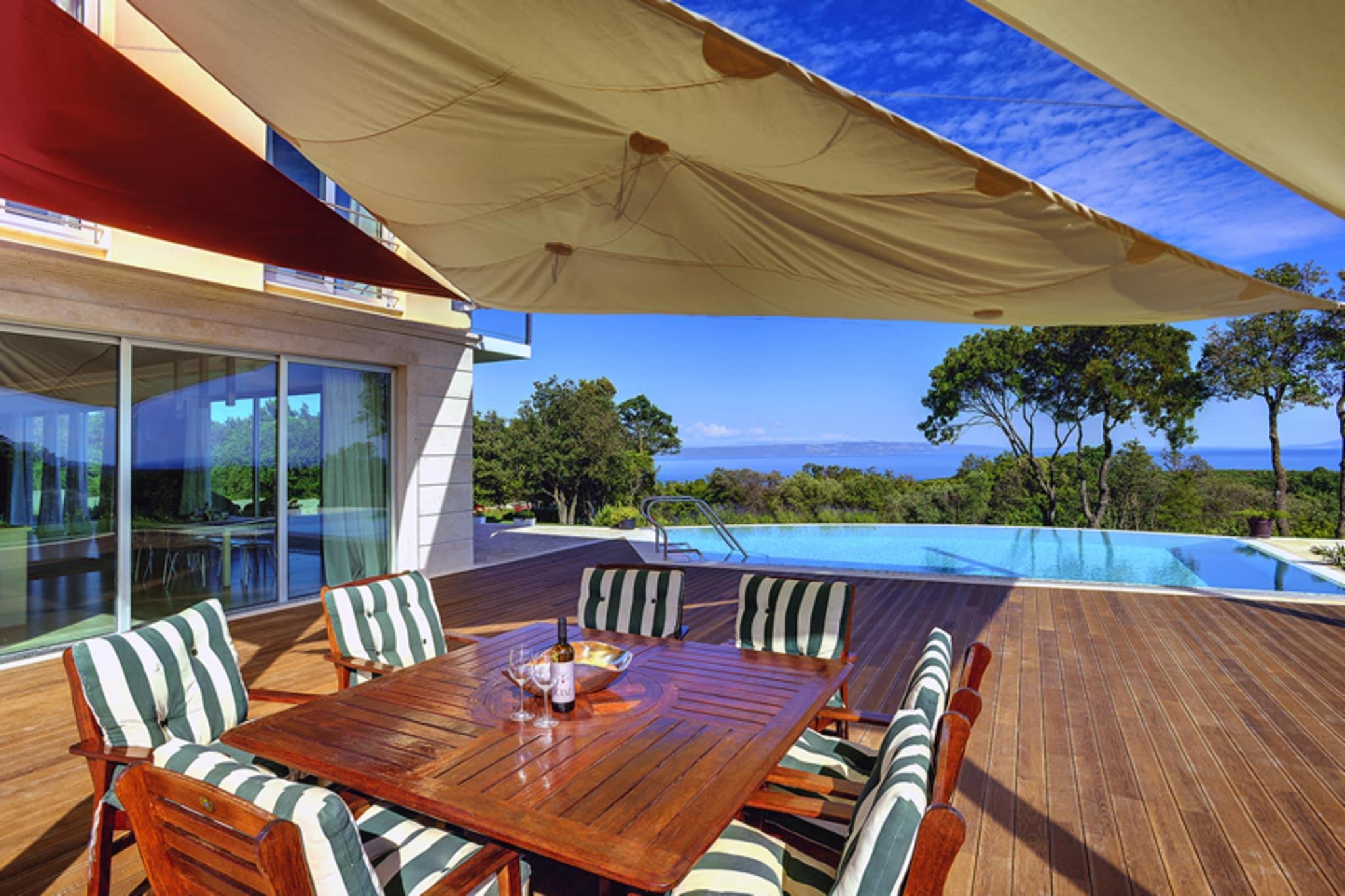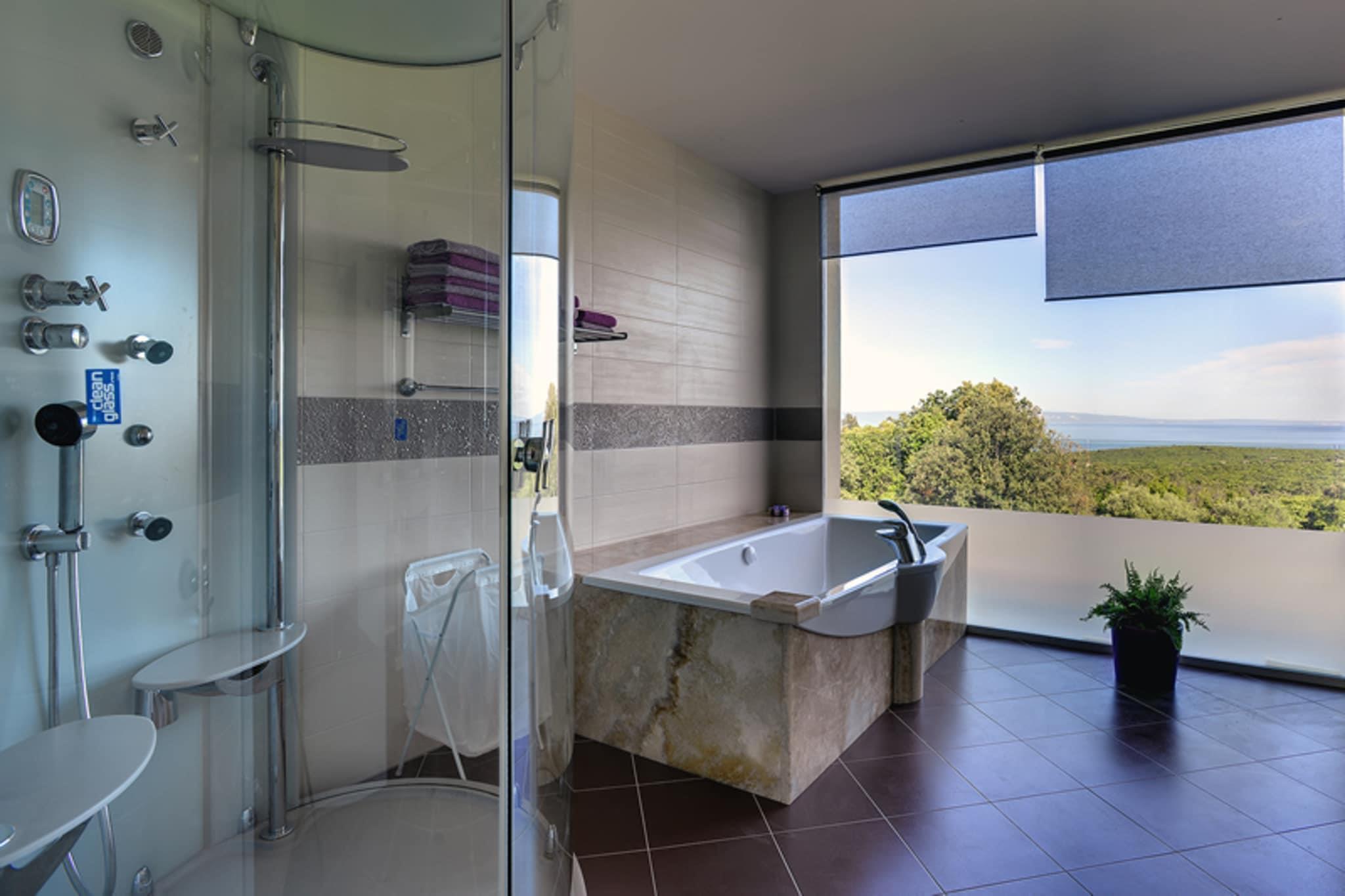 Denne ejendom er en fritliggende villa med privat swimmingpool og ligger i det østlige Istrien, 2 km fra havet! Fra dette sted har du en vidunderlig udsigt over det endeløse grønne landskab og Kvarnerbugten. Du har en stor lukket have på 1900 m², en infinity-swimmingpool, liggestole og en træterrasse med havemøbler til din rådighed. Slap helt af i den finske glassauna og boblebadet og nyd udsigten. Byens centrum ligger 6 km væk, hvis du har lyst til at udforske området til fods og shoppe souvenirs. Du kan pakke dine badetøj og tage til havets strand kun 2 km væk, hvor du kan købe dagligvarer i nærheden og få en bid mad i en af restauranterne kun 5 km fra dit ophold. Villaen har et komfortabelt og attraktivt interiør og store glasskydedøre. Du kan sætte en grill op om aftenen. Alle soveværelser er en suite med tilhørende badeværelser. Boligen har aircondition og er udstyret med vaskefaciliteter.