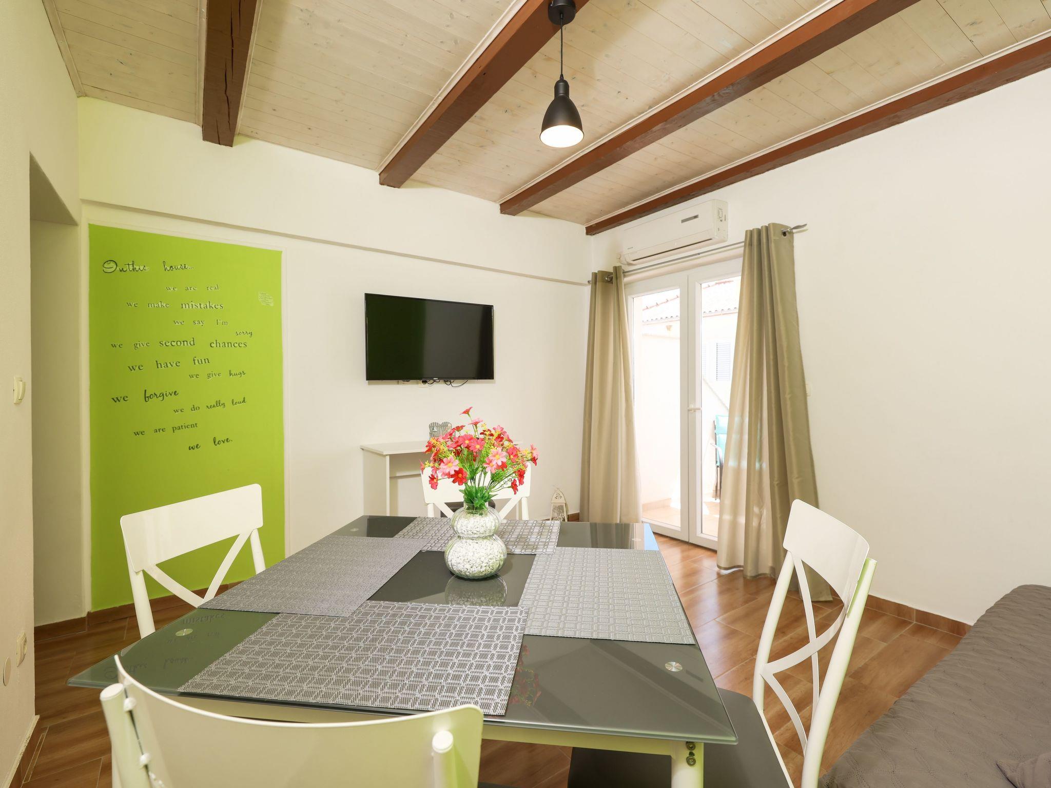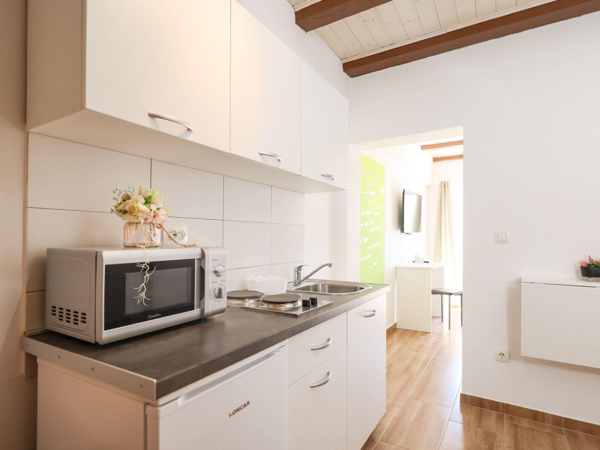 Inside, the apartment on the first floor features a contemporary open plan living-/dining area, complete with a fully equipped kitchen, ensuring all the comforts of home. It accommodates guests in a cozy bedroom with a double bed and offers the convenience of a modern bathroom with a shower. For extra guests, the living area includes a sofa bed, and a baby cot is available upon request, ensuring a comfortable stay for couples, small families, or friends, complemented by amenities like air conditioning, TV, free WiFi, and picturesque views from the private balcony and/or terrace.