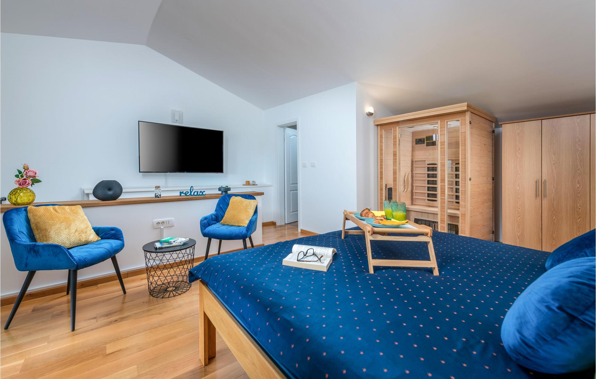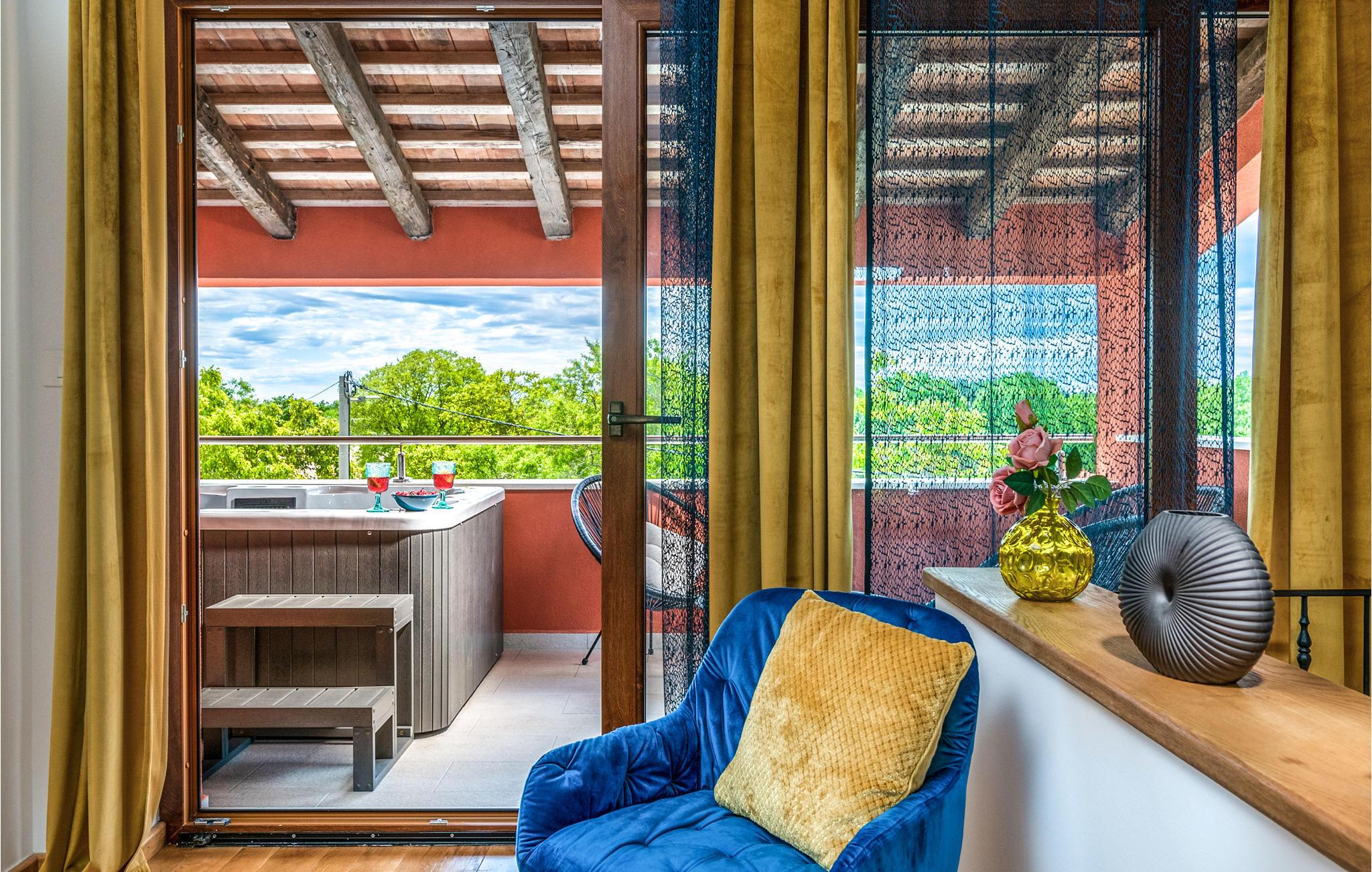 Rejs til dette skønne feriehus med familien eller et par venner. Huset strækker sig over tre etager og byder på smagfulde og farverige lokaler, der inviterer til at blive hængende. Find jer godt til rette på møblerne, spil kort og nyd saunaen og jacuzzien på øverste etage, hvorfra I har en fantastisk udsigt over det grønne landskab.
