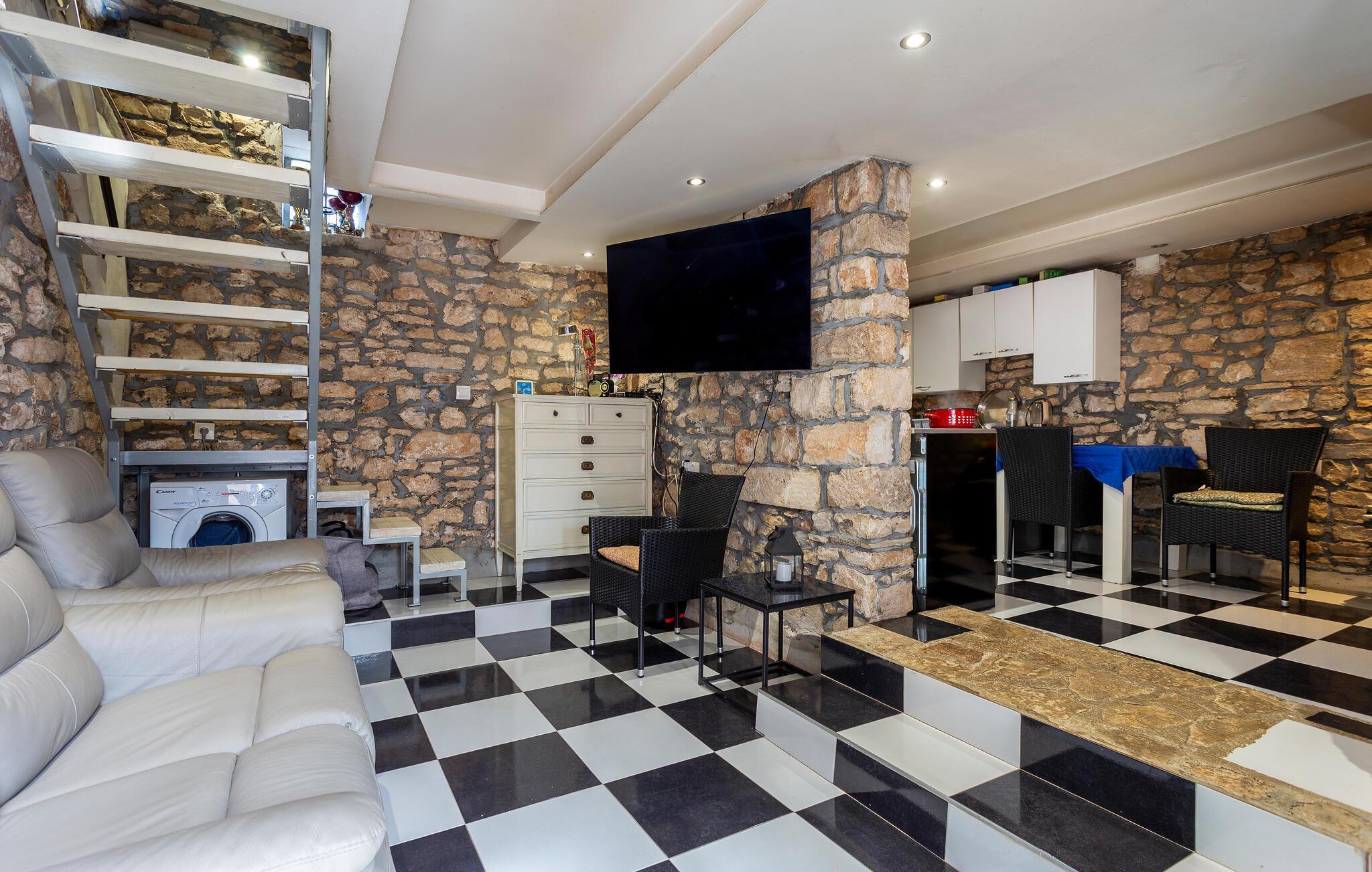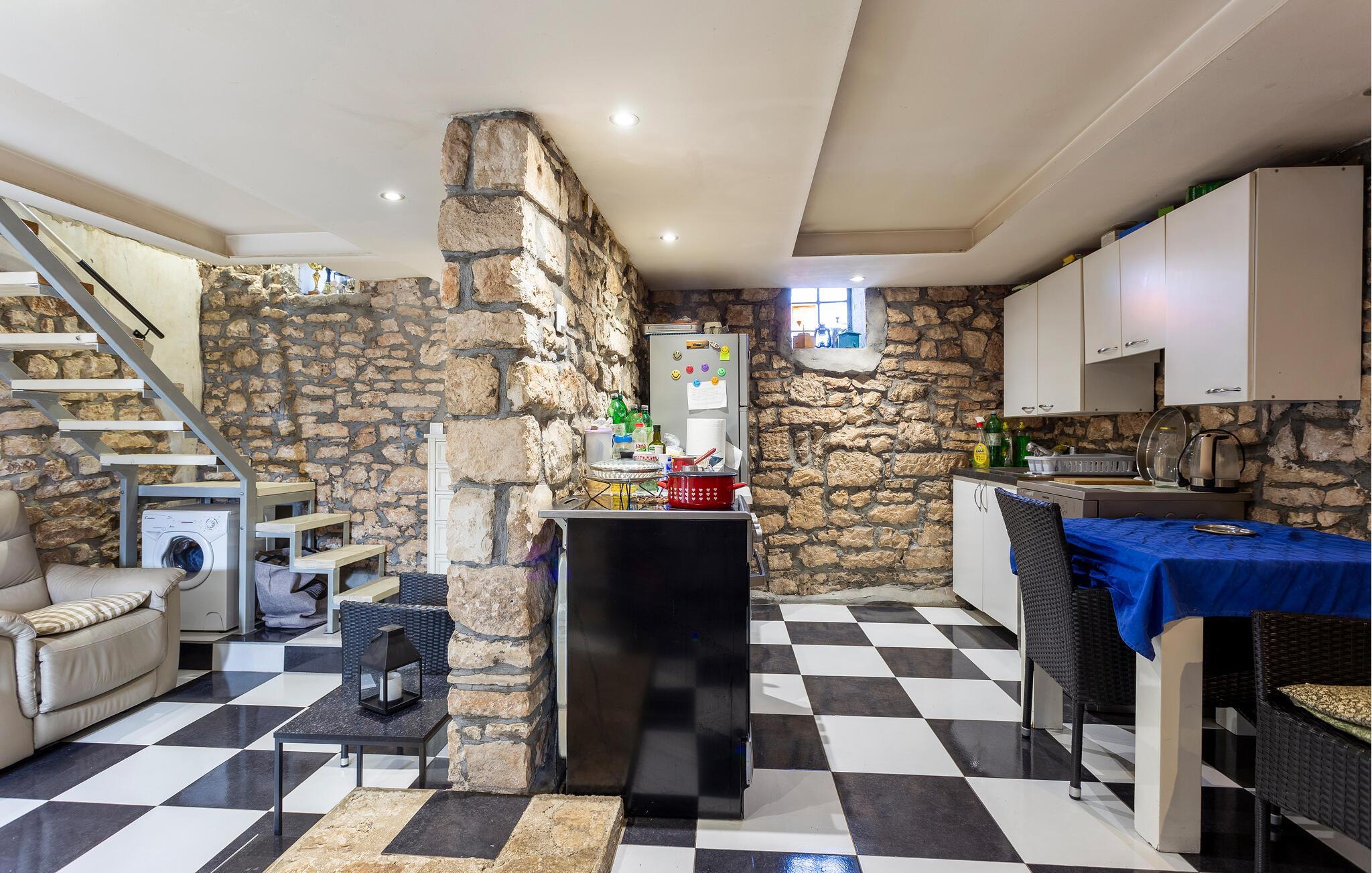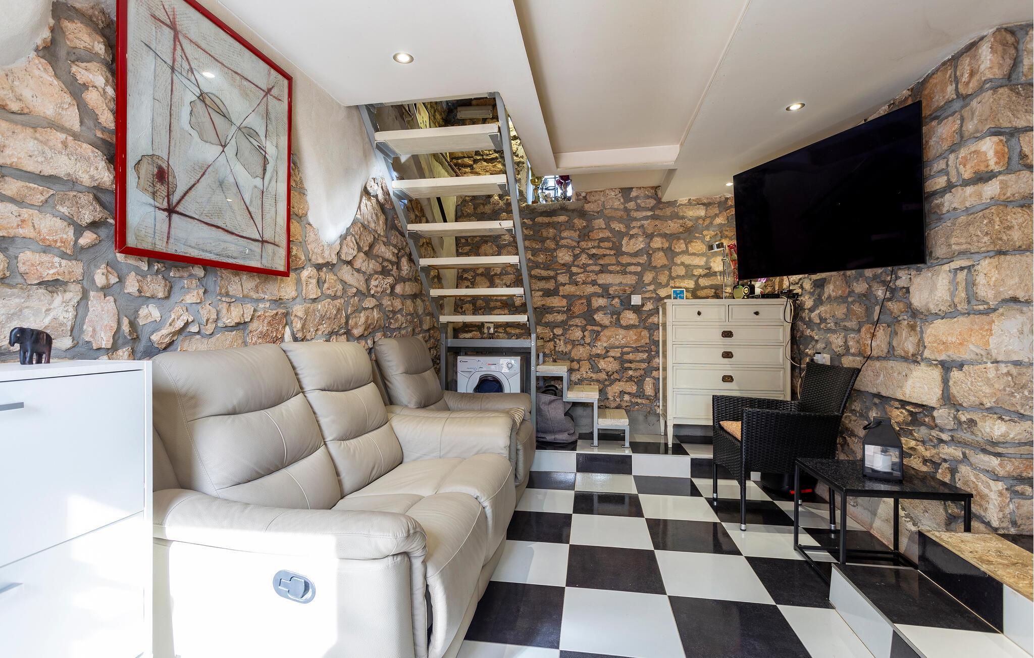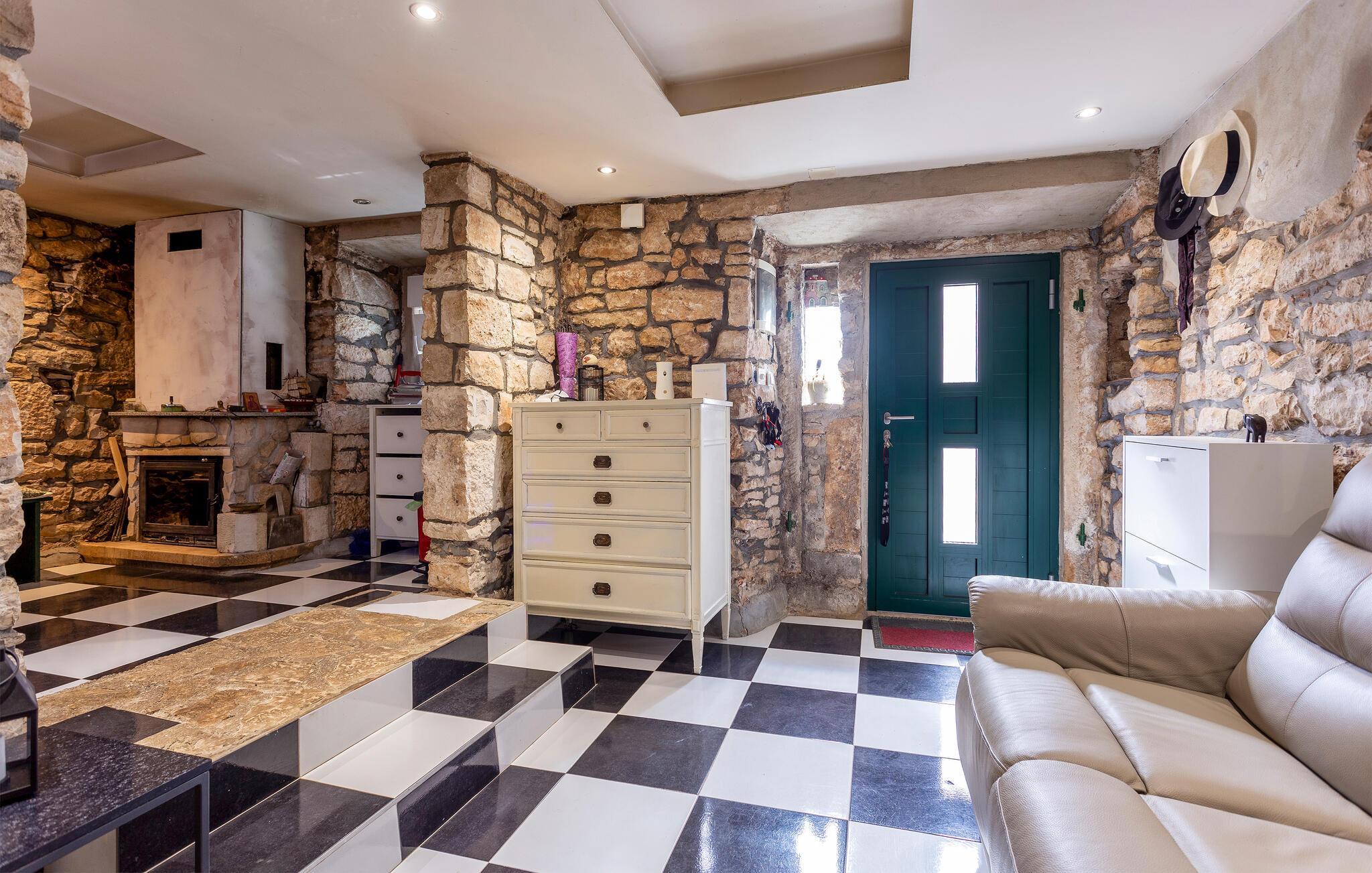 I dette hyggelige og rustikke feriehus kan I se frem til en afslappende ferie i autentiske omgivelser. Indenfor møder I en varm atmosfære med synlige stendetaljer og en pejs i det åbne køkkenalrum, der skaber en indbydende stemning til hyggelige stunder og fælles måltider. De rustikke detaljer og den charmerende indretning giver en følelse af hjemlig hygge.
