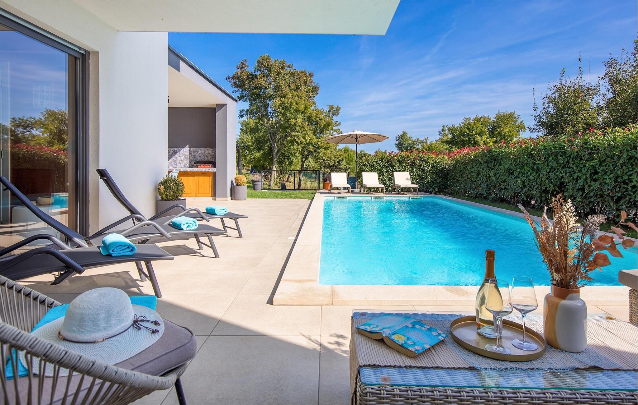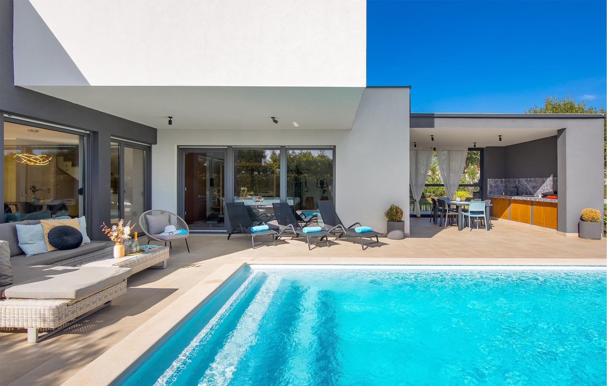 Die wunderschöne Luxusvilla Hedone Rakalj liegt in der Nähe der Städte Labin und Rabac. Diese moderne Villa bietet Platz für bis zu 6+2 Personen in 3 Schlafzimmern. Die Eleganz dieser Villa wird Ihnen den Atem rauben und Sie werden auf jeden Fall wiederkommen wollen, also verpassen Sie nicht die Gelegenheit, einen erholsamen Urlaub in dieser exquisiten Villa zu verbringen!
