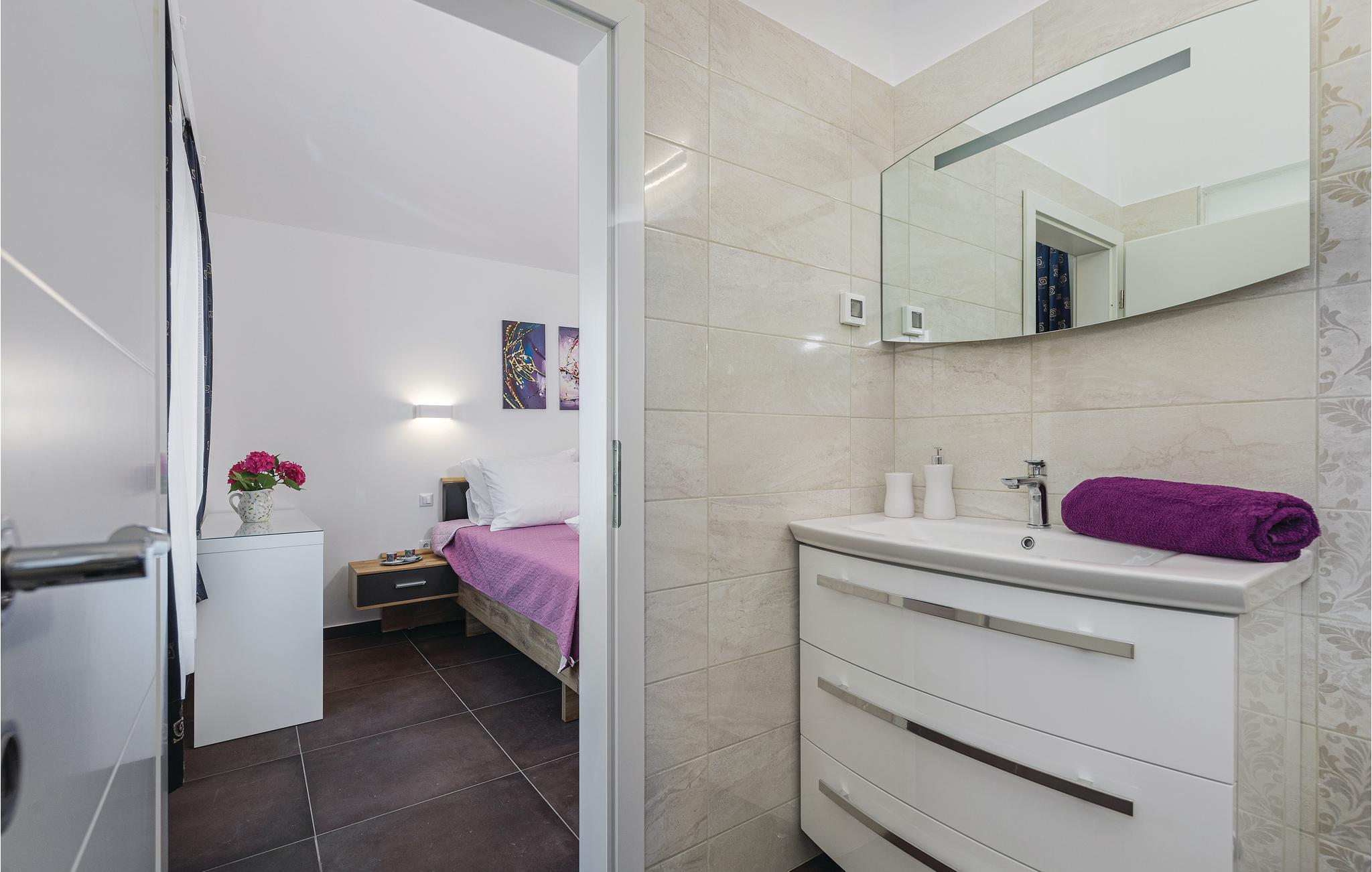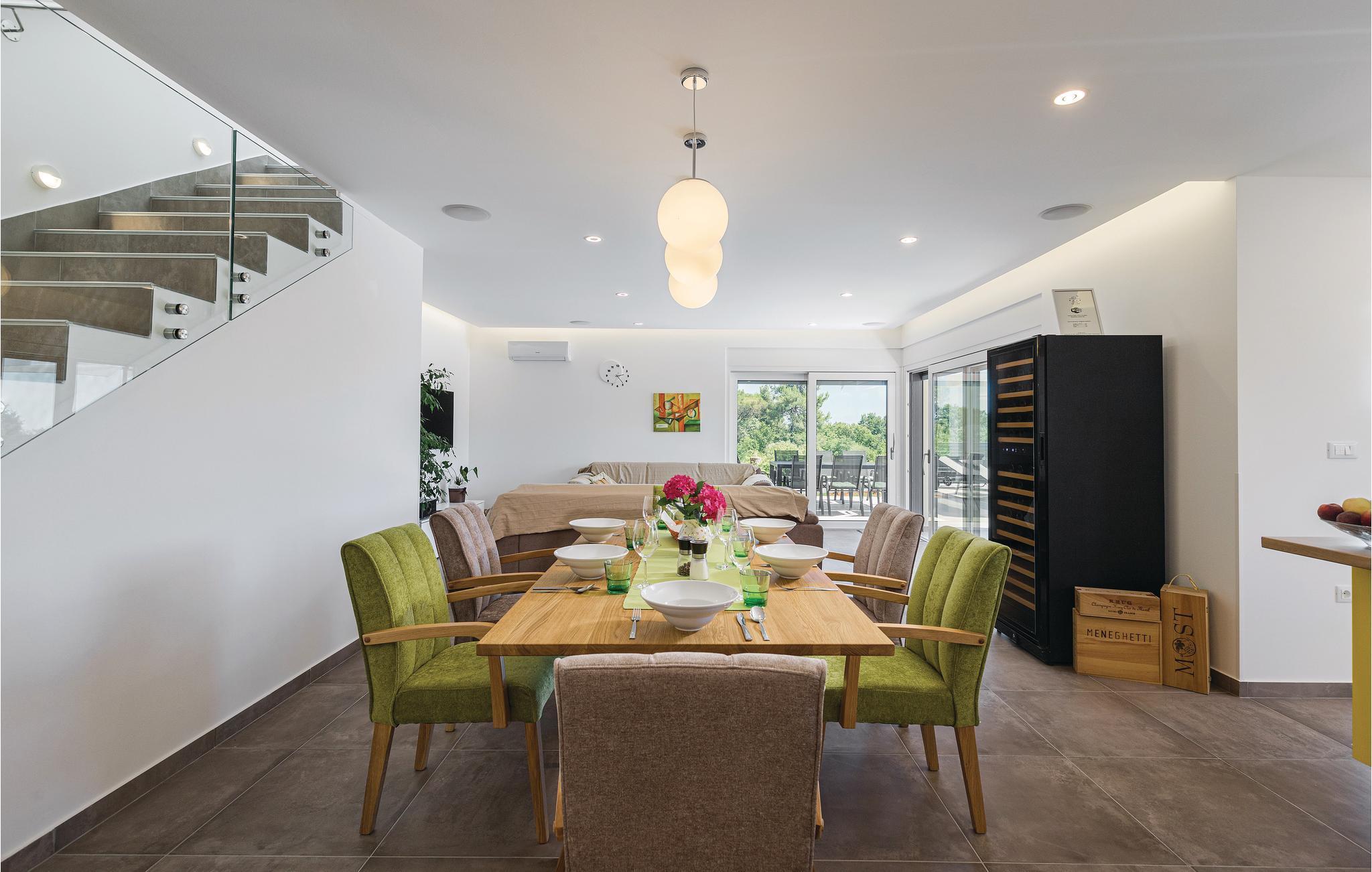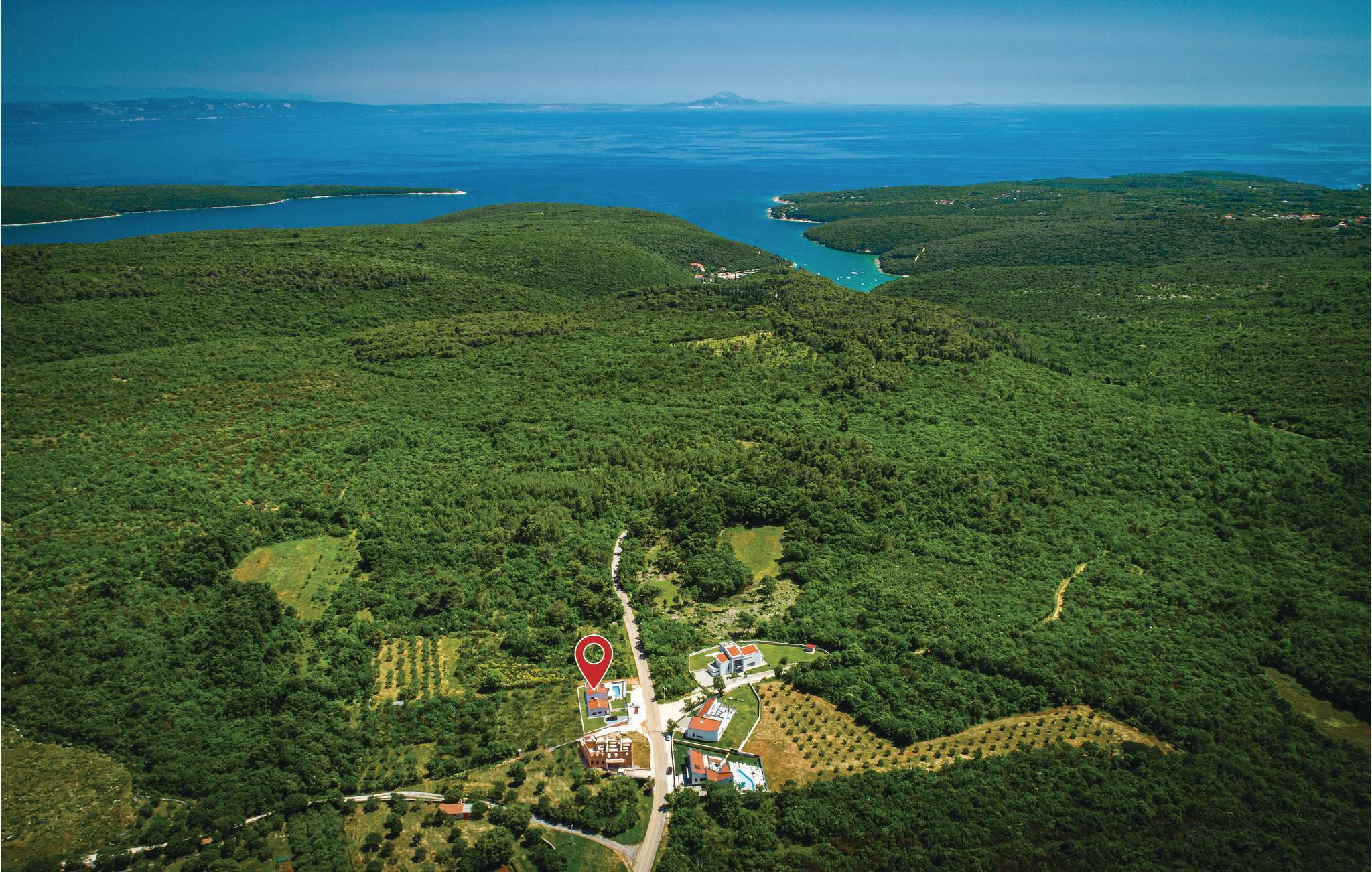 Nyd jeres ferie i denne skønne, komfortable og stilfuldt indrettede villa. Den rummelige opholdsstue i stueetagen har adgang direkte til verandaen og solområdet med pool, hvor der kan vente mange timers sjov med leg i det friske vand. Der er et soveværelse ligger i stueetagen og to yderligere på første sal, hvor der også er en terrasse med udendørs whirlpool. Udsigten fra terrassen til havet er betagende, men I kan også køre ned til strandene i Krnicki Porat og Rakalj på få minutter, hvis I gerne vil have lidt afveksling fra jeres egen pool i den indhegnede have.