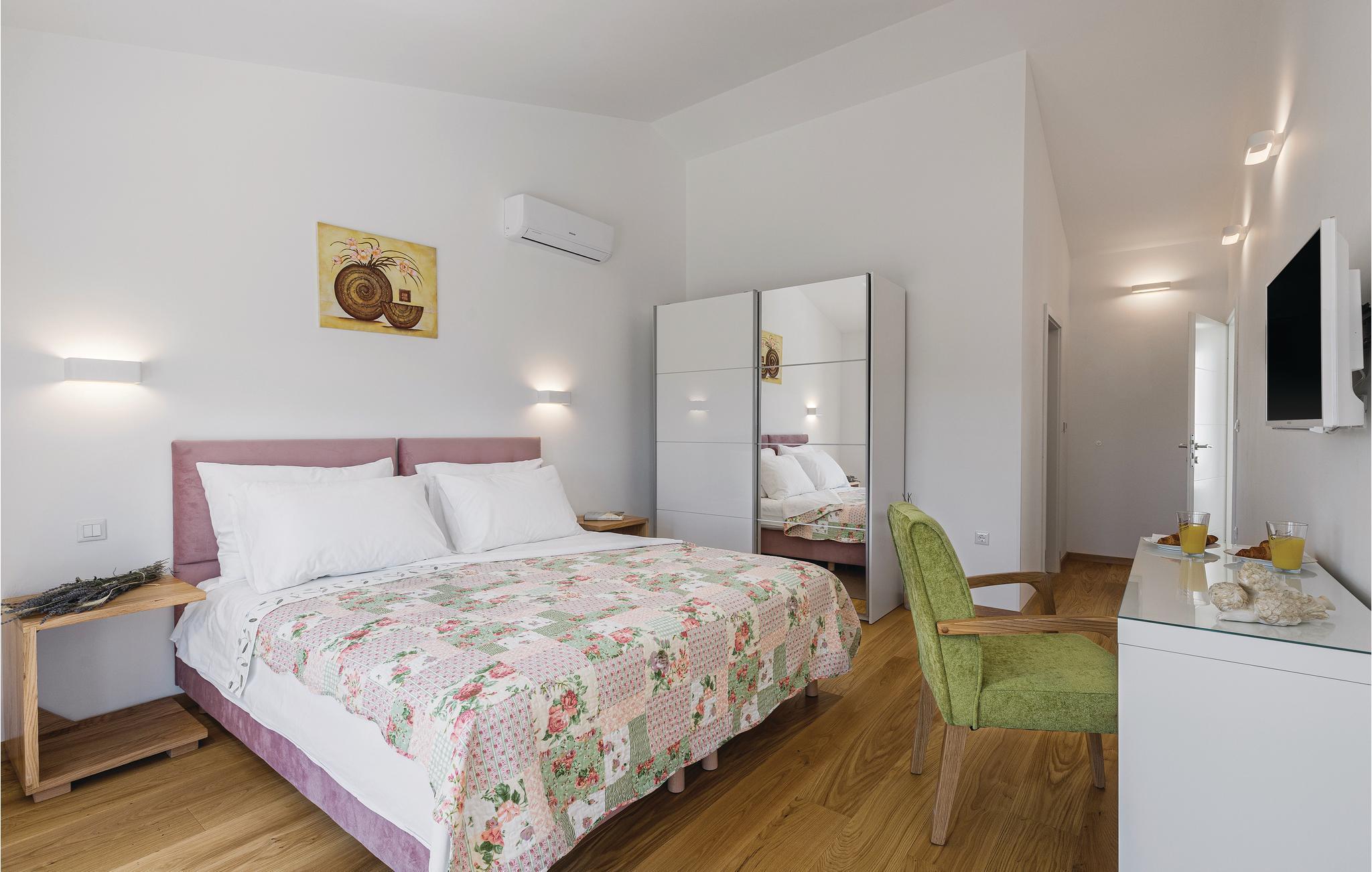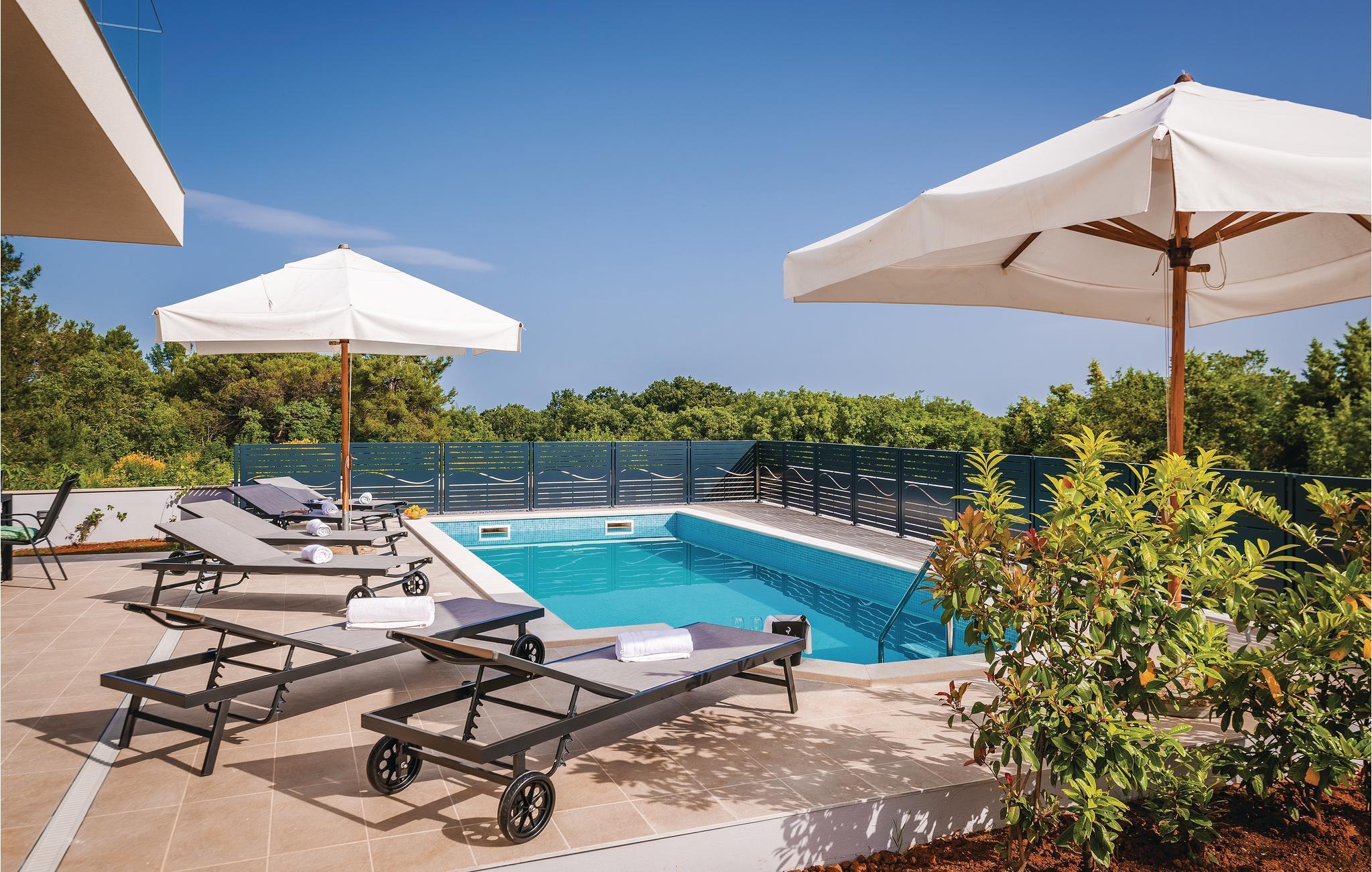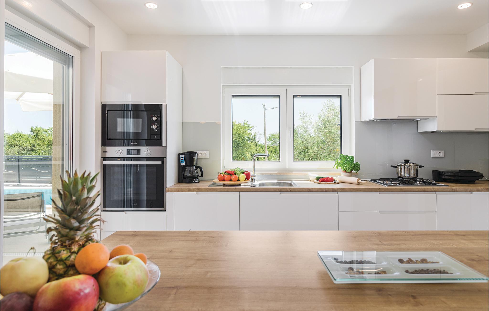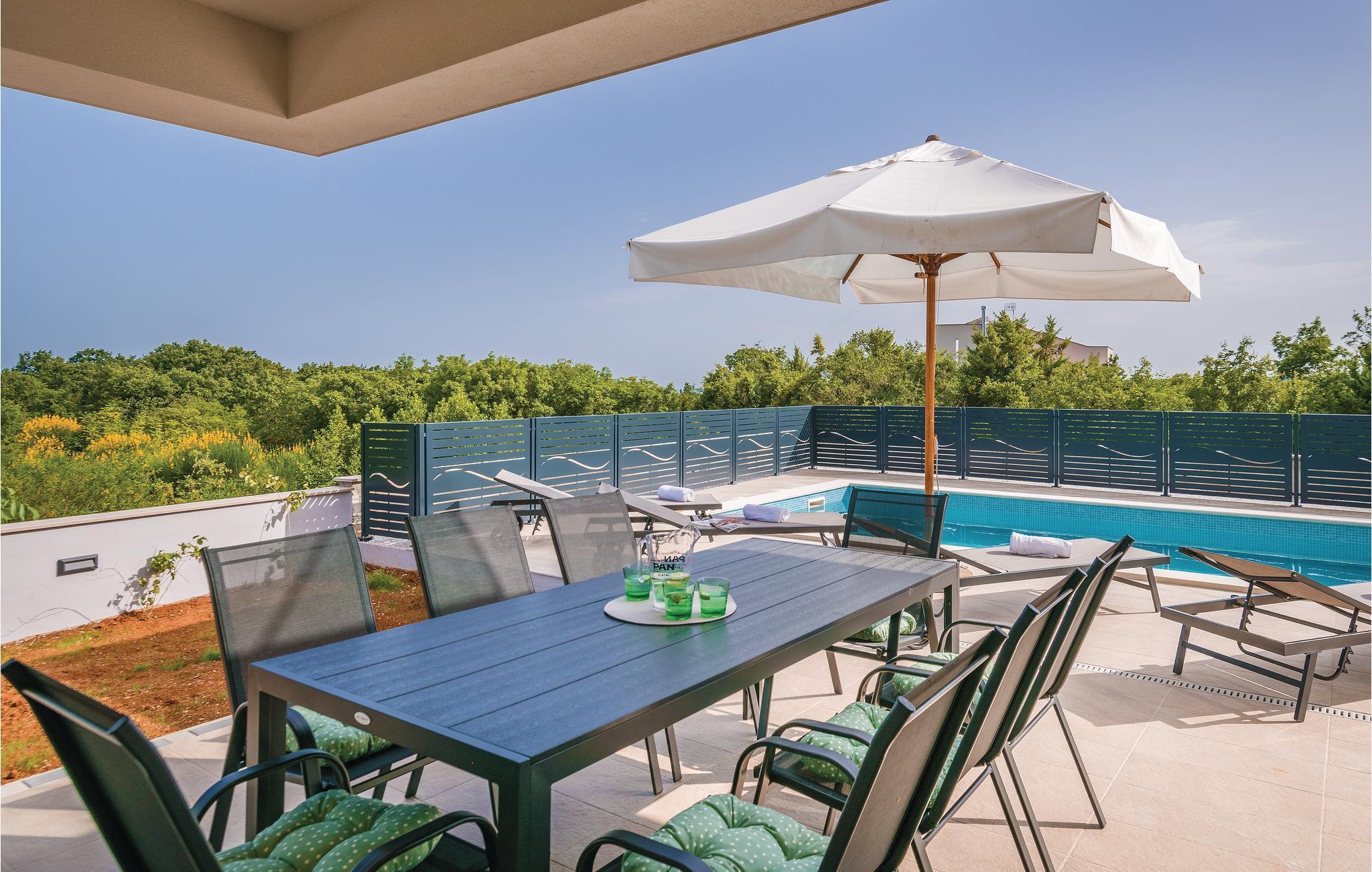 Nyd jeres ferie i denne skønne, komfortable og stilfuldt indrettede villa. Den rummelige opholdsstue i stueetagen har adgang direkte til verandaen og solområdet med pool, hvor der kan vente mange timers sjov med leg i det friske vand. Der er et soveværelse ligger i stueetagen og to yderligere på første sal, hvor der også er en terrasse med udendørs whirlpool. Udsigten fra terrassen til havet er betagende, men I kan også køre ned til strandene i Krnicki Porat og Rakalj på få minutter, hvis I gerne vil have lidt afveksling fra jeres egen pool i den indhegnede have.