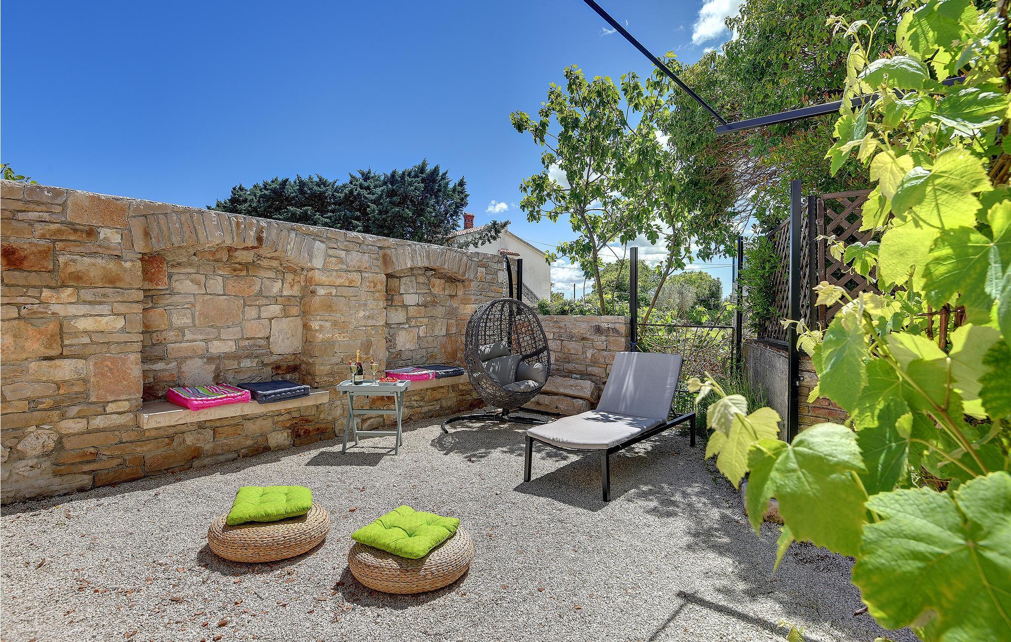 Udenfor er der en terrasse dækket af vinstokke og yderligere en terrasse med grill og et stort siddeområde, hvor der dufter dejligt af citron, lavendel og jasmin.