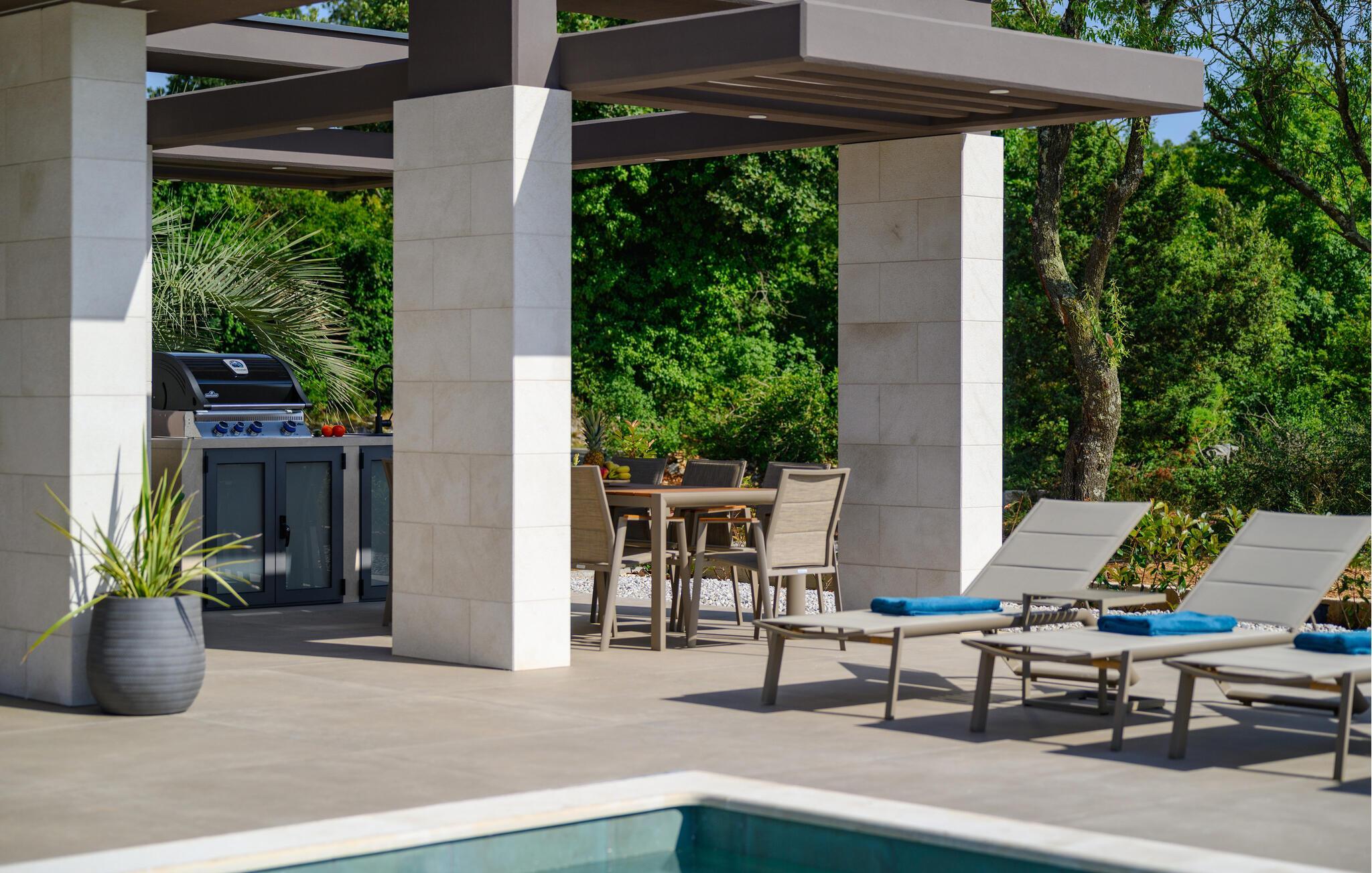 Lad jer fortrylle af det rummelige udendørsområde med dens luksuriøse pool og betagende udsigt over naturen. Slap af på de komfortable liggestole, dyk ned i det forfriskende vand eller nyd en grill på terrassen. Forkæl jer selv med et glas vin ved solnedgang eller en natlig blødning i boblebadet.