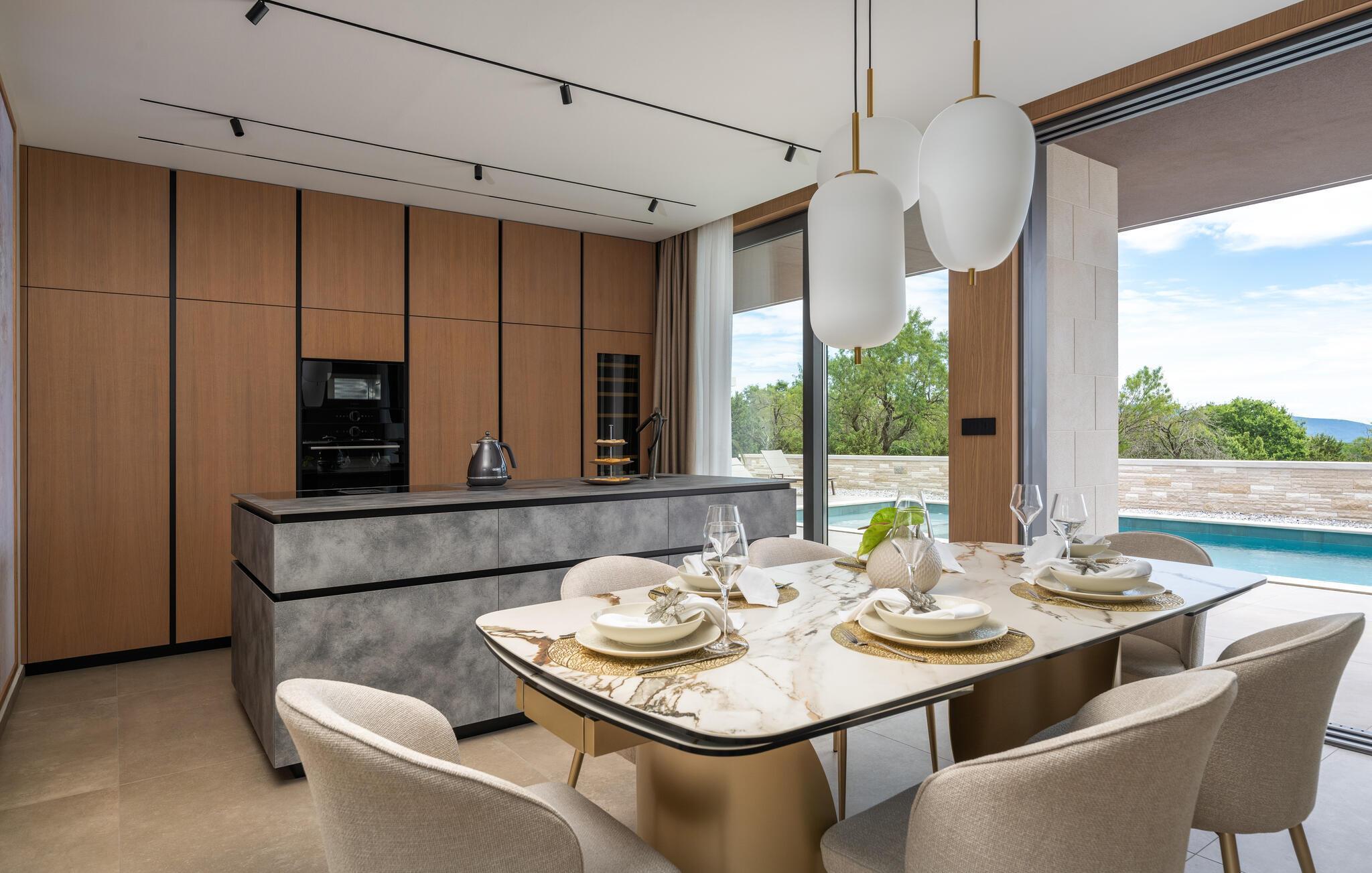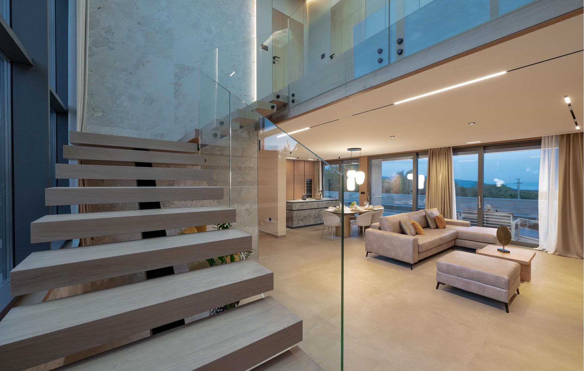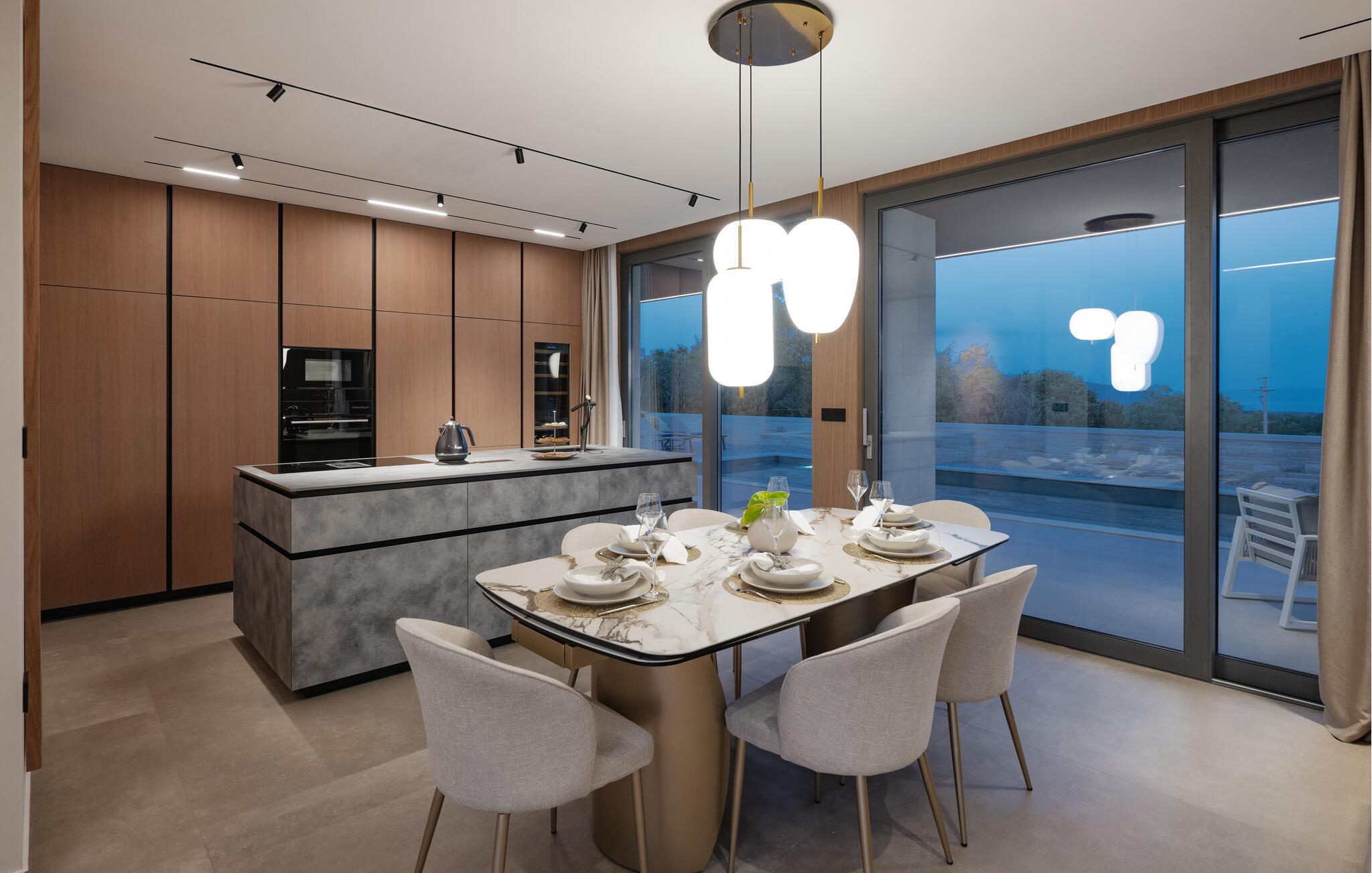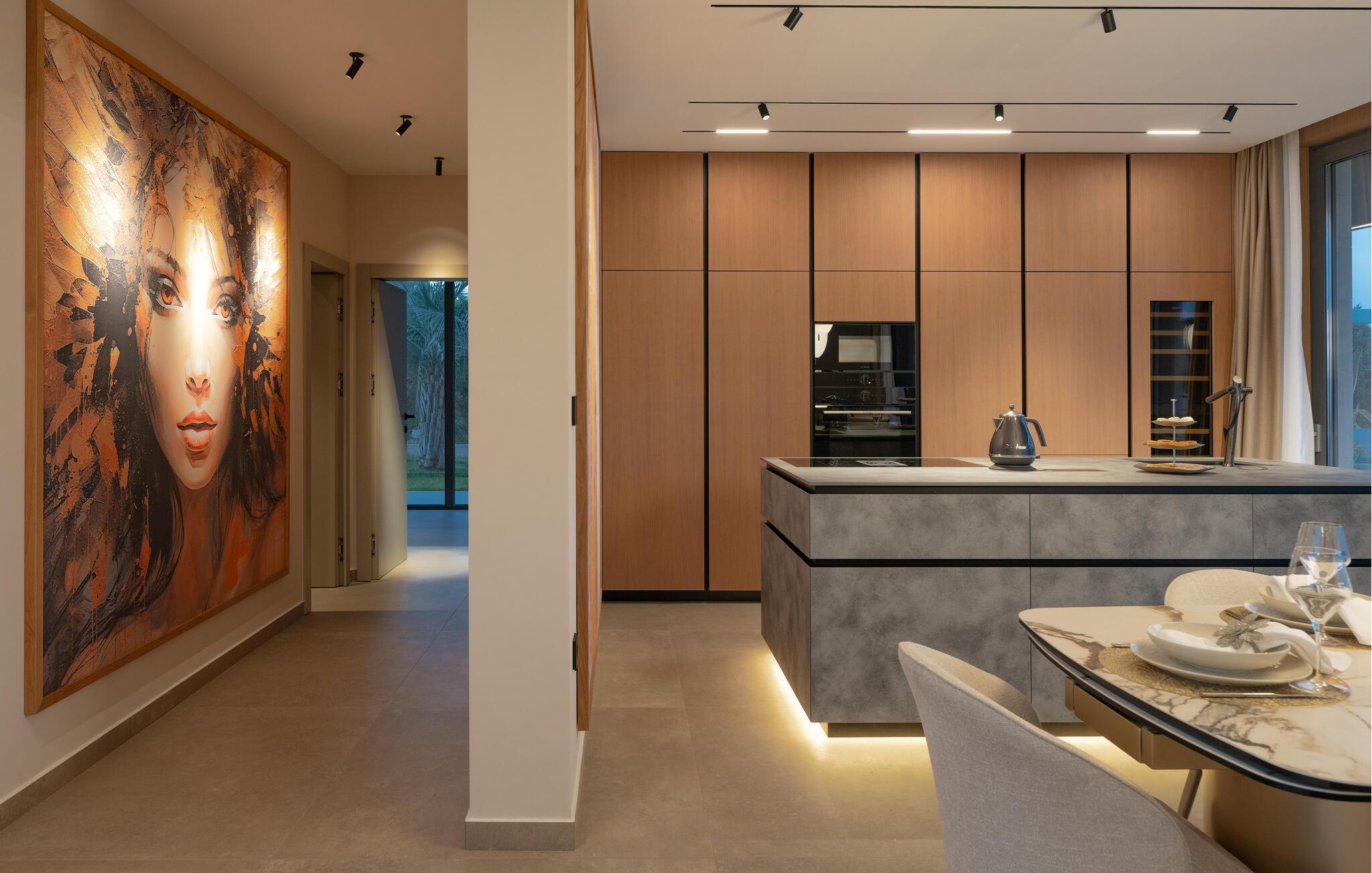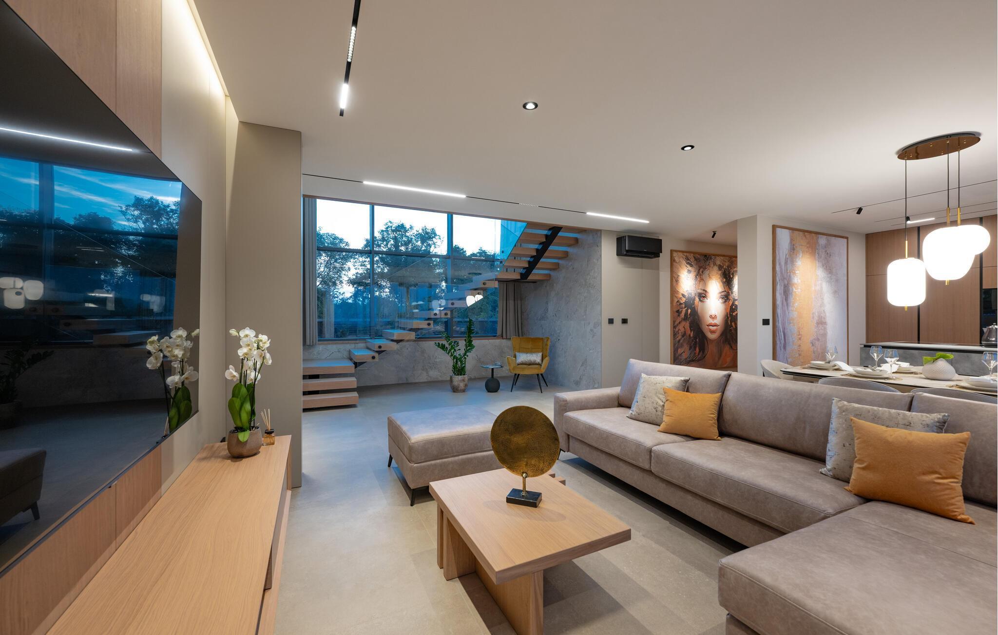 Nyd den stilfulde atmosfære i dette eksklusive designerhus. Den åbne, lysfyldte arkitektur skaber en harmonisk følelse af at bo, mens I kan fremtrylle middelhavsspecialiteter i det ultramoderne køkken. Forkæl jer selv med kulinariske lækkerier ved det elegante spisebord eller gør jer godt tilpas på det rummelige sofaområde, mens I streamer en film eller lytter til musik.