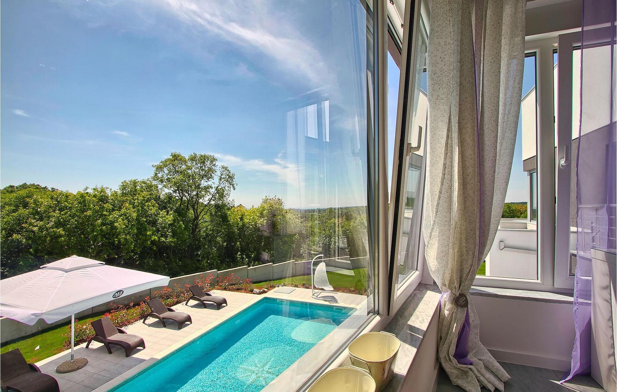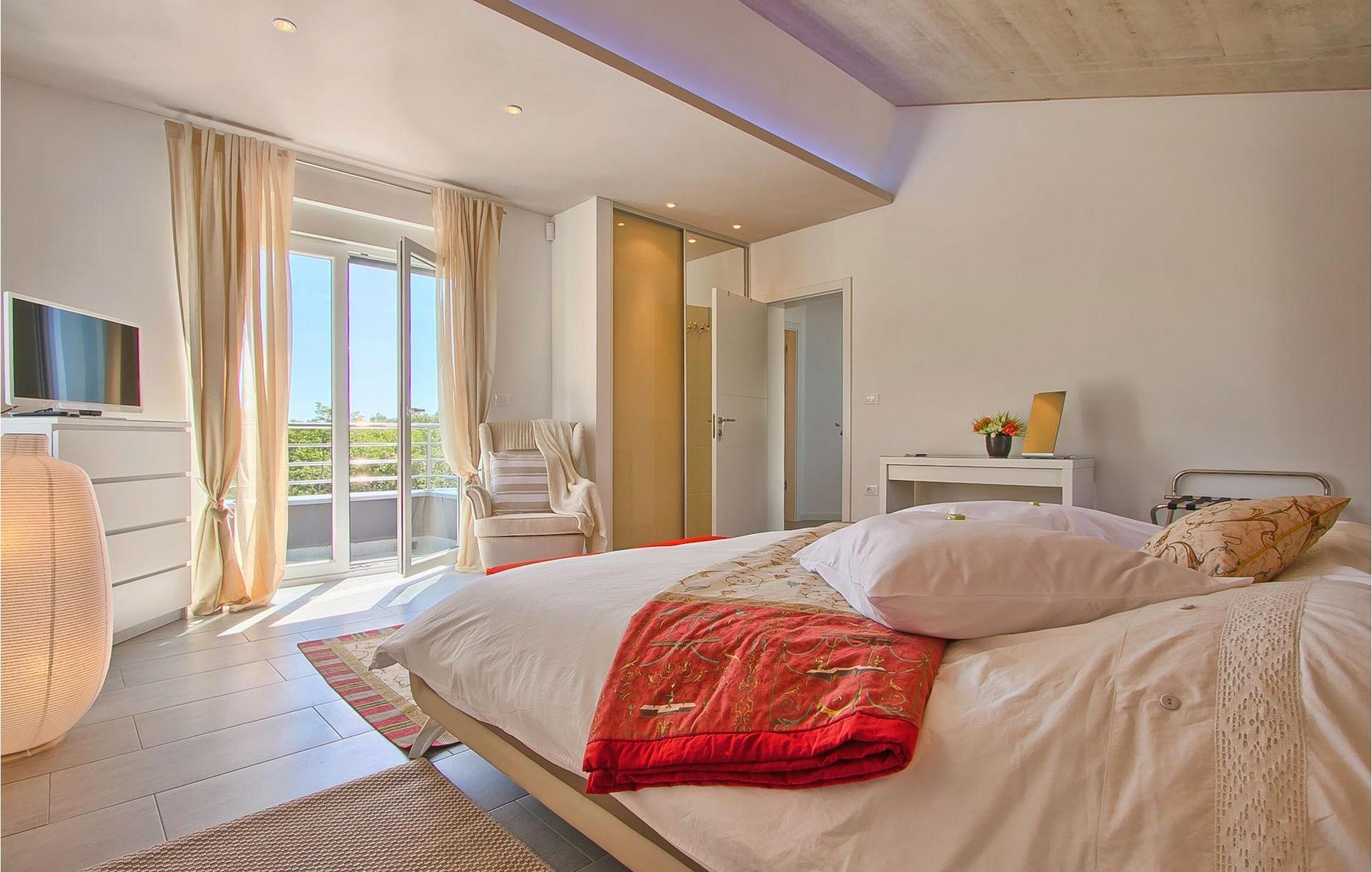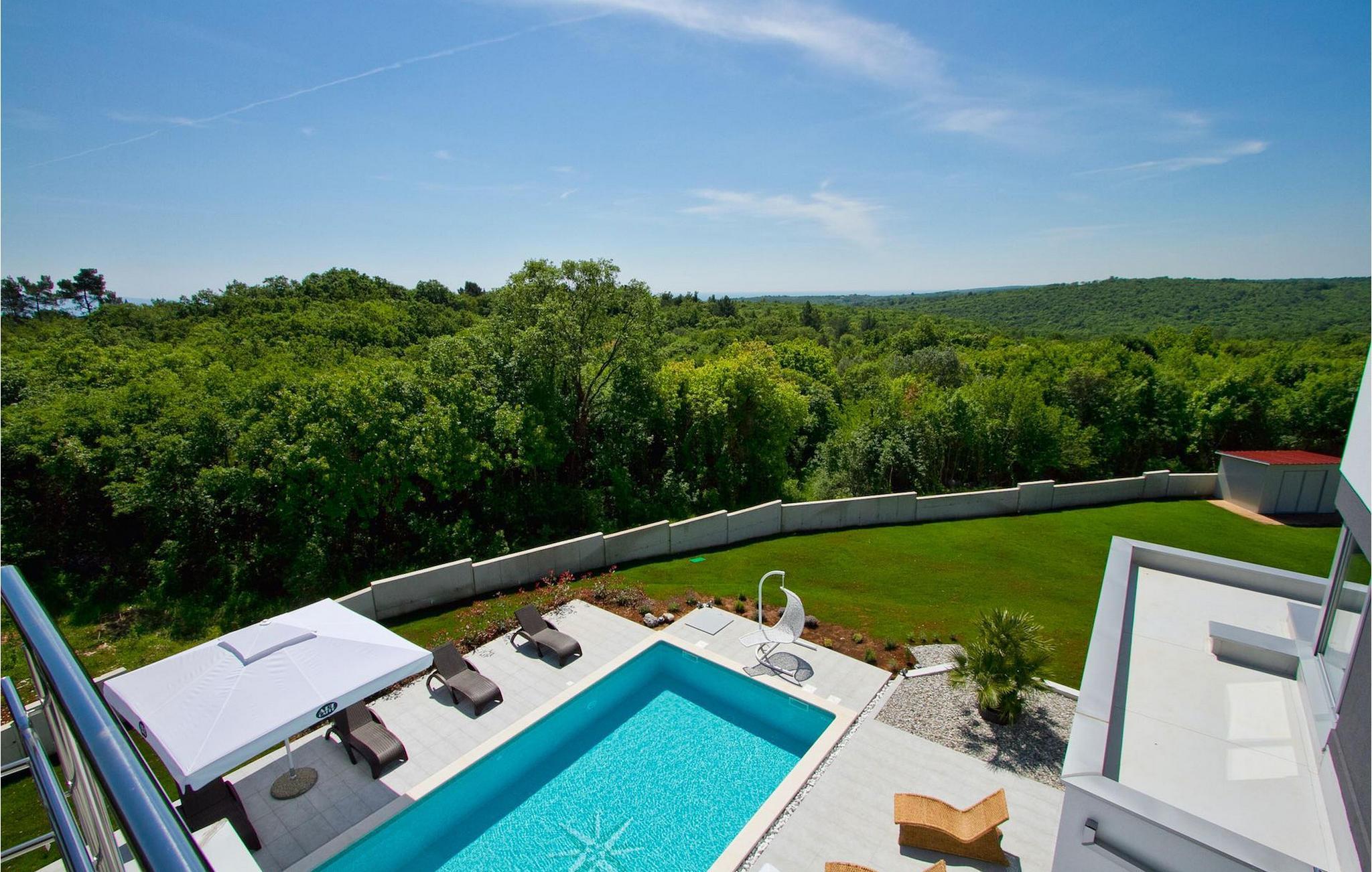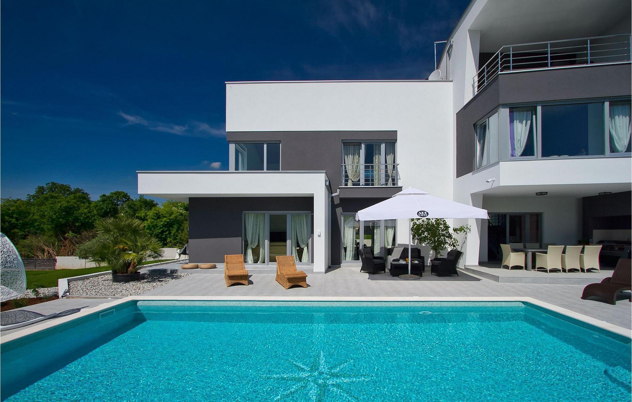 Dieses schöne, moderne Anwesen ist mit viel Liebe zum Detail gebaut worden. Die Anlage ist umgeben von wunderschöner unberührter mediterraner Natur und bietet vollkommene Ruhe und Privatsphäre. Die Villa ist auch ein guter Ausgangspunkt für einen aktiven Urlaub, da die Strände in nur 5 Minuten Fahrt erreichbar sind, mit vielen Radwegen usw. Draußen gibt es einen schönen großen Pool mit Liegestühlen. Ein gepflegter und bewässerter Rasen mit Lounge-Möbeln bietet perfekte Erholung. Der Garten, mit gut ausgestatteter Außenüche mit einem Gasgrill, ist der perfekte Ort für ein Essen im Freien mit Blick auf die Natur und den beleuchteten Pool. Sie können auch oben, auf der großen überdachten Terrasse mit Meerblick entspannen. Der Innenraum ist lichtdurchflutet und schön eingerichtet, es fühlt sich wirklich wie ein Zuhause an. Es gibt 4 Schlafzimmer mit eigenem Bad. Zwei der Zimmer teilen sich ein Bad. Eines der Schlafzimmer ist im Erdgeschoss. Im Obergeschoss gibt es auch einen Fitnessbereich. Das Haus ist voll klimatisiert und es gibt WiFi-Internetzugang.Krnica ist ein kleiner Ort in Istrien, der unweit von der Küste gelegen ist (5 Autominuten). Krnica ist der perfekte Ausgangspunkt für Tagesausflüge zu den berühmten Städten wie Pula, Rovinj und Opatija. Krnica ist auch ein ausgezeichneter Ort für die Kombination von Entspannung und Aktivurlaub. Im nahe gelegenen Hafen gibt es ein hervorragend ausgestattetes Tauchzentrum, das alte versunkene Schiffe, spektakuläre Unterwasser-Höhlen, Klippen, den Nervenkitzel des Nachttauchens für Anfänger und erfahrene Taucher entdeckt. Die Ost-Küste von Istrien bietet eine Vielfalt von Stränden und kristallklares Meer. Die unberührte Küste verbirgt viele ruhige Buchten. Mit seinen zahlreichen Küsten-und Waldwegen, ist dieses Gebiet ideal für Mountainbiking, lange entspannende Spaziergänge, Reiten, und als Ausgangspunkt für Ausflüge der Entdeckung des magischen Istriens.