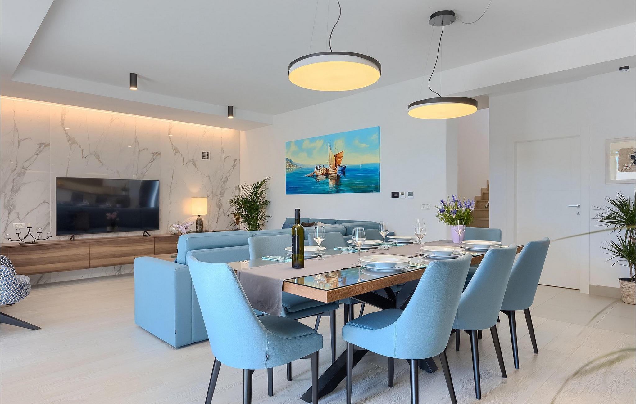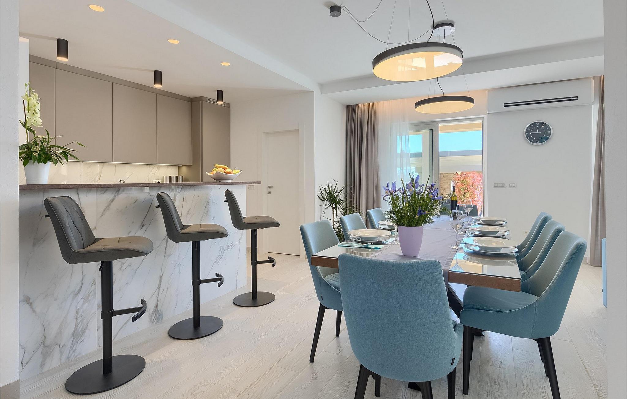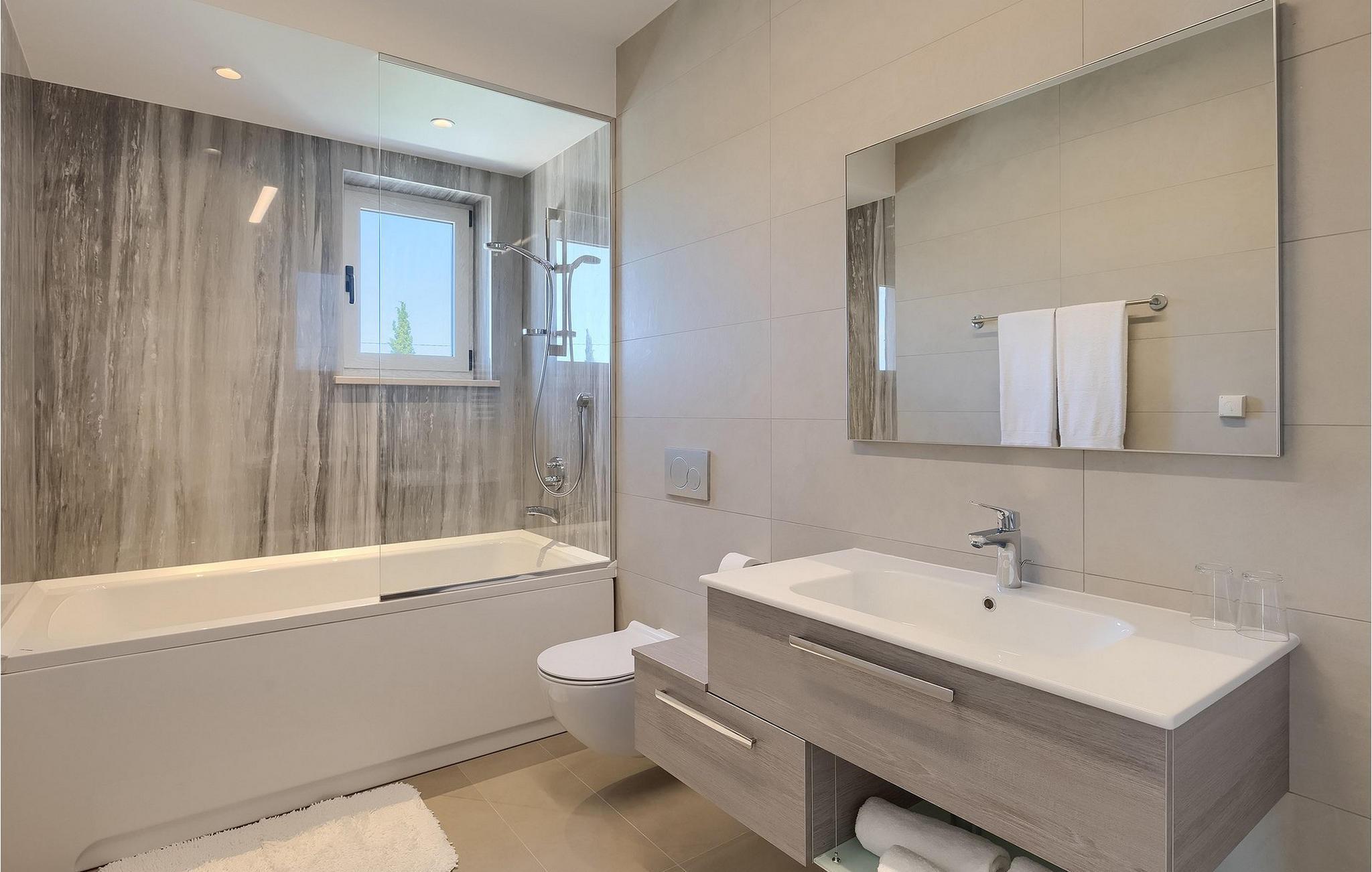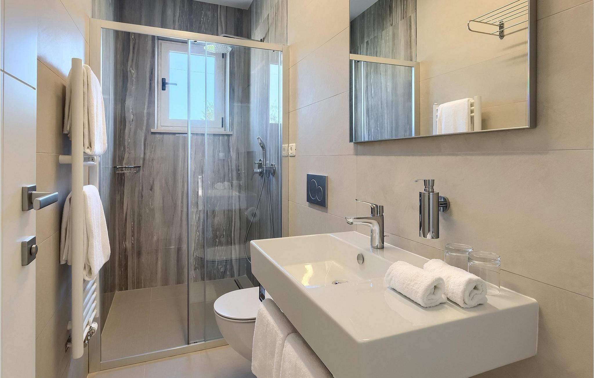 Moderne, elegant og hyggeligt er nogle af de udtryk, vi kunne bruge til at beskrive Villa Bursic i Krnica. Denne smukke ejendom vil opfylde alle dine ønsker og give dig lyst til ingenting. Stol på os, når du træder ind i denne villa, vil det være kærlighed ved første blik! Villaen består af 2 rummelige etager. I stueetagen er der en stor lys-fyldt stue og spisestue samt et fuldt udstyret køkken. Til din rådighed er der også en separat værtshus, hvor hele gruppen kan tilbringe noget kvalitetstid sammen med at slappe af. Villaen har i alt 4 soveværelser med dobbeltsenge og 5 badeværelser, mere end nok til at 8 gæster kan være helt komfortable på ferien. Et soveværelse og 2 badeværelser er placeret i stueetagen, og de resterende 3 soveværelser med eget badeværelse er på første sal.