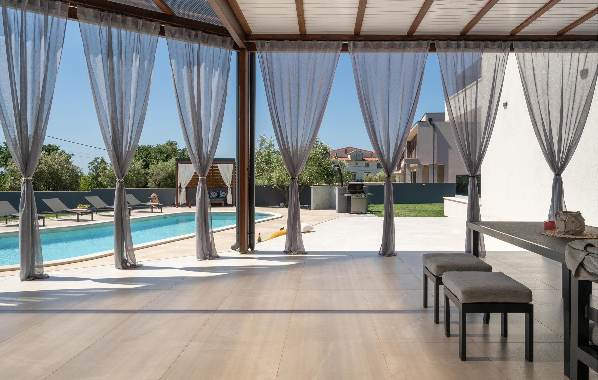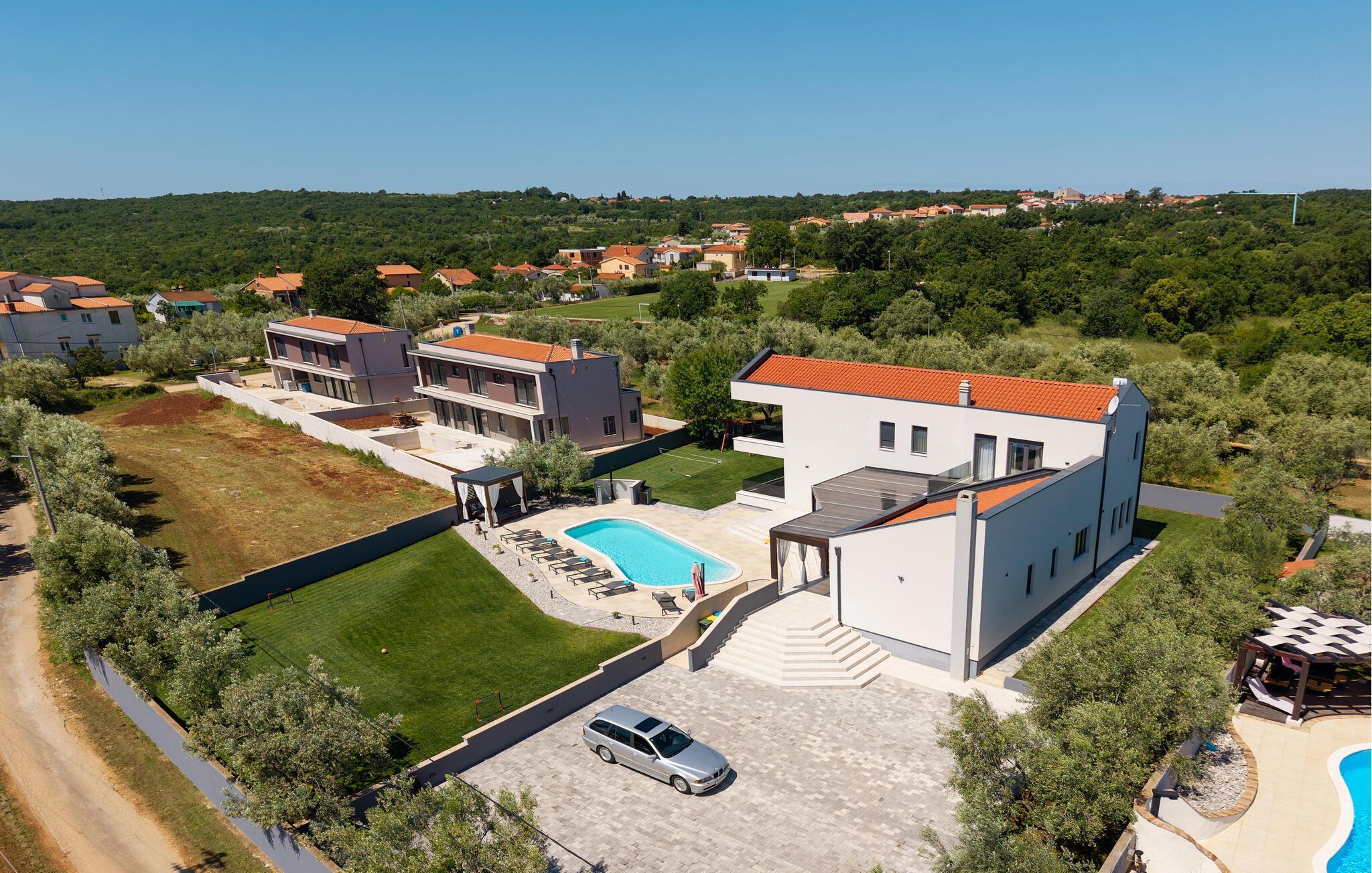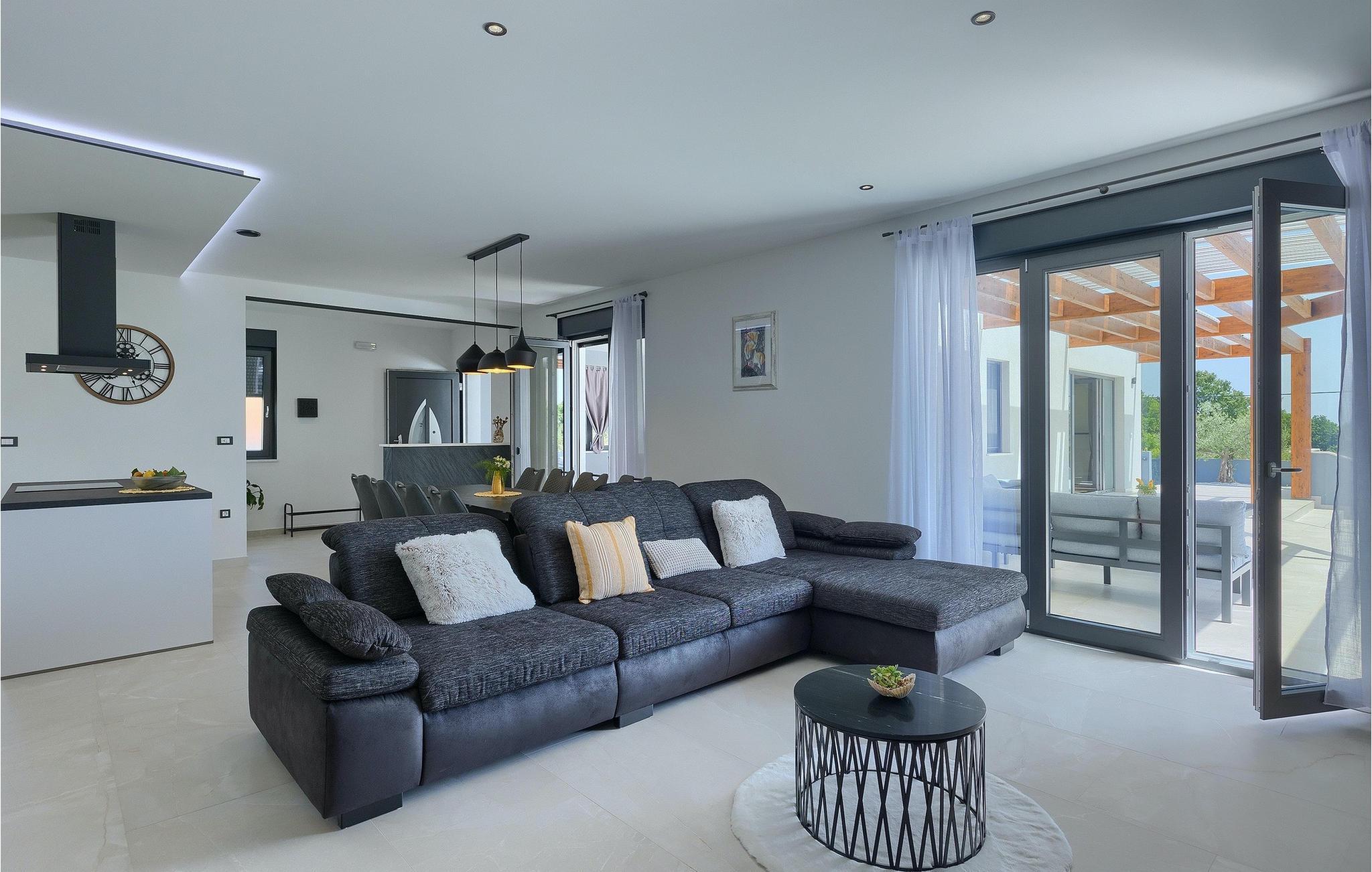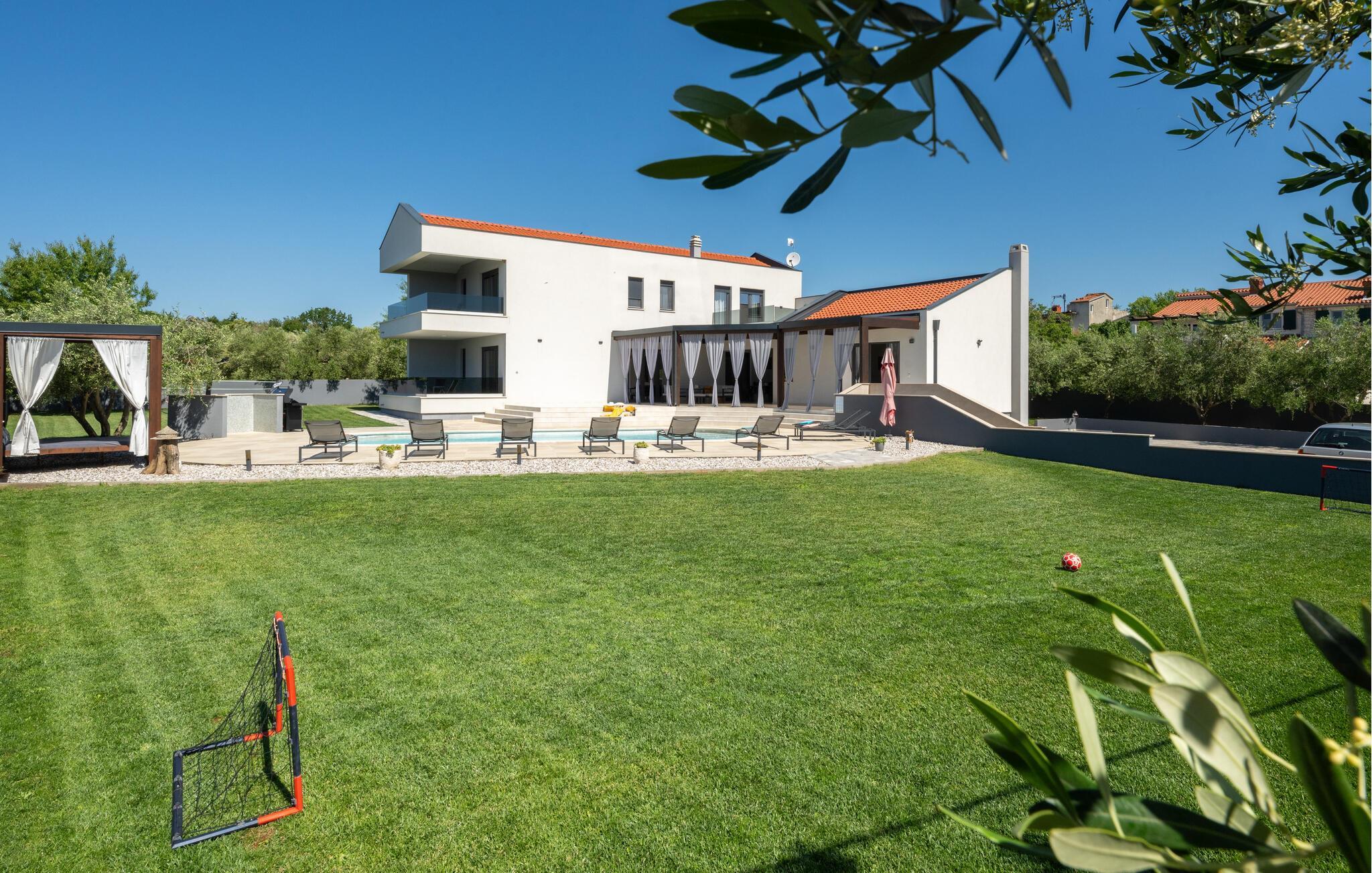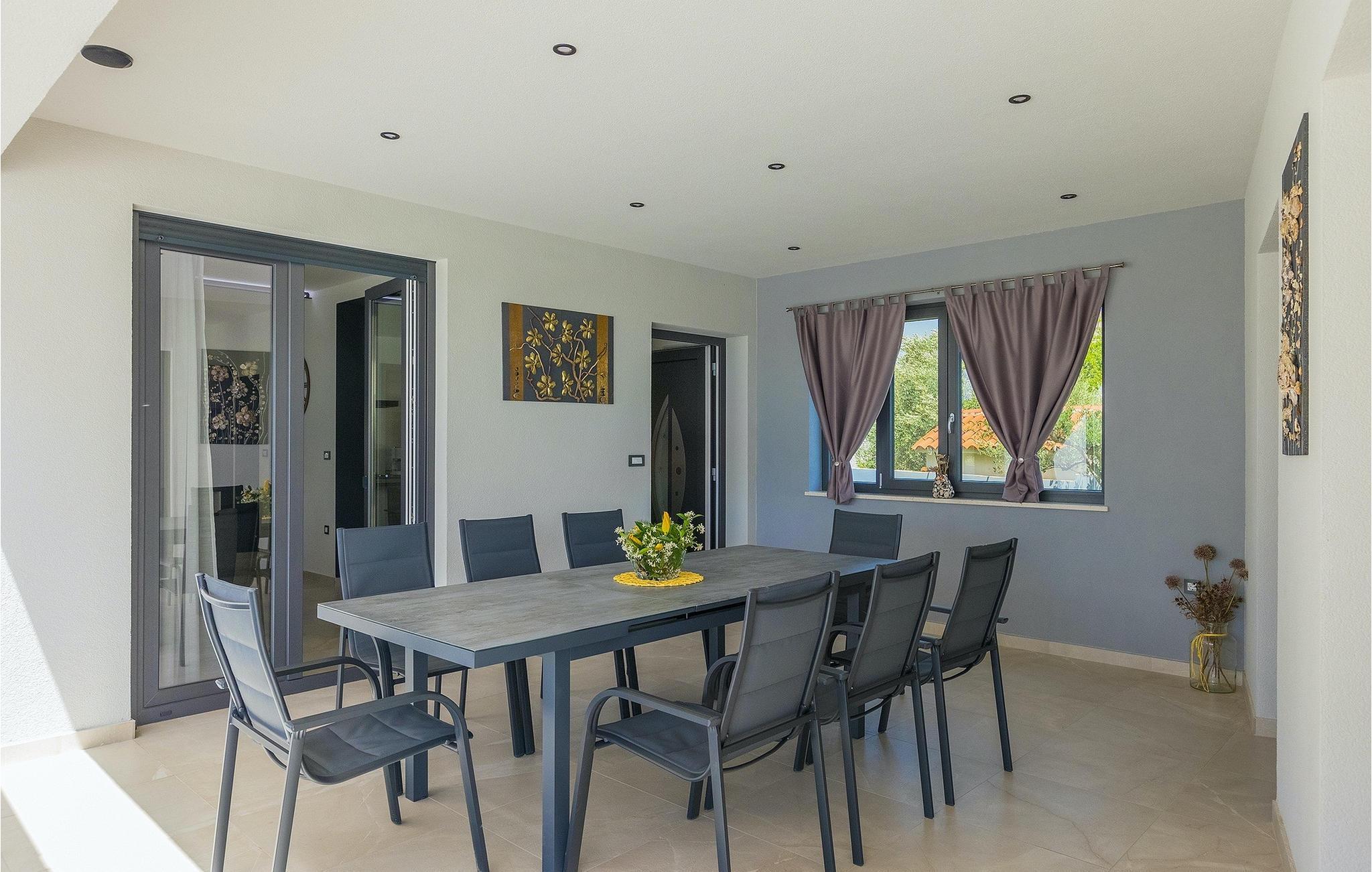 Villa Posidonia er det perfekte sted at tilbringe en uforglemmelig ferie! Det er beliggende i en lille by i Istrien er en fremragende beliggenhed tæt på havet - ideel til at opdage de smukke strande i Istrien. Villaen kan rumme op til ni personer og byder på alt hvad du behøver til en afslappende ferie med dine kære. Der er en privat pool og en udendørs bruser til forfriskning på varme sommerdage, samt liggestole, hvor du kan slappe af. En udendørs grill og spiseplads står til din rådighed. Udenfor er der mål for fodbold, badminton og en legeplads. Ejendommen er fuldt indhegnet og har privat parkering for op til fem biler. Villaens indretning er stilfuldt og smagfuldt indrettet ned til mindste detalje. I stueetagen er der fuldt udstyret køkken med spiseplads, opholdsstue, separat toilet, soveværelse med dobbeltseng, balkon med havudsigt og pooludsigt, tv og eget badeværelse samt vaskerum og spillehal. med billard, bordfodbold og dart. På første sal er der tre mere komfortable soveværelser. To med dobbeltseng og et med to enkeltsenge, balkon med havudsigt, tv og eget badeværelse. Villaen er fuldt airconditioneret og tilbyder internetadgang.Villa Posidonia er beliggende nær Pula. Pula er turistcentrum i Istrien, hvad angår kultur, tradition og smuk natur. Den havde sin storhedstid i romertiden. Romerne efterlod sig mange spor, især det smukke amfiteater. Udforsk byens gader og nyd Istriens specialiteter, der tilbydes i restauranterne. Kun en kort køretur væk ligger Cape Kamenjak, et vidunderligt eksempel på uberørt natur. Krystalklart hav og strande med naturlig skygge vil tage pusten fra selv de mest kræsne gæster. Mange attraktive faciliteter er kun få minutters kørsel væk. Nogle af dem er Brijuni Islands National Park med en unik golfbane og en safaripark og mange andre kulturelle og turistattraktioner. For sportselskere tilbydes forskellige aktiviteter, såsom fodbold, ridning, tennis, sejlads, minigolf, flyvning, bowling, volleyball på sandet, dykning gennem stilheden i undervandsverdenen og flere andre sportsgrene og vandsport.