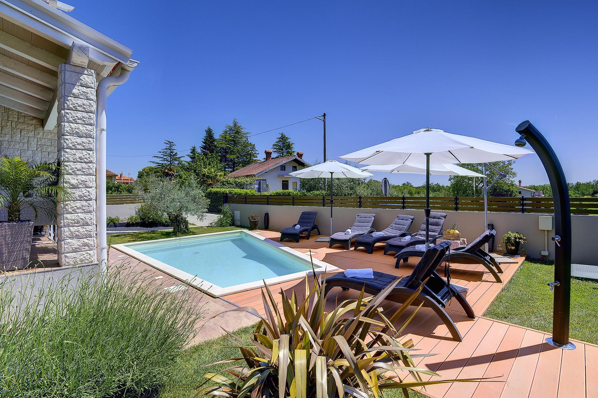 Har du nogensinde det? Se et hus i et levende blad og straks vil bo der? Det er nu midlertidigt muligt! Du bor i et moderne og stilfuldt indrettet feriehus. Dette smukke hus er omgivet af olivenlunde og marker med lavendel. Du vil bruge meget tid ved poolen, og børnene kan have det sjovt på glide eller gynger. Haven er fuldstændig lukket, så du har maksimal privatliv, mens du soler. Og der er en dejlig overdækket terrasse med grill. Villa Laura har et komfortabelt og frisk interiør og har aircondition. Der er tre soveværelser og tre badeværelser. ligger i landsbyen Krnica, kun 20 km væk fra den velkendte Pula. Det historiske centrum af Pula har flere meget interessante monumenter, såsom amfiteateret, og det er et sjovt sted at shoppe. Center, supermarked og restaurant inden for gåafstand. Strand og hav er 3 km væk.