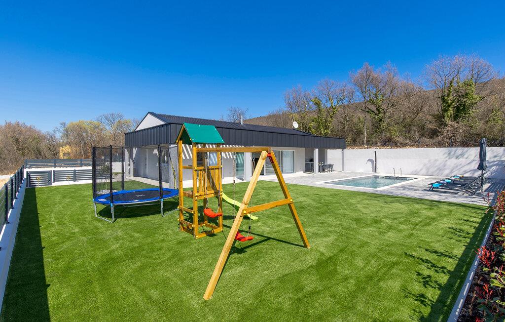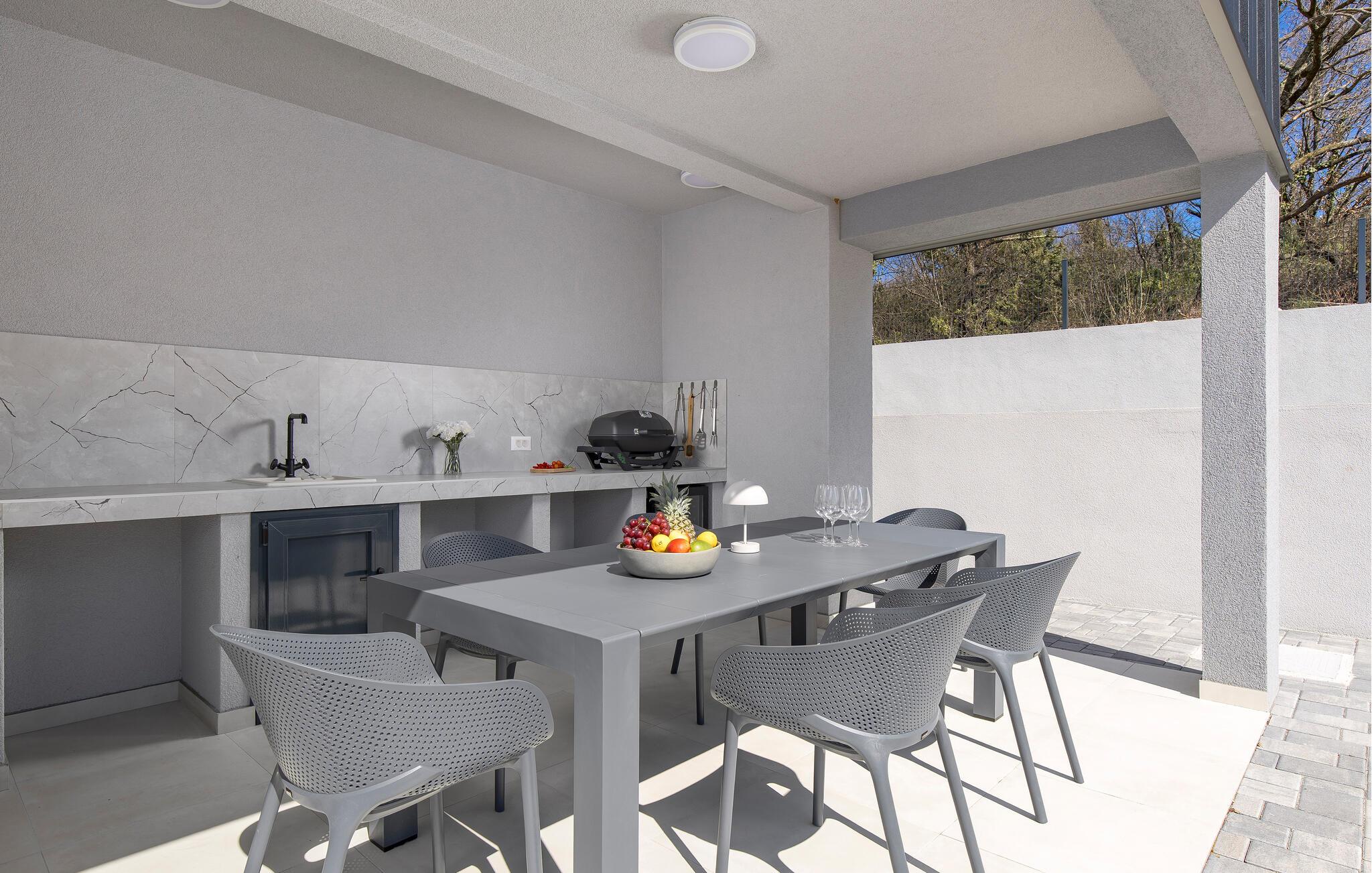 På den moderne terrasse kan I grille og tilberede lækre måltider i udekøkkenet. Slap af eller svøm i poolen, læs jeres yndlingsferieroman, eller hop på trampolinen – uanset jeres alder. Lyt til fårekyllingernes kvidren, når I afslutter dagen med et glas vin og måske en hyggelig grillfest.