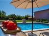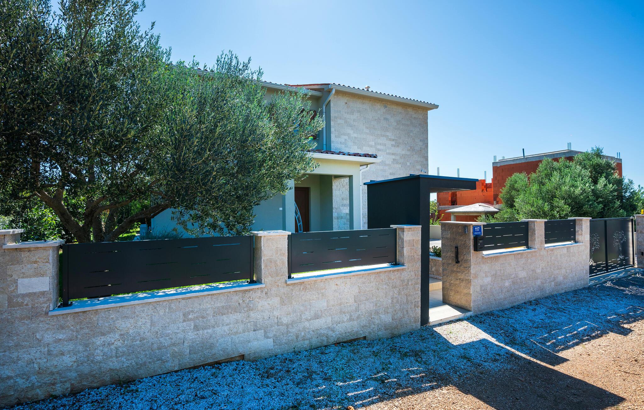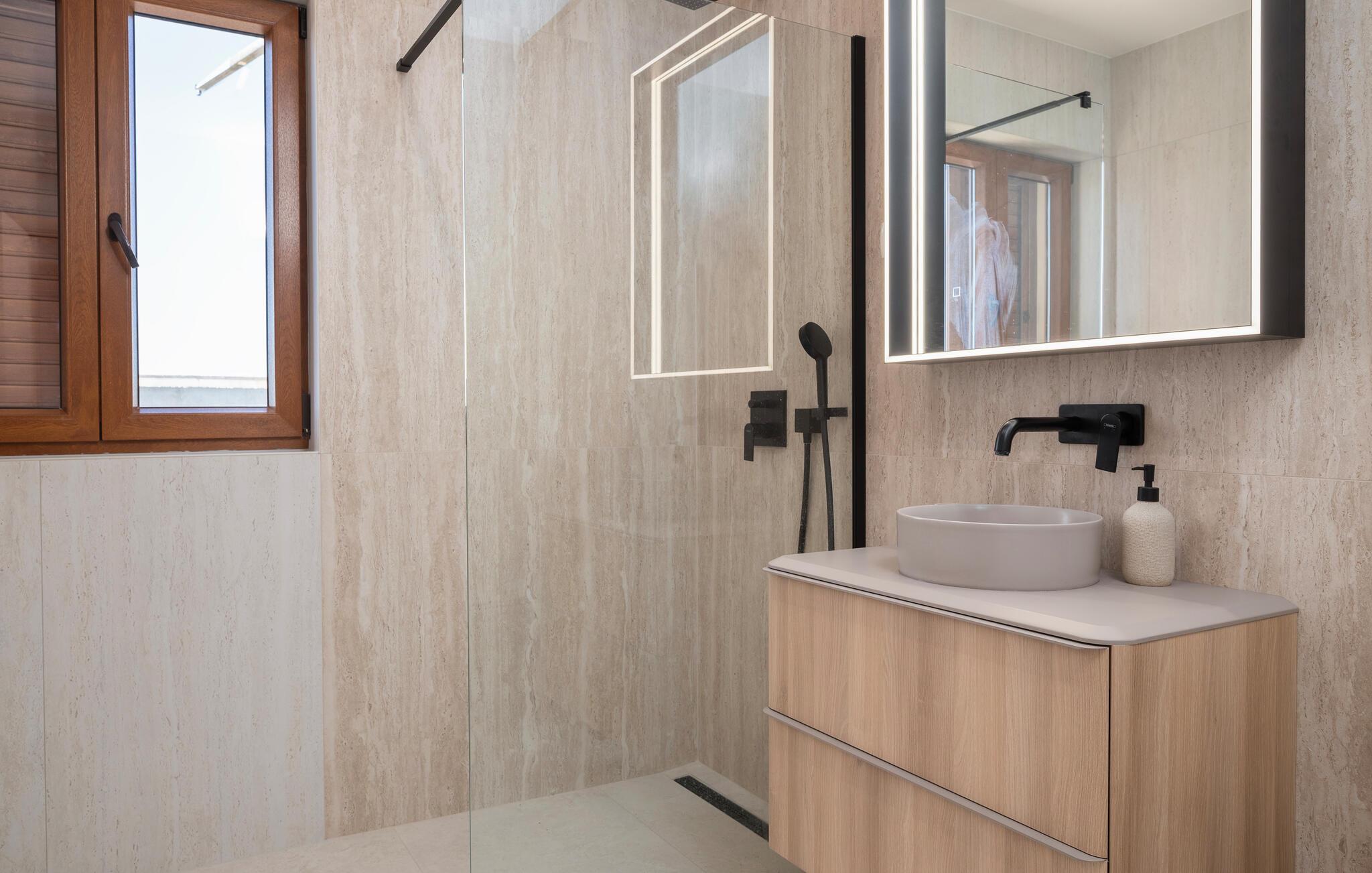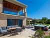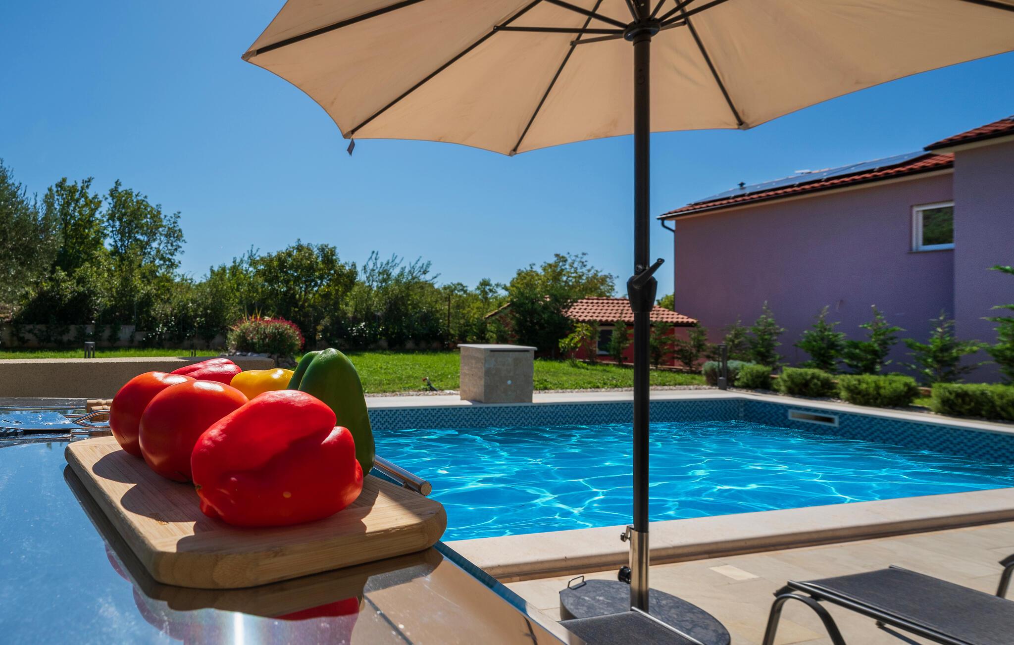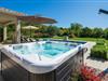 Åbn dørene til udendørsområdet og bliv betaget af rummeligheden. Dyk ned i den private pool eller slap af i det boblende spabad. Læg jer på liggestolene og nyd den varme middelhavssol. Lad blikket vandre over det grønne landskab og havet, og brug de komfortable siddeområder til et glas vin om aftenen eller en solid morgenmad udendørs.